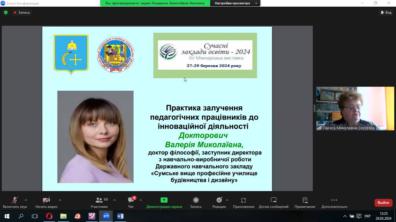• Докторович Валерія Миколаївна, доктор філософії, заступник директора з навчально-виробничої роботи Державного навчального закладу «Сумське вище професійне училище будівництва і дизайну» «Практика залучення педагогічних працівників до інноваційної діяльності»;