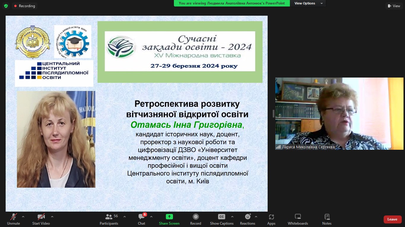 • Отамась Інна Григорівна, кандидат історичних наук, доцент, проректор з наукової роботи та цифровізації ДЗВО «Університет менеджменту освіти», доцент кафедри професійної і вищої освіти Центрального інституту післядипломної освіти, м. Київ «Ретроспектива розвитку вітчизняної відкритої освіти»;