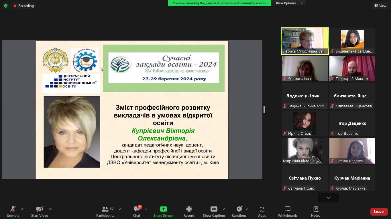 🔷 Івент модерувала Сергеєва Лариса Миколаївна, доктор педагогічних наук, професор, завідувач кафедри професійної і вищої освіти Центрального інституту післядипломної освіти ДЗВО «Університет менеджменту освіти», яка відкрила круглий стіл із виступом «Особливості організації професійного розвитку педагогічних і науково-педагогічних працівників».