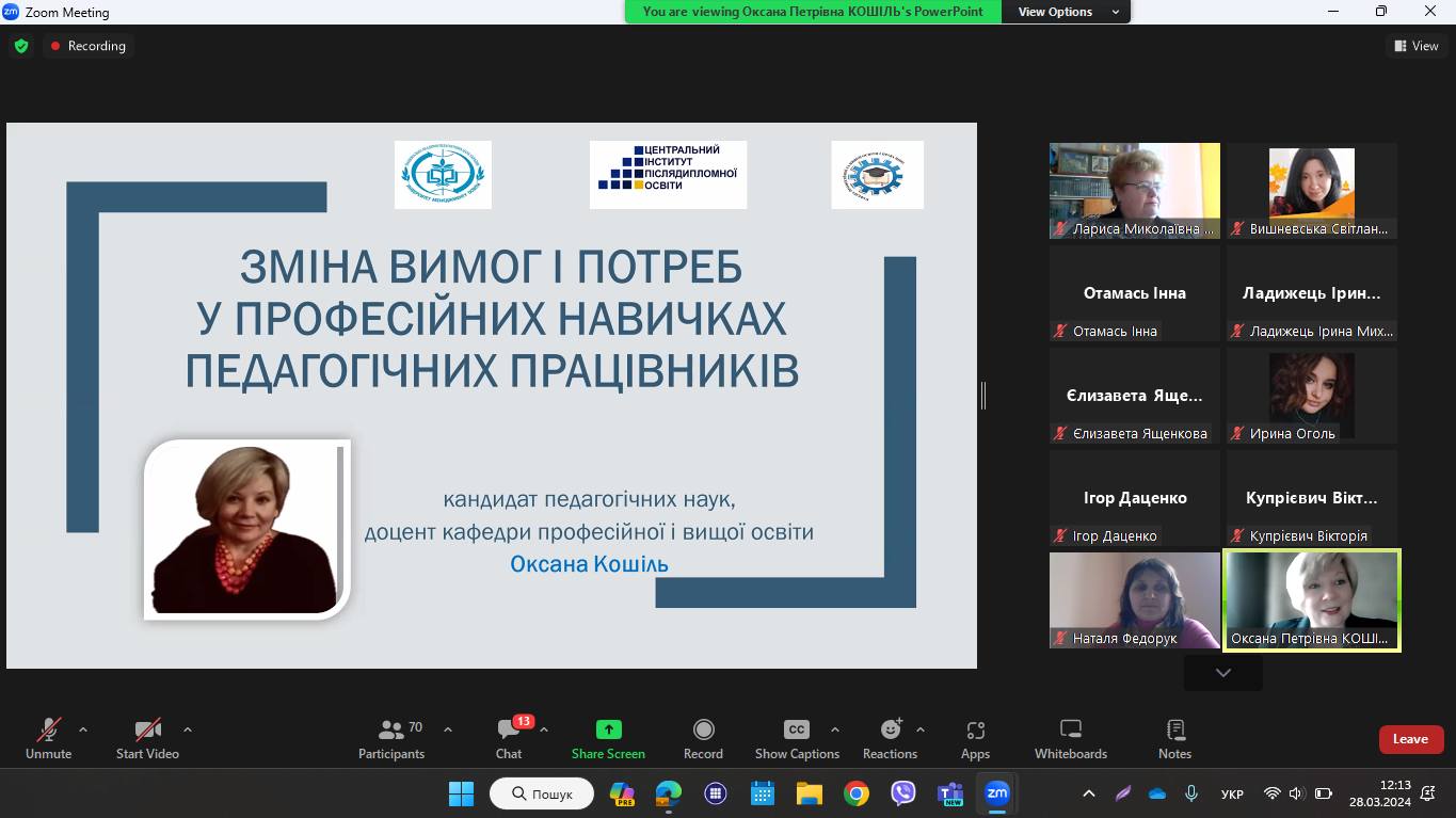 • Кошіль Оксана Петрівна, кандидат педагогічних наук, доцент кафедри професійної і вищої освіти ЦІПО ДЗВО Університет менеджменту освіти», м. Київ «Зміна вимог і потреб у професійних навичках педагогічних працівників»;