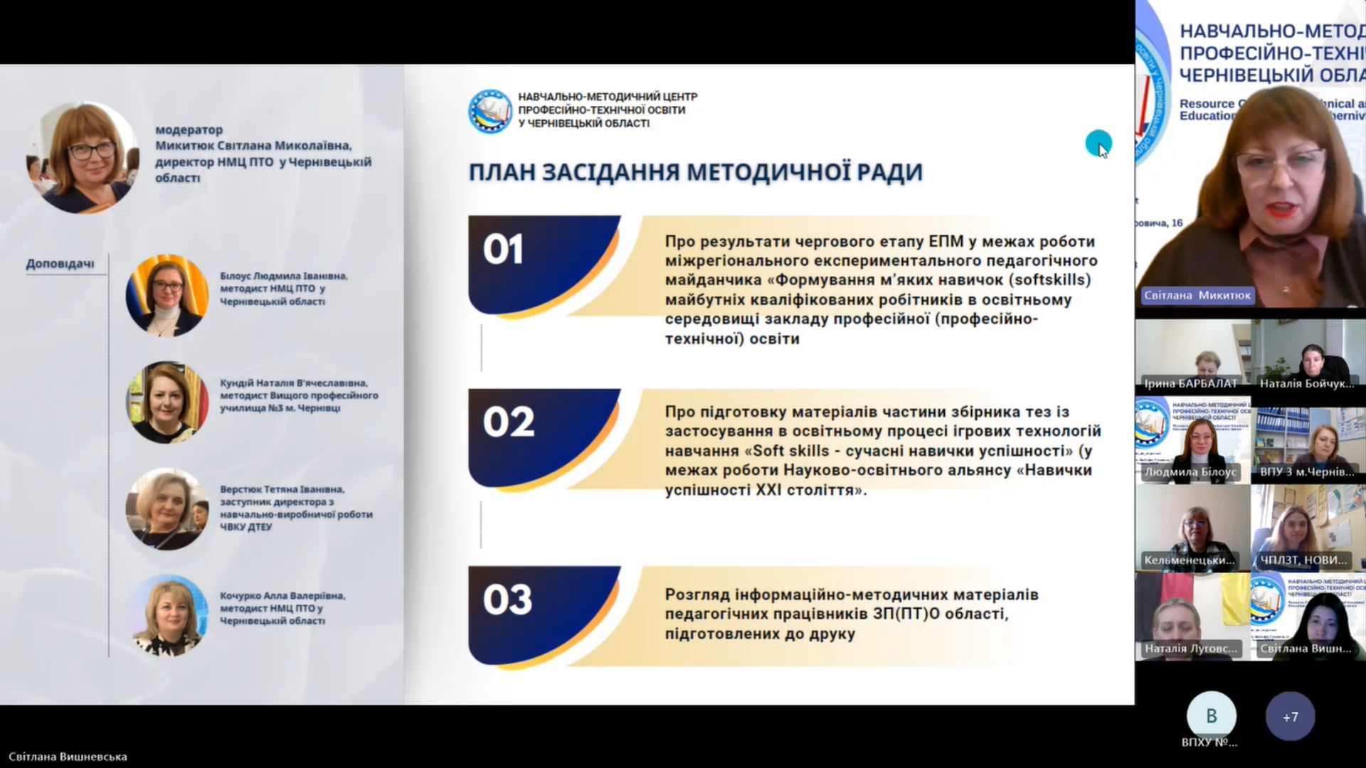 Засідання відкрила Світлана Микитюк, голова методичної ради, директор Навчально-методичного центру професійно-технічної освіти у Чернівецькій області, яка привітала всіх присутніх та ознайомила з порядком денним.
