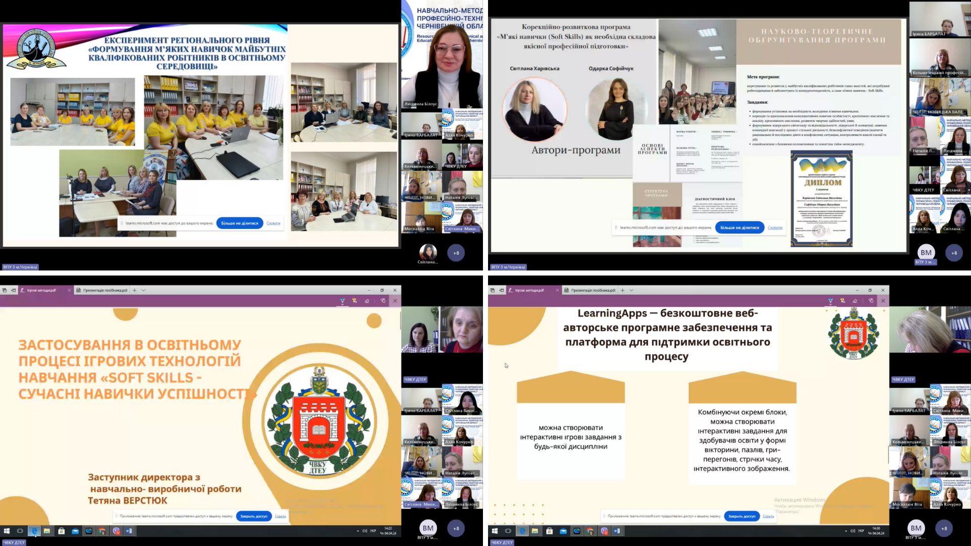 Про підготовку матеріалів частини збірника тез із застосування в освітньому процесі ігрових технологій навчання «Soft skills – сучасні навички успішності» (у межах роботи Науково-освітнього альянсу «Навички успішності ХХІ століття» розповіли Людмила Білоус, методист НМЦ ПТО у Чернівецькій області та співдоповідач Тетяна Верстюк, заступник директора з навчально-виробничої роботи ЧВКУ ДТЕУ. Педагогами закладу висвітлено та продемонстровано ігрові технології як сучасний напрямок засвоєння інформації та формування soft skills при підготовці конкурентоздатних фахівців ресторанного господарства, з показом відео елементів уроків виробничого навчання з впровадження означених технологій для формування професійних компетентностей кваліфікованих робітників з професії: “Кухар, кондитер”, у межах роботи Науково-освітнього альянсу «SOFT SKILLS – СУЧАСНІ НАВИЧКИ УСПІШНОСТІ».