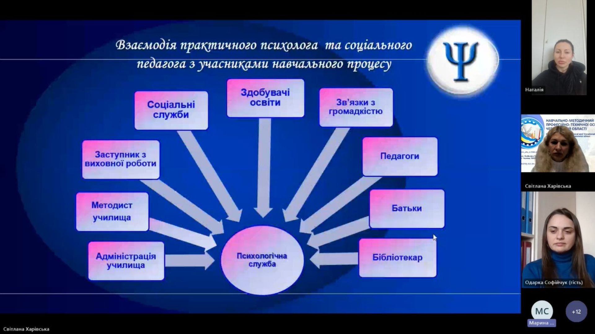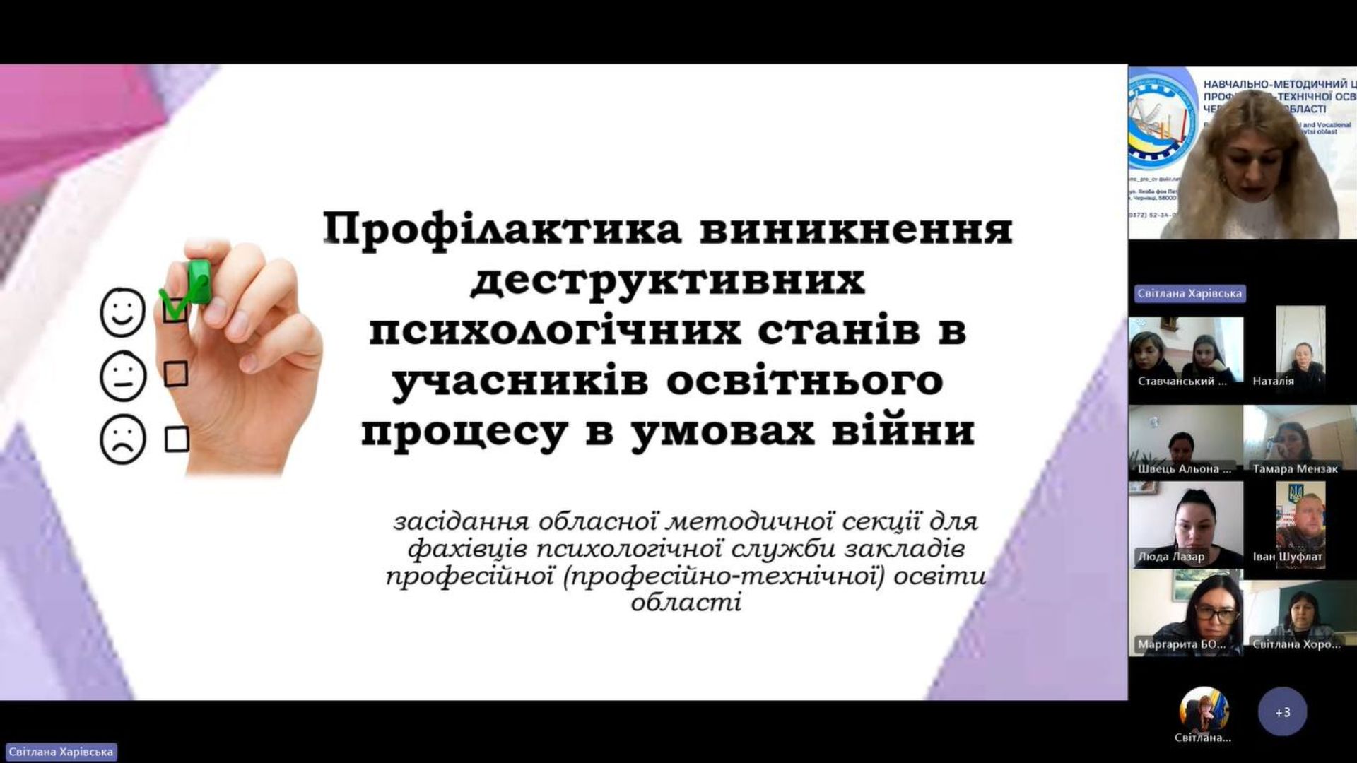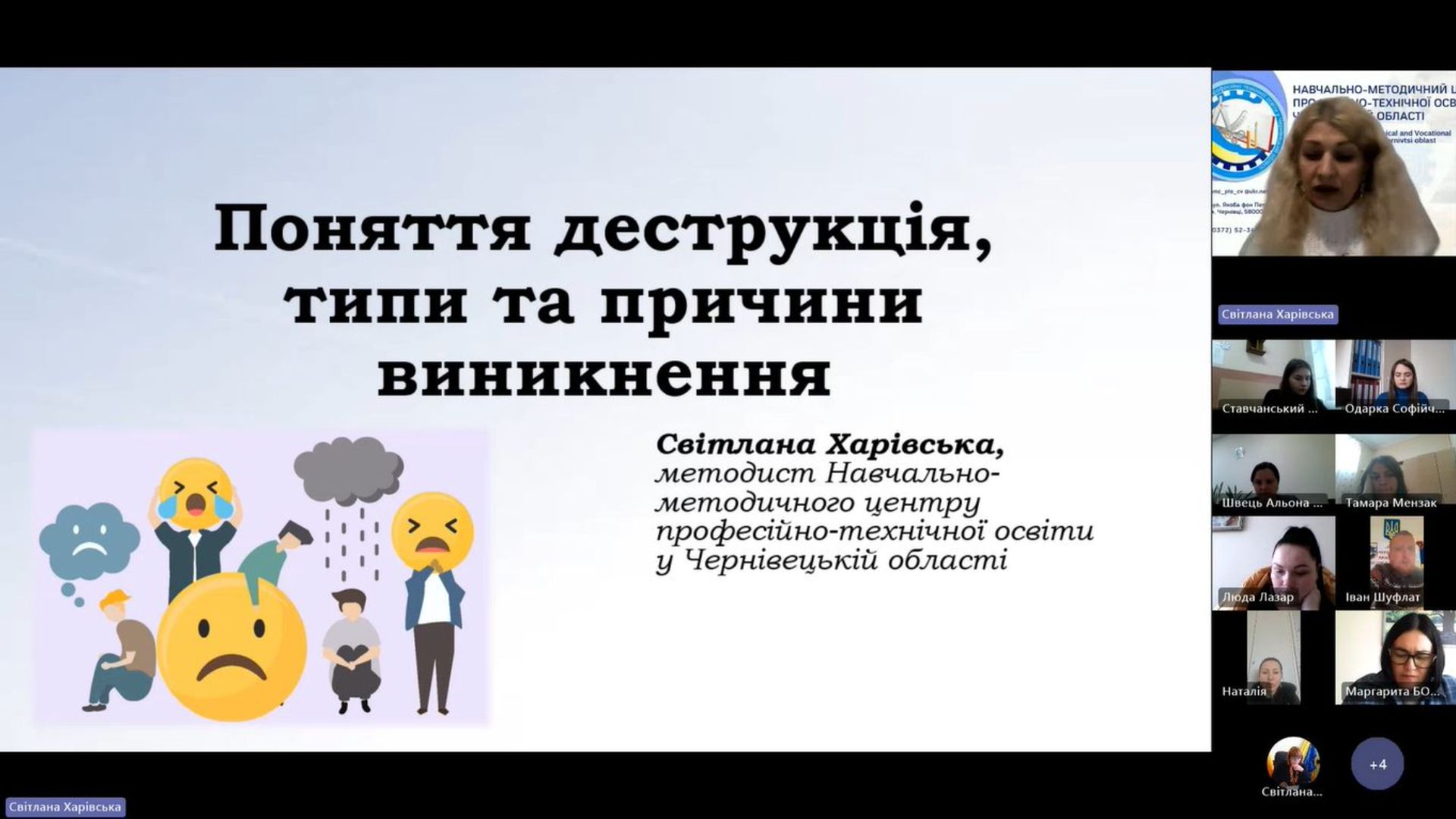 24 квітня 2024 року, відповідно до плану роботи Навчально-методичного центру професійно-технічної освіти у Чернівецькій області на 2024 рік, відбулося засідання секції практичних психологів та соціальних педагогів закладів професійної (професійно-технічної) освіти області «Профілактика виникнення деструктивних психологічних станів в учасників освітнього процесу в умовах війни».