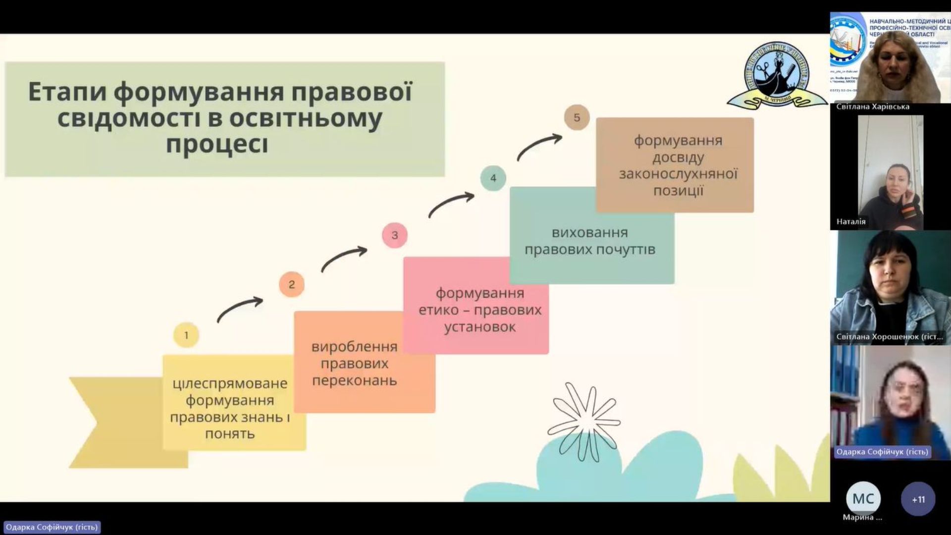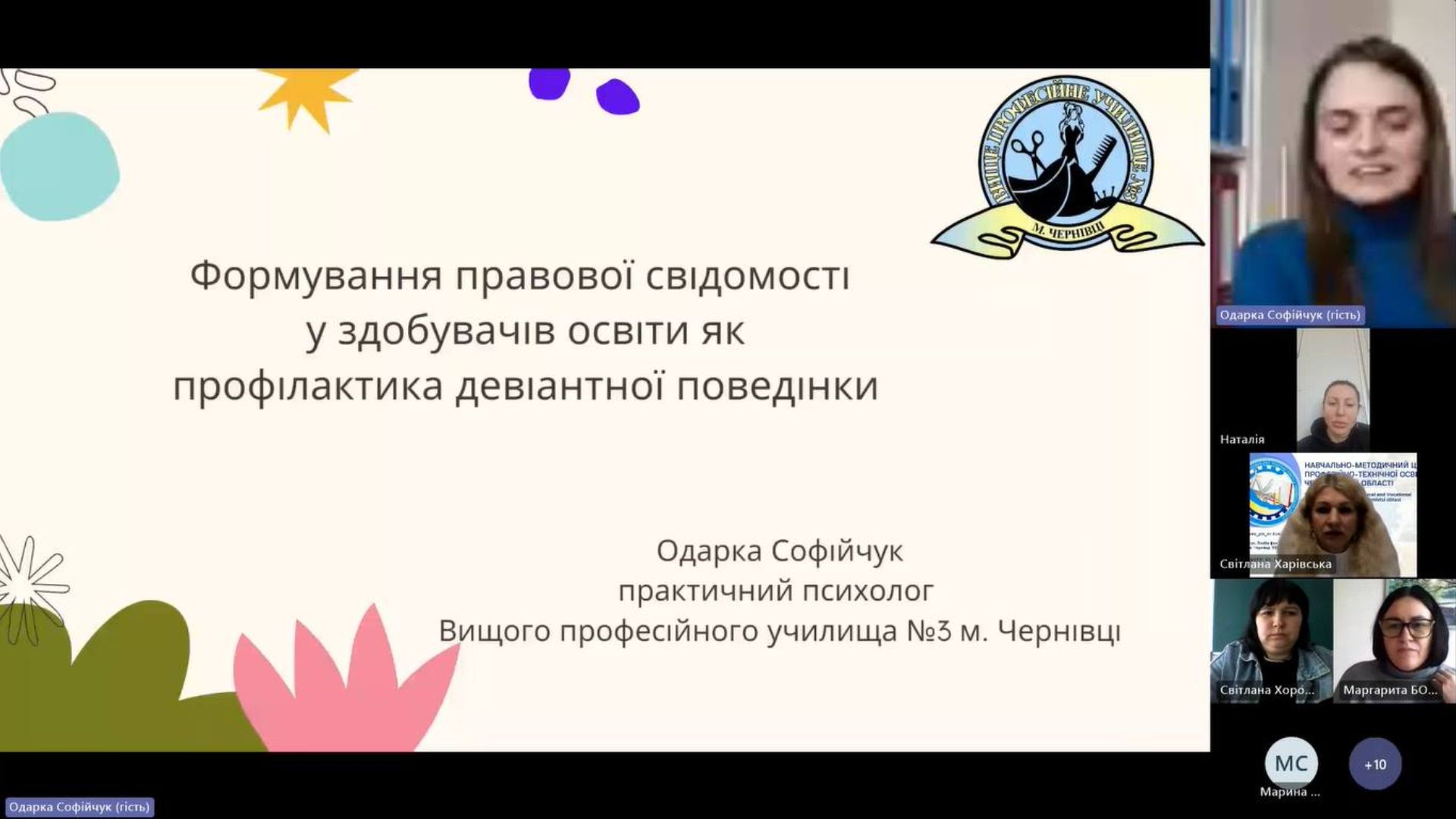 🔷 В ході засідання секції Одарка Софійчук, практичний психолог Вищого професійного училища №3 м. Чернівці поділилася досвідом «Формування правової свідомості у здобувачів освіти як профілактика девіантної поведінки».