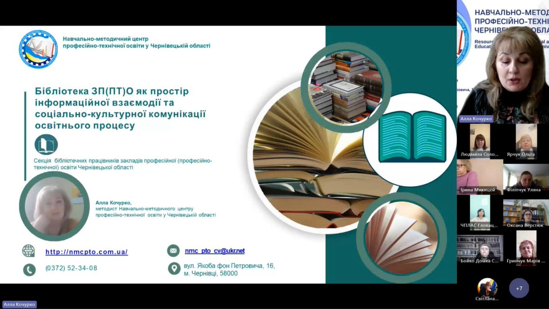 🔸 Основну частину продовжив виступ «Бібліотека ЗП(ПТ)О як простір інформаційної взаємодії та соціально-культурної комунікації освітнього процесу», який презентувала методист НМЦ ПТО у Чернівецькій області, Кочурко Алла Валеріївна.