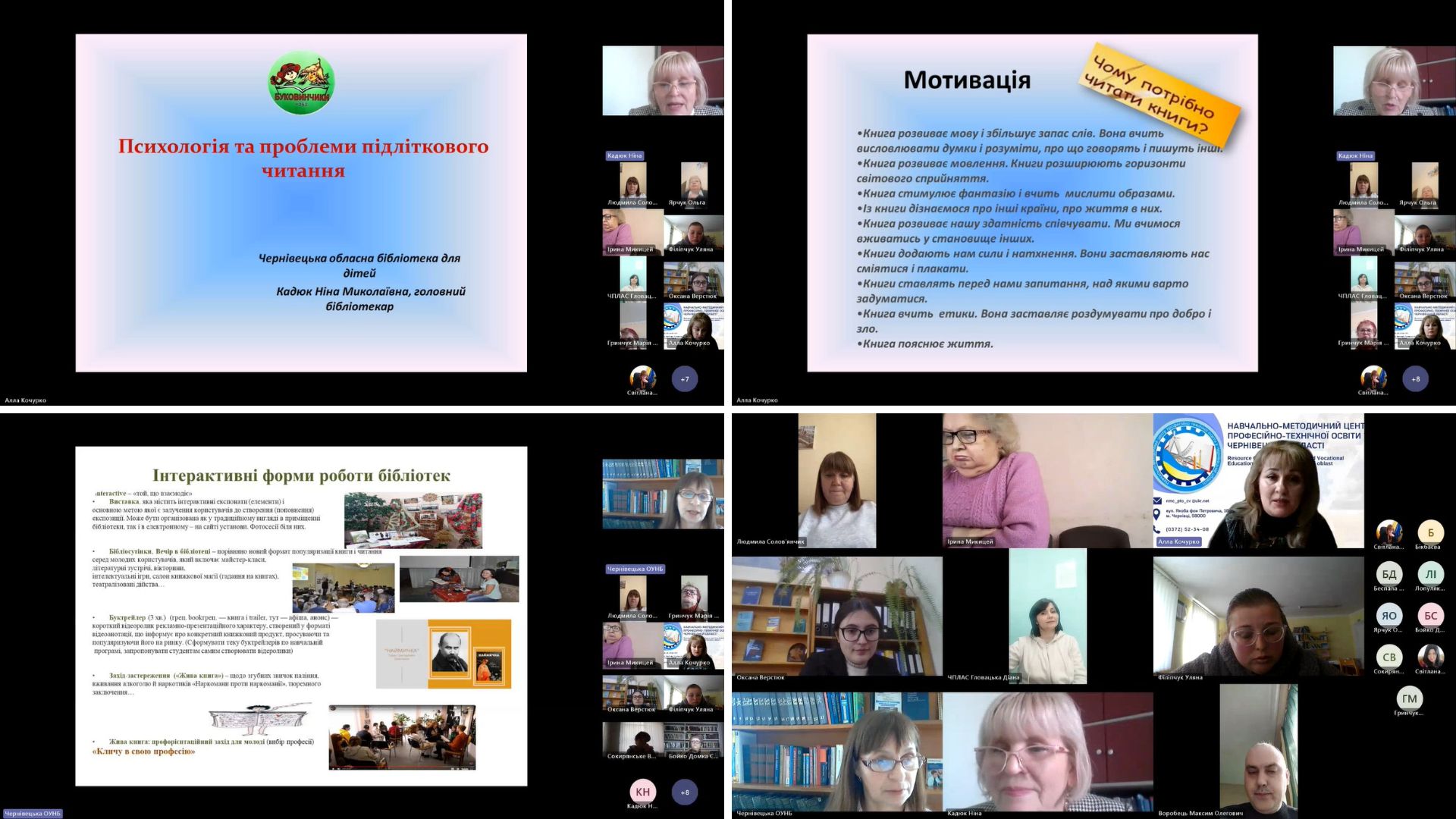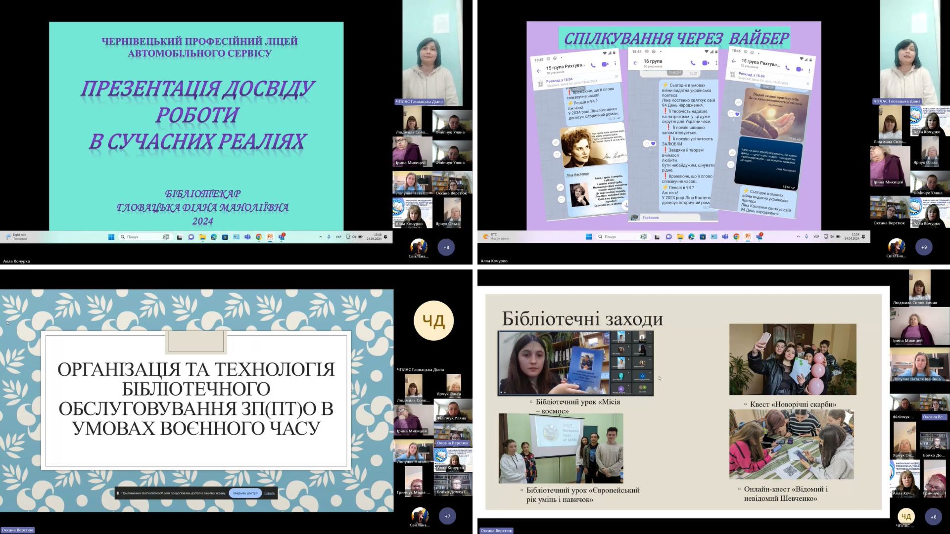 На виконання плану роботи Навчально-методичного центру професійно-технічної освіти у Чернівецькій області на 2024 рік, 24 квітня 2024 року в режимі онлайн відбулося засідання секції бібліотечних працівників ЗП(ПТ)О області «Ефективні засоби бібліотечної роботи в сучасних реаліях та розвиток компетентностей бібліотекарів для реалізації освітнього процесу в ЗП(ПТ)О».