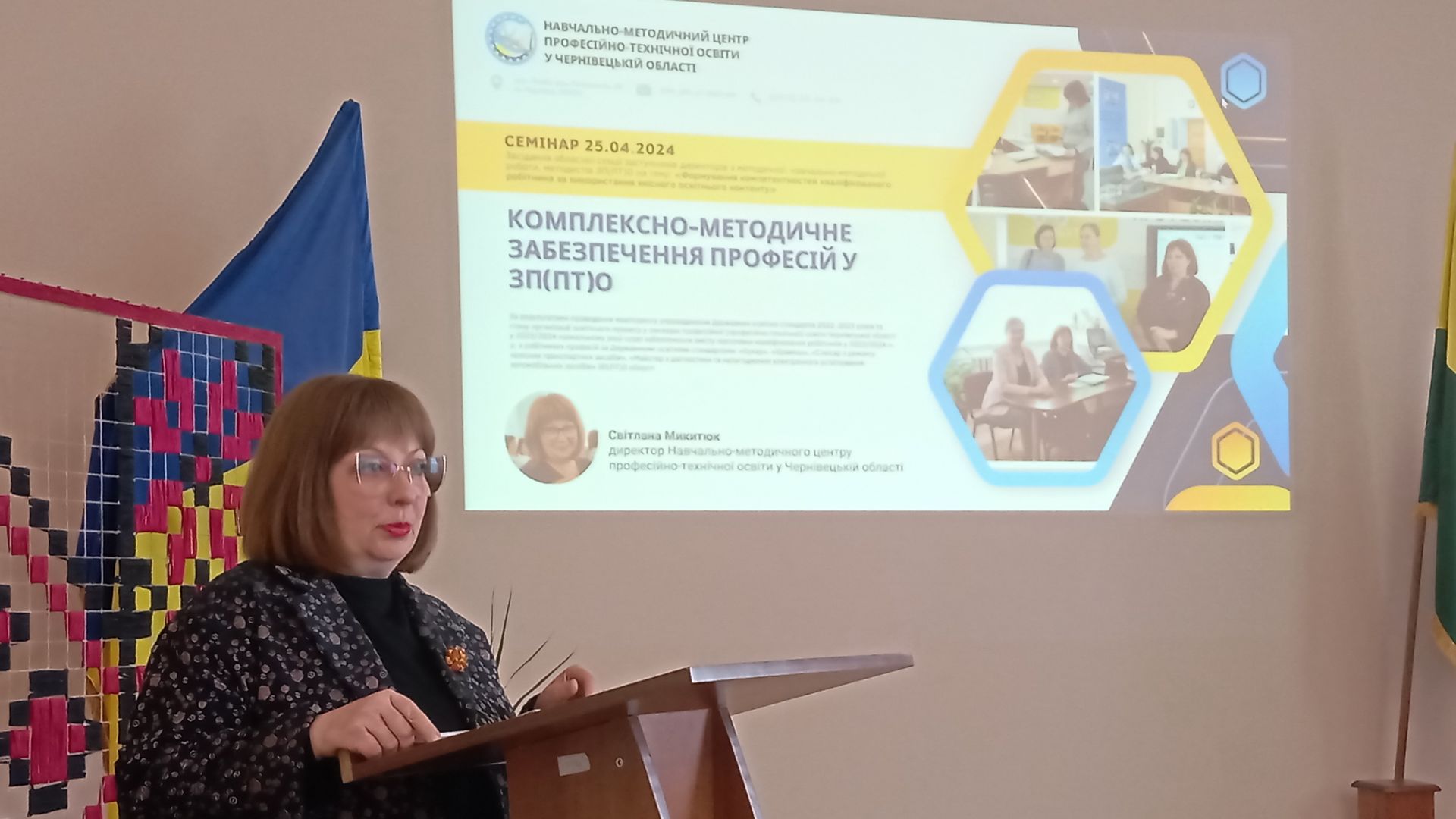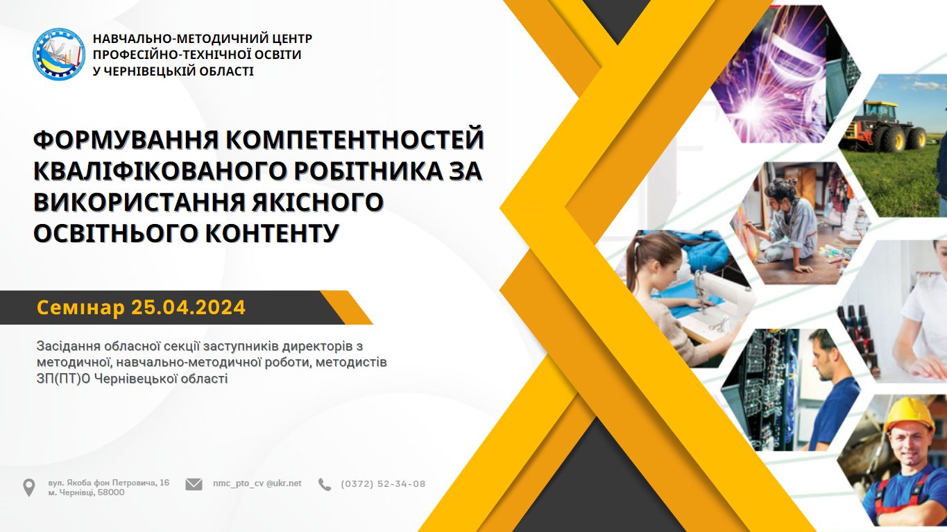 25 квітня 2024 року відповідно до спільного плану роботи Департаменту освіти і науки Чернівецької ОВА та НМЦ ПТО у Чернівецькій області на 2024 рік, згідно наказу ДОН ЧОВА від 15.04.2024 №127 «Про проведення семінару з теми: «Формування компетентностей кваліфікованого робітника за використання якісного освітнього контенту» проведено семінар у формі засідання обласної секції заступників директорів з методичної, навчально-методичної роботи, методистів закладів П(ПТ)О області за участі науковців кафедри професійної і вищої освіти Центрального інституту післядипломної освіти ДЗВО «Університет менеджменту освіти» НАПН України та запрошених заступників директорів з НВР окремих ЗП(ПТ)О.