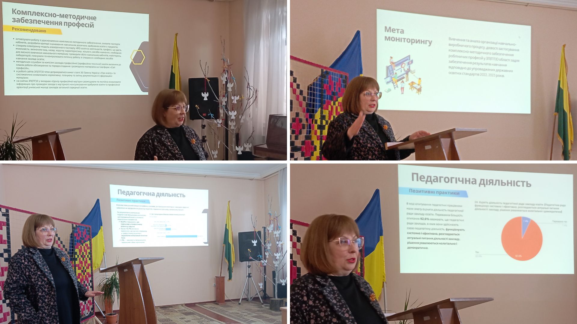 🔶 Світлана Миколаївна Микитюк, директор НМЦ ПТО у Чернівецькій області доповіла про комплексно-методичне забезпечення професій у ЗП(ПТ)О області у презентації узагальненої інформації щодо попередніх результатів моніторингу упровадження ДОС 2022, 2023 років, акцентувавши на позитивних практиках формування електронної бази КМЗ з професій у ЗП(ПТ)О області.