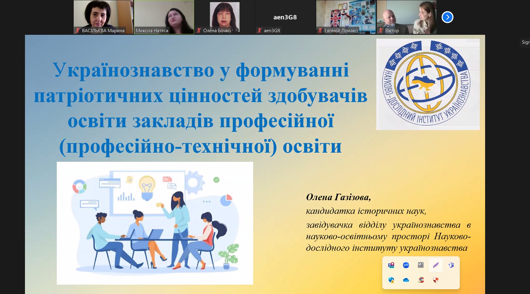 ВСЕУКРАЇНСЬКИЙ ВЕБІНАР «ШЛЯХИ ФОРМУВАННЯ НАЦІОНАЛЬНОЇ СВІДОМОСТІ ТА ВІЙСЬКОВО-ПАТРІОТИЧНИХ ЦІННОСТЕЙ У ЗДОБУВАЧВ ОСВІТИ ЗП(ПТ)О»