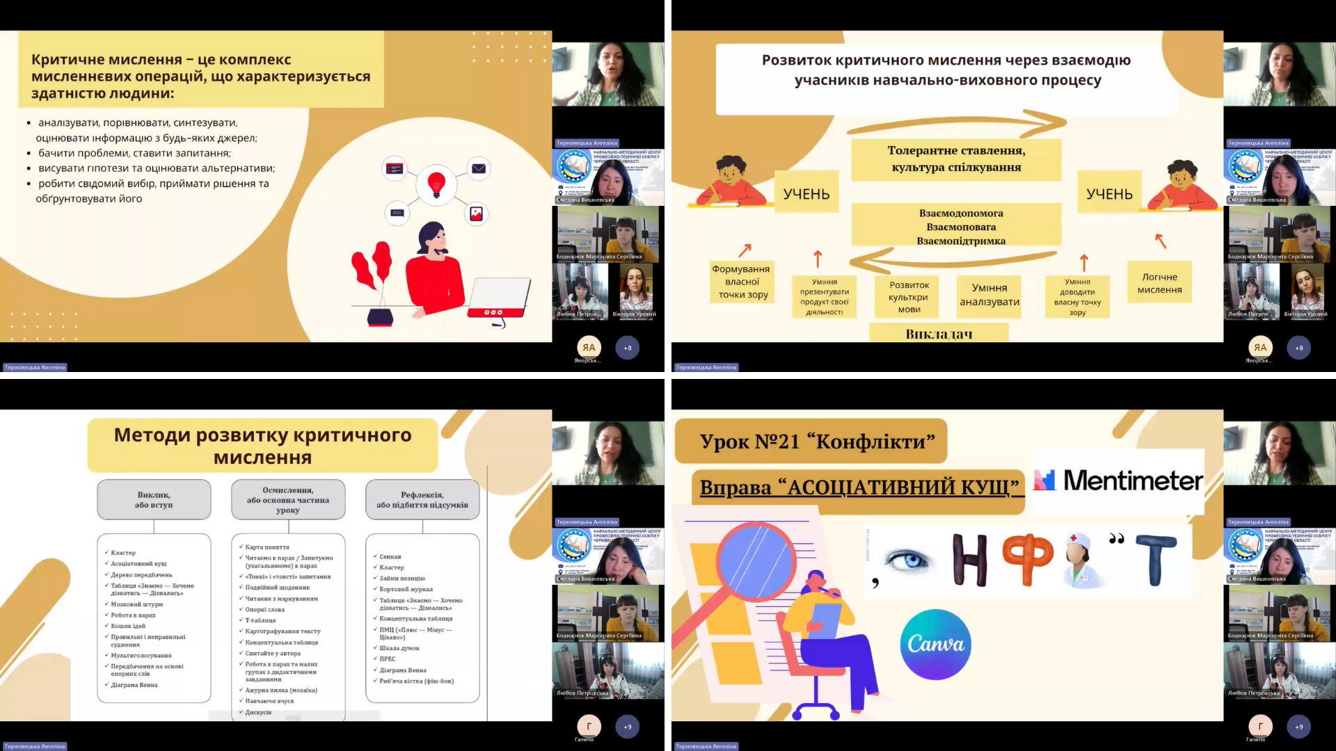 Відповідно до плану засідання у форматі коворкінгу було висвітлено питання використання методик розвитку критичного мислення у здобувачів освіти під час викладання історії та громадянської освіти у ЗП(ПТ)О.