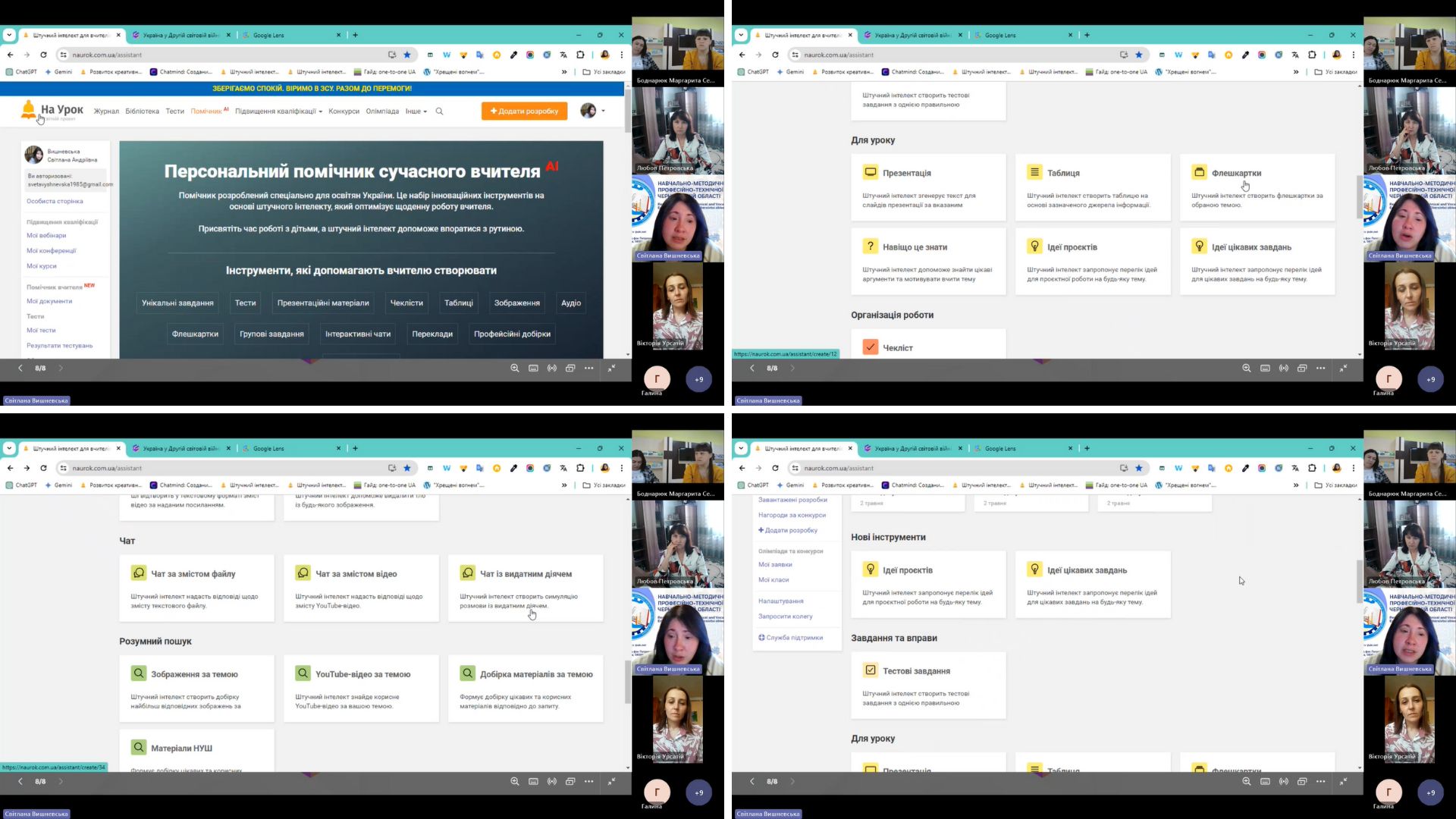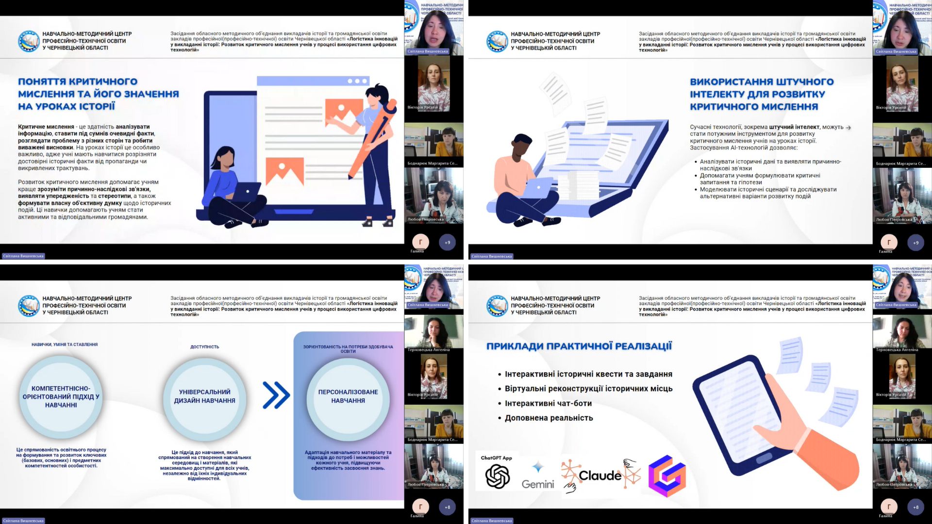 У своєму виступі «Використання штучного інтелекту та персоналізованого навчання для розвитку критичного мислення», методист НМЦ ПТО у Чернівецькій області, Світлана Вишневська, відзначила важливість сучасних технологій, зокрема штучного інтелекту, який можна використовувати, як інструмент для розвитку критичного мислення у здобувачів освіти. Вона проілюструвала ефективність роботи таких сервісів ШІ, як ChatGPT, Gemini, Claude AI та Gamma, і представила конкретні приклади завдань, що можуть сприяти розвитку креативного мислення учнів за допомогою генеративного інтелекту.