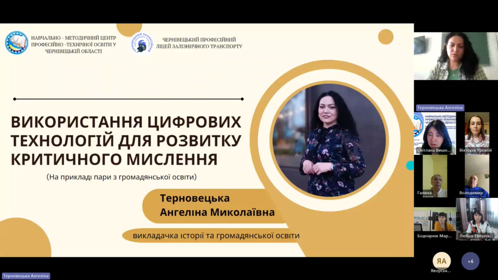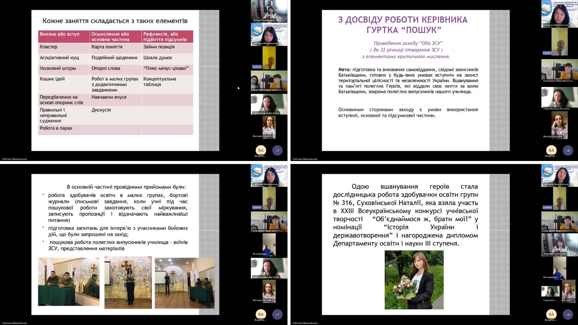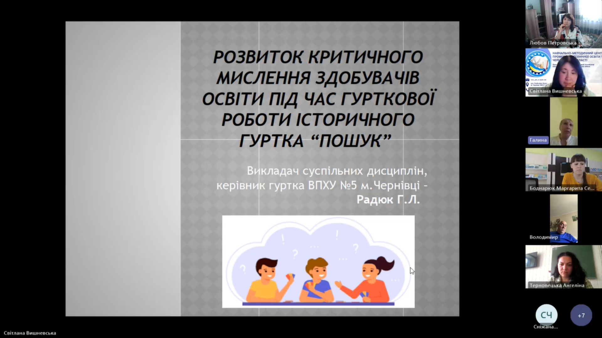 Радюк Галина Леонідівна, викладач суспільних дисциплін Вищого професійного художнього училища № 5 м.Чернівці, презентувала досвід формування критичного мислення у здобувачів освіти училища під час гурткової роботи. Зокрема, розповіла про форми та методи роботи такі, як проведення дискусій, історичних ігор, використання проблемно-орієнтованих завдань, пошук альтернативних поглядів, і використання їх у роботі гуртка «Пошук».