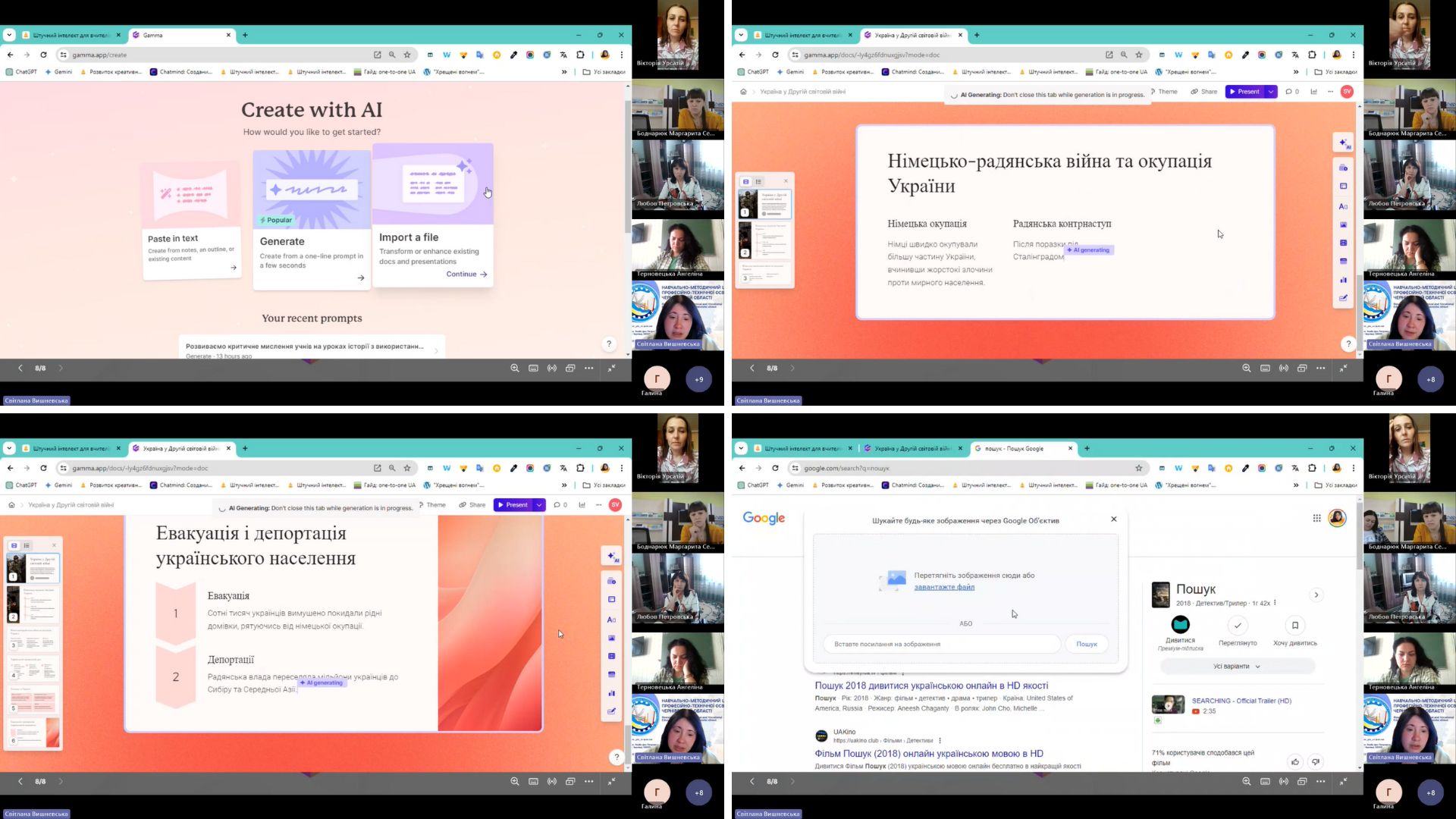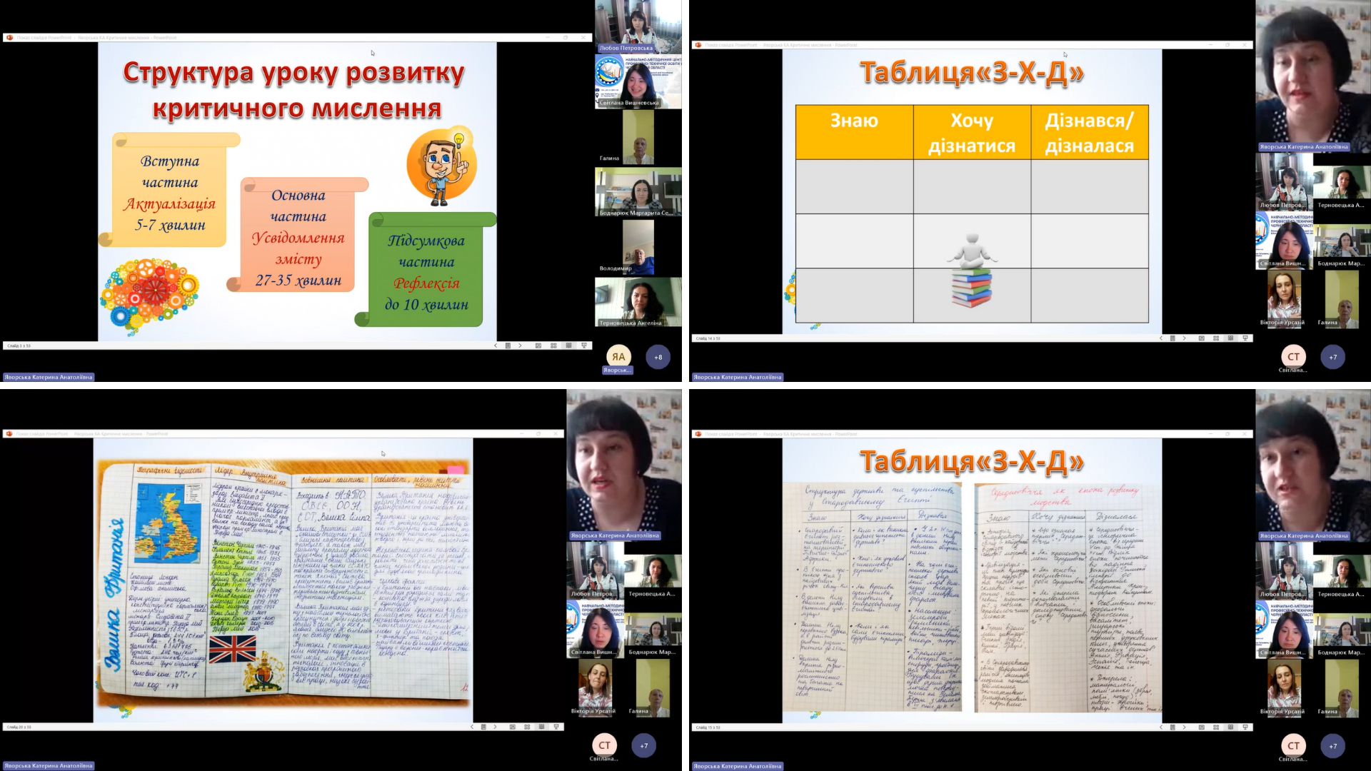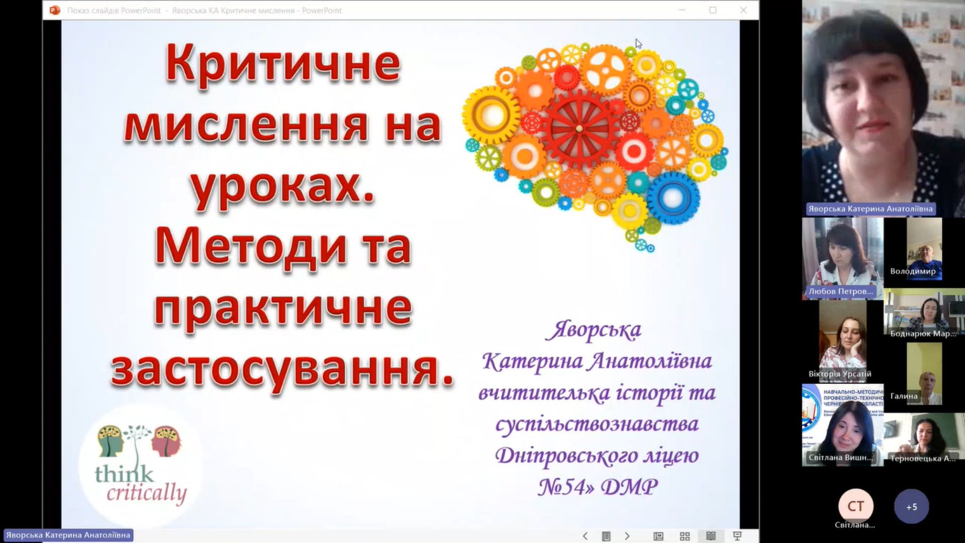 Радюк Галина Леонідівна, викладач суспільних дисциплін Вищого професійного художнього училища № 5 м.Чернівці, презентувала досвід формування критичного мислення у здобувачів освіти училища під час гурткової роботи. Зокрема, розповіла про форми та методи роботи такі, як проведення дискусій, історичних ігор, використання проблемно-орієнтованих завдань, пошук альтернативних поглядів, і використання їх у роботі гуртка «Пошук».