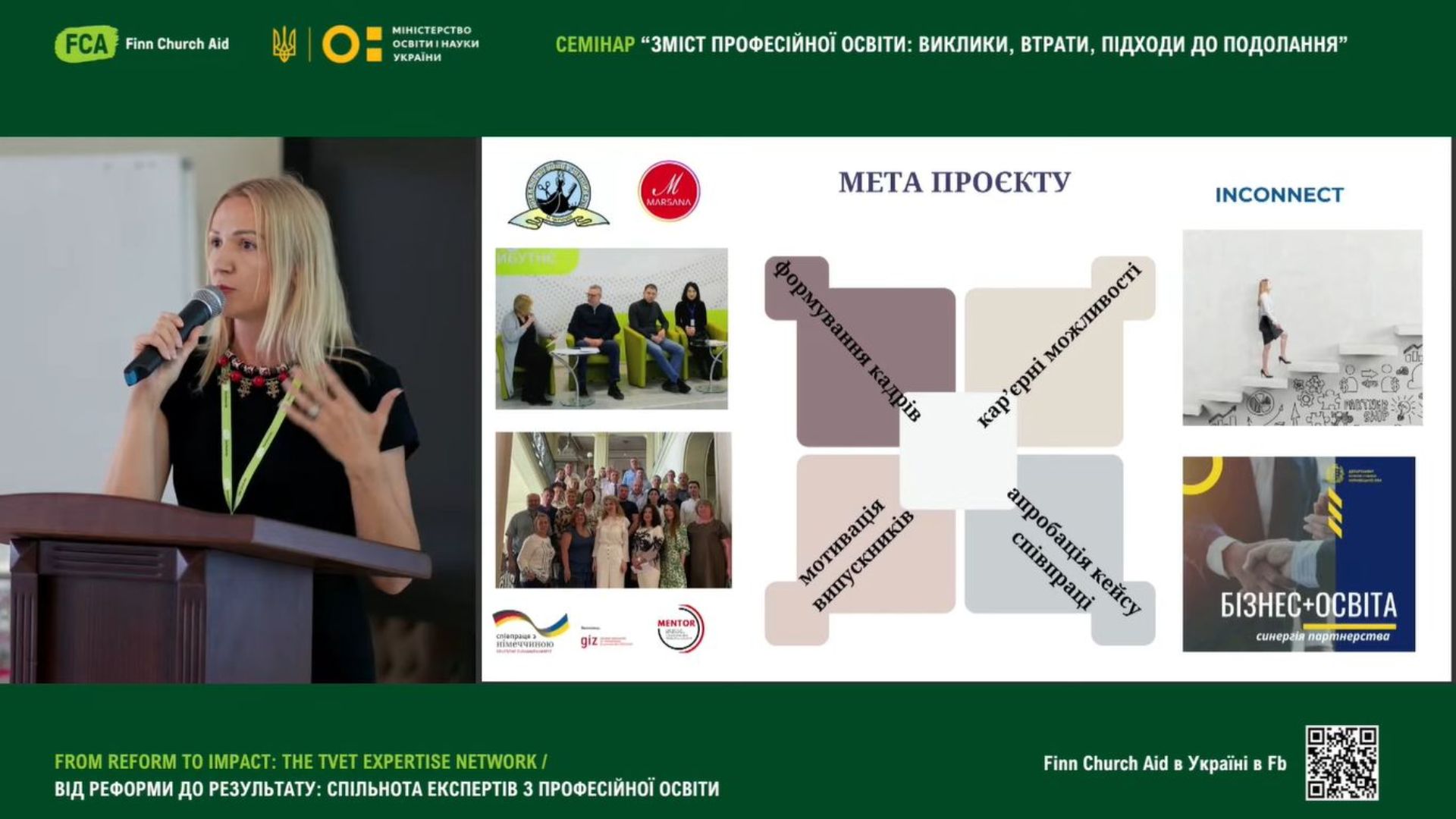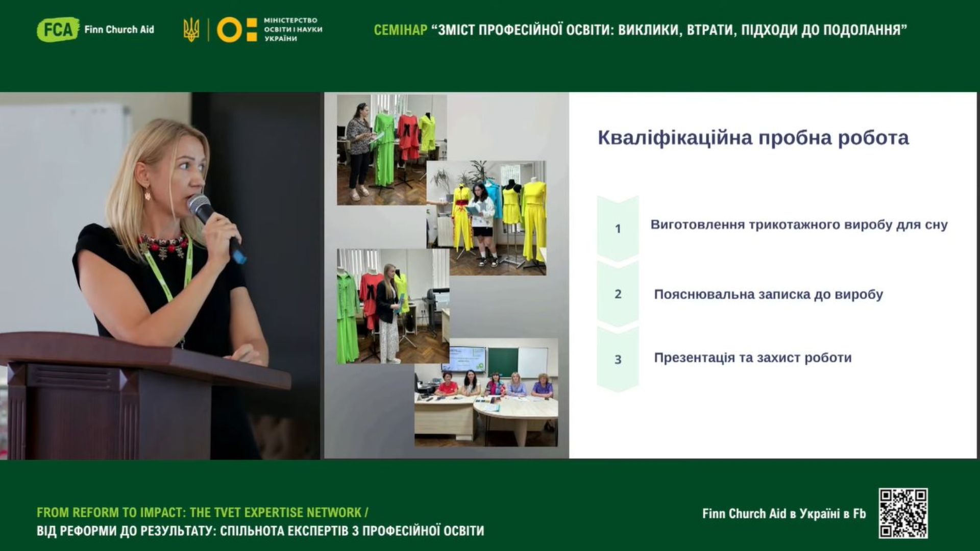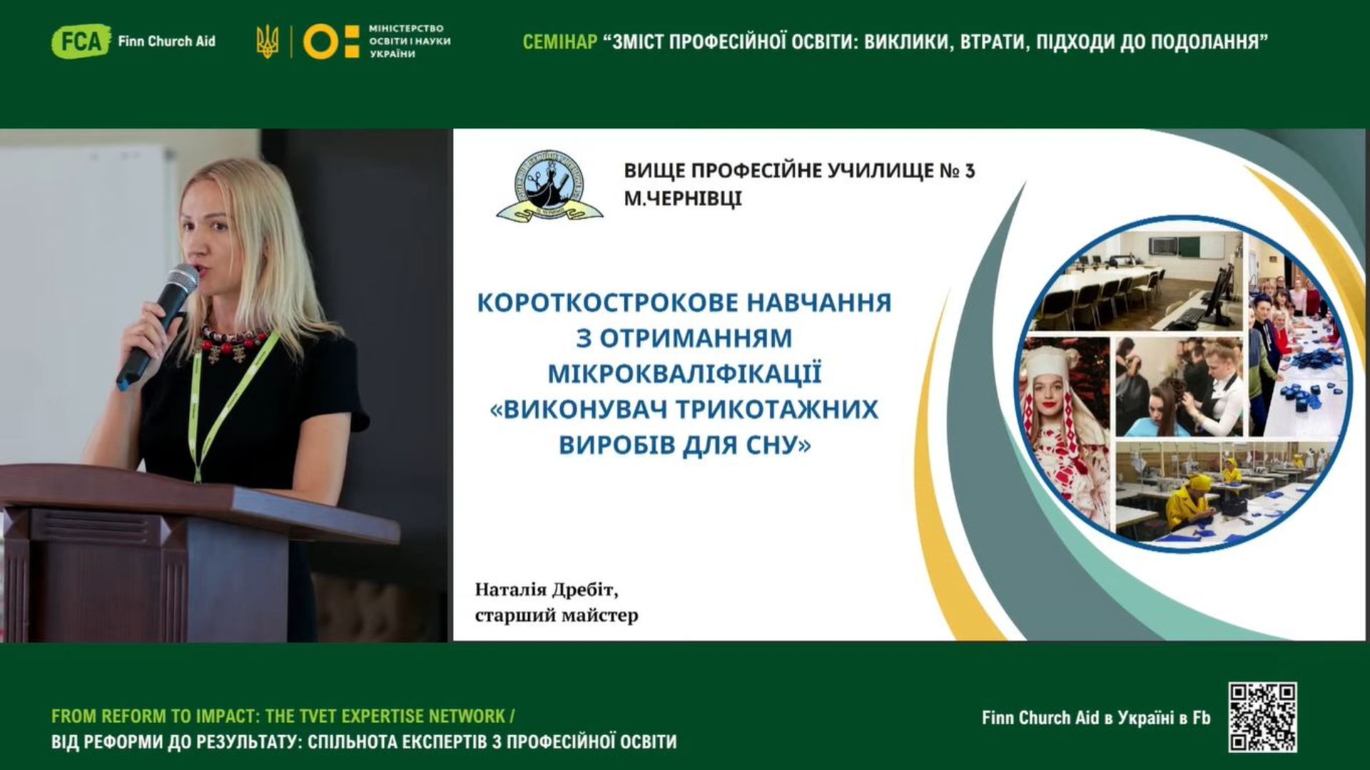 Наталія Дребіт, старший майстер Вищого професійного училища № 3 м. Чернівці, у своєму виступі «Короткострокове навчання з отриманням мікрокваліфікації «Виконувач трикотажних виробів для сну» презентувала досвід участі у проєкті InConnect та напрацювання програм для короткострокового навчання;
