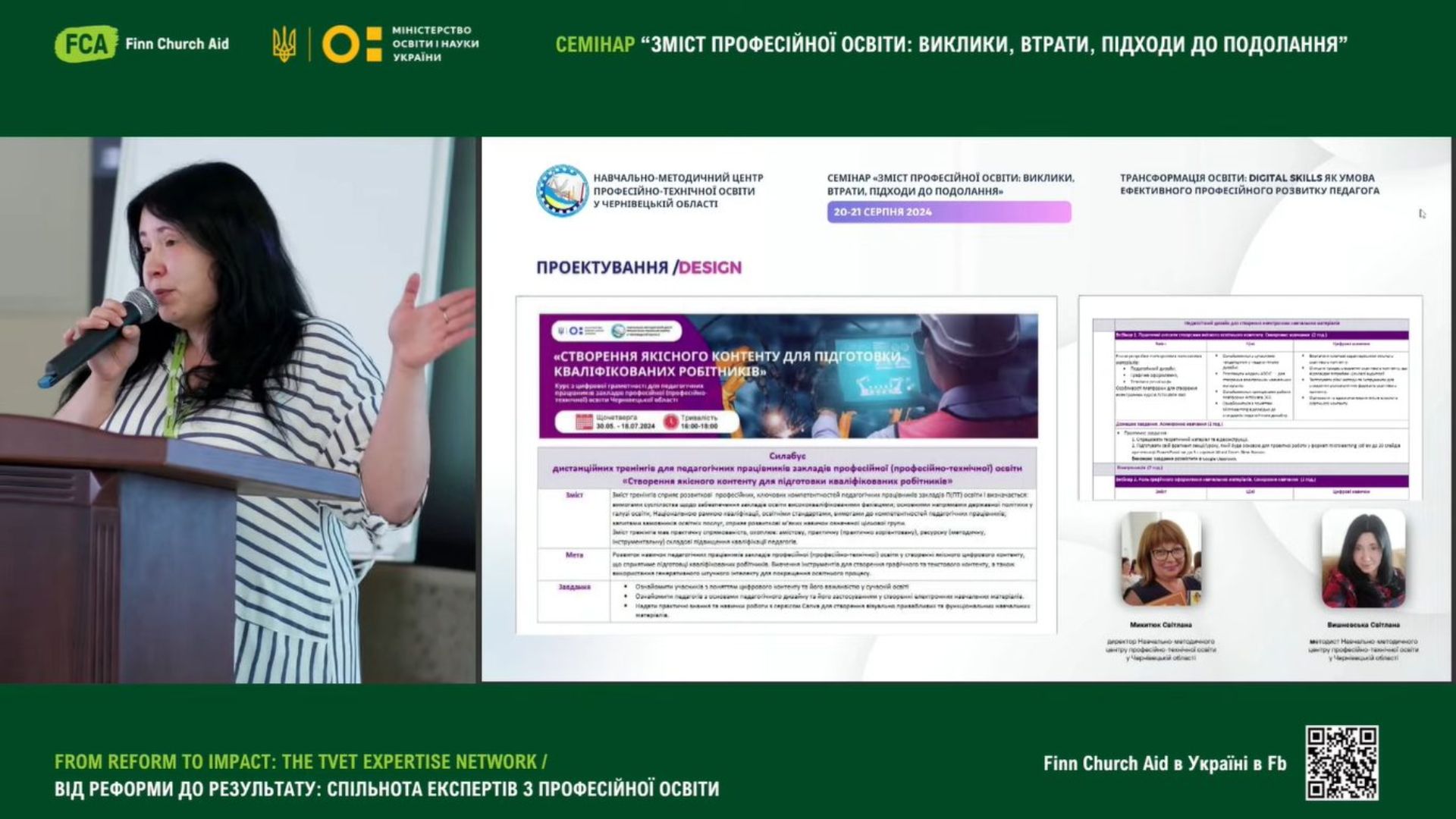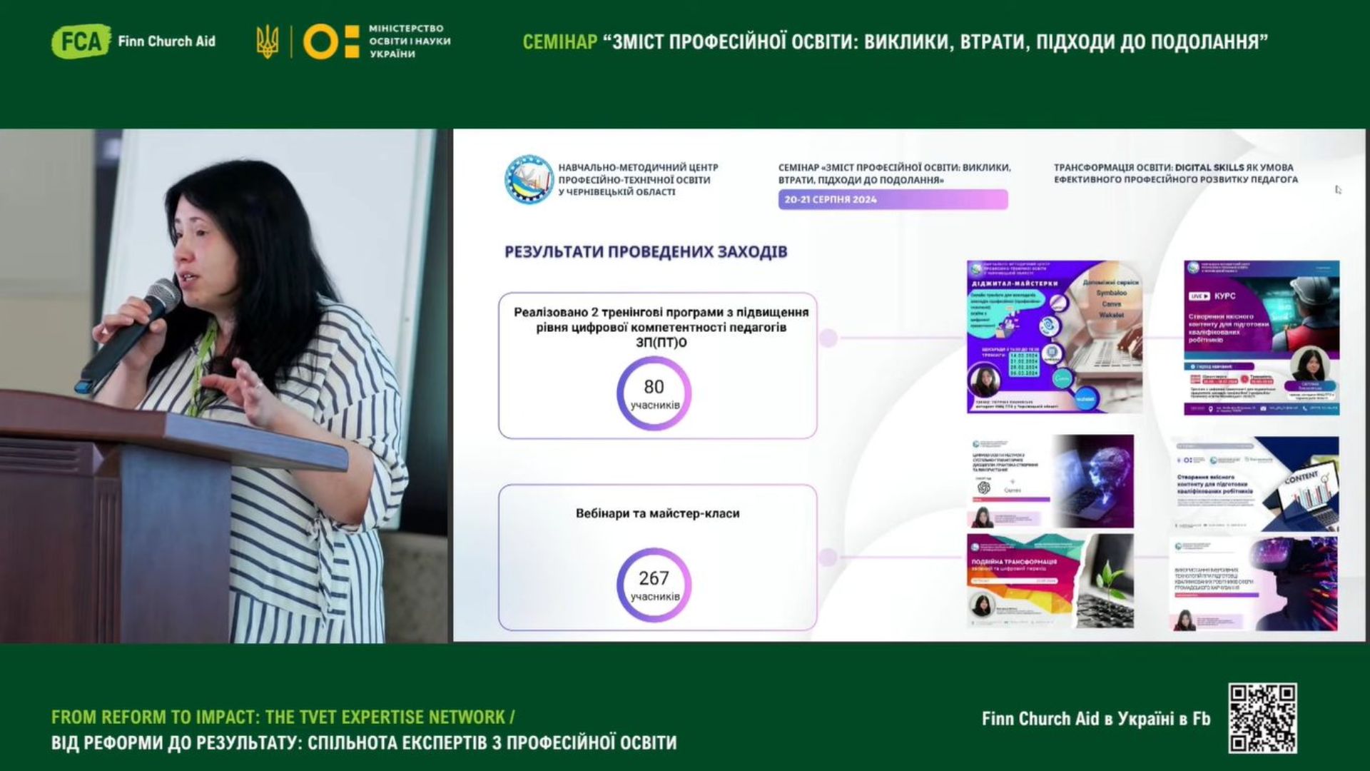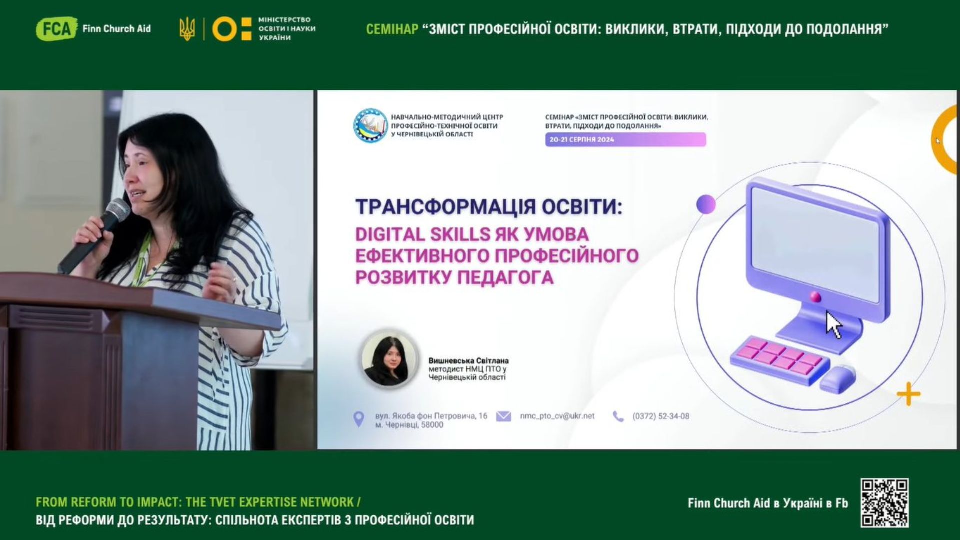 Світлана Вишневська, методист НМЦ ПТО у Чернівецькій області, у своїй доповіді «Трансформація освіти: Digital skills як умова ефективного професійного розвитку педагога», поділися досвідом організації тренінгів з цифрової грамотності та імплементацією набутих цифрових навичок в межах проєкту Skills4Recovery;