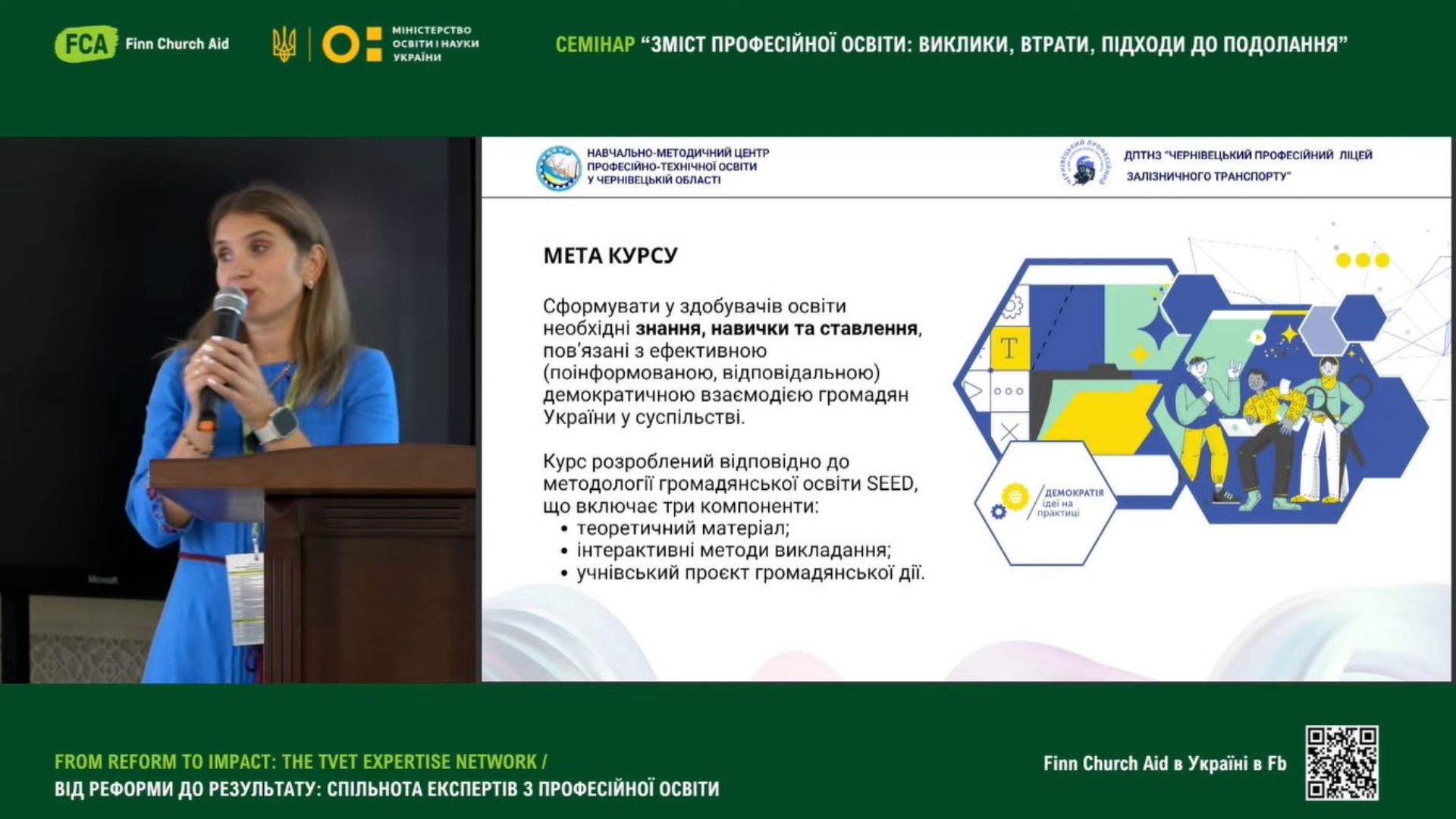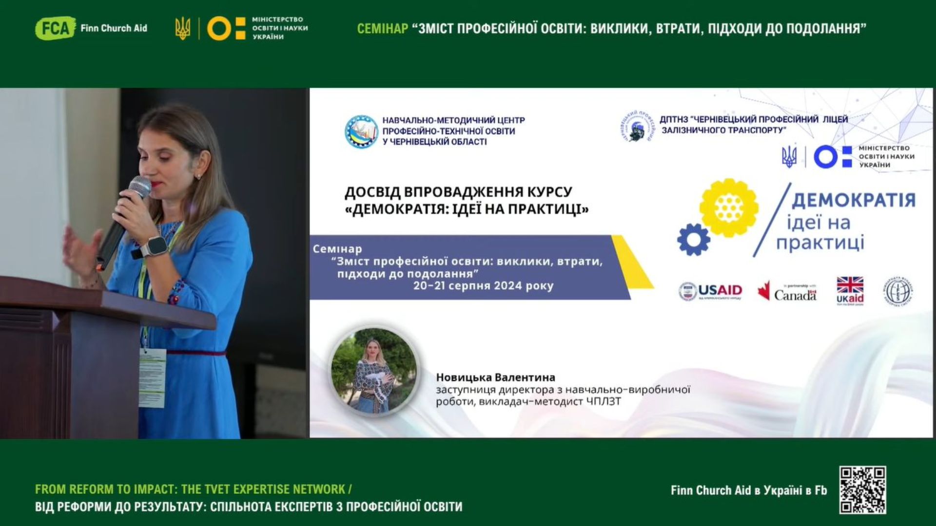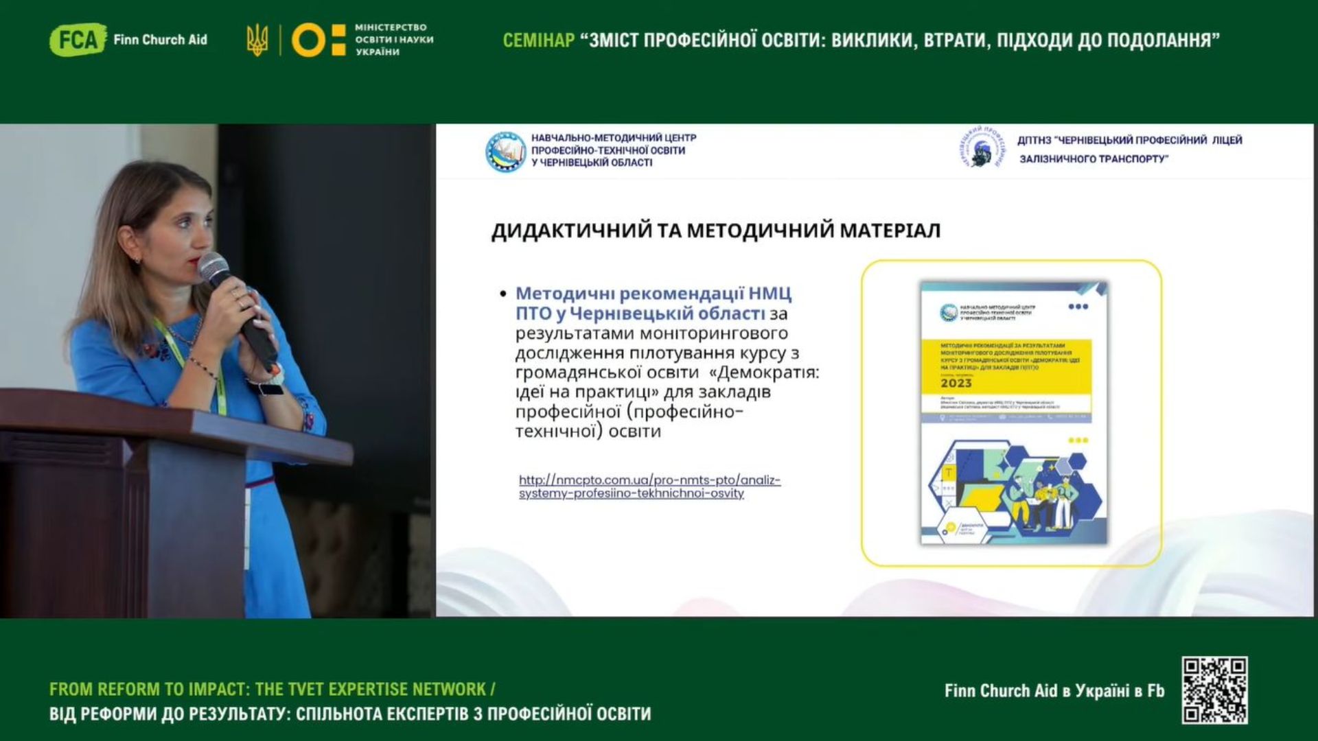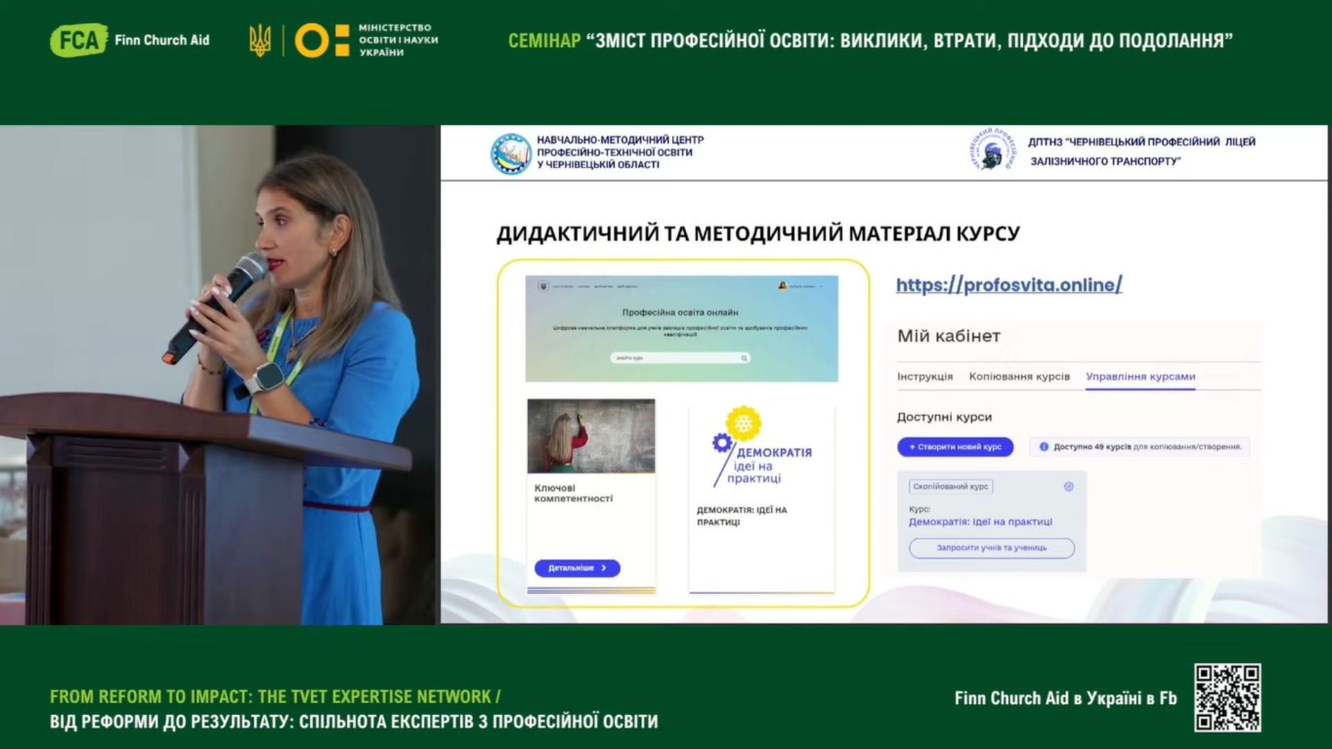 Світлана Вишневська, методист НМЦ ПТО у Чернівецькій області, у своїй доповіді «Трансформація освіти: Digital skills як умова ефективного професійного розвитку педагога», поділися досвідом організації тренінгів з цифрової грамотності та імплементацією набутих цифрових навичок в межах проєкту Skills4Recovery;
