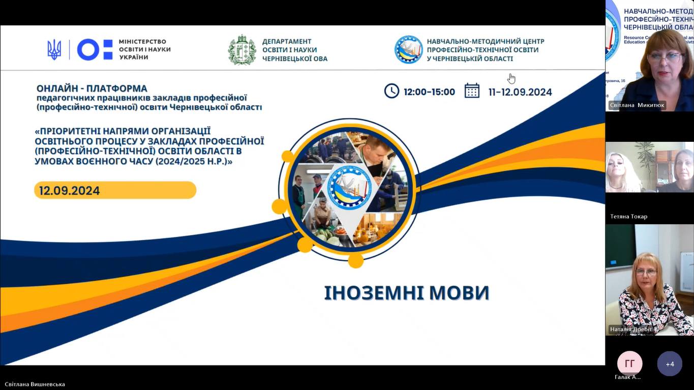 12 вересня 2024 року в межах онлайн-платформи педагогічних працівників закладів професійної (професійно-технічної) освіти Чернівецької області «Пріоритетні напрями організації освітнього процесу у закладах професійної (професійно-технічної) освіти області в умовах воєнного часу (2024/2025 н.р.)» відбулася обласна інструктивно-методична нарада для викладачів іноземної мови, іноземної мови за професійним спрямуванням закладів П(ПТ)О.