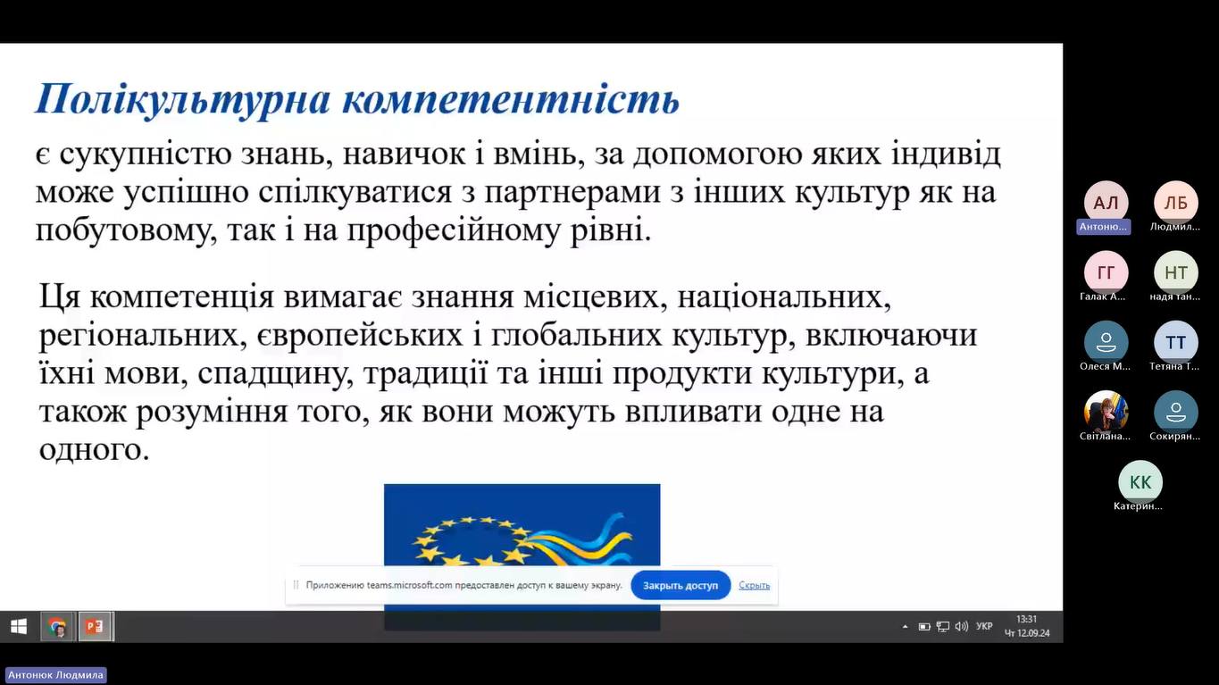 У нараді взяла участь, Людмила Антонюк, старший викладач кафедри професійної і вищої освіти Центрального інституту післядипломної освіти ДЗВО «Університет менеджменту освіти НАПН України, яка представила доповідь на тему «Полікультурна освіта - необхідний аспект євроінтеграції України».