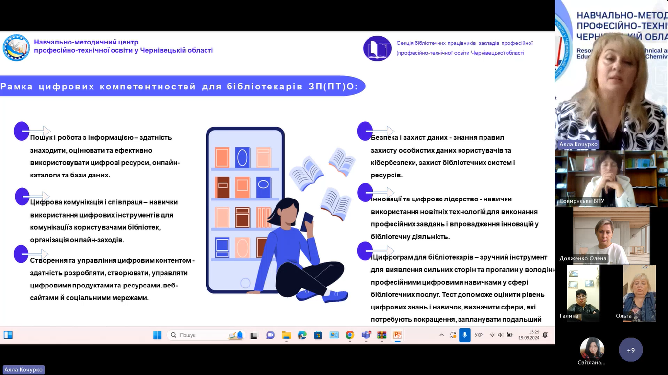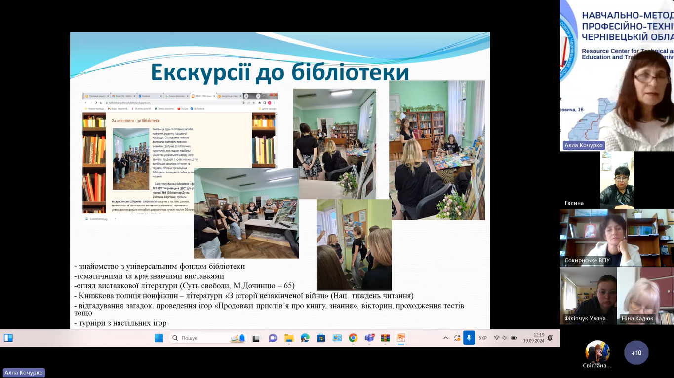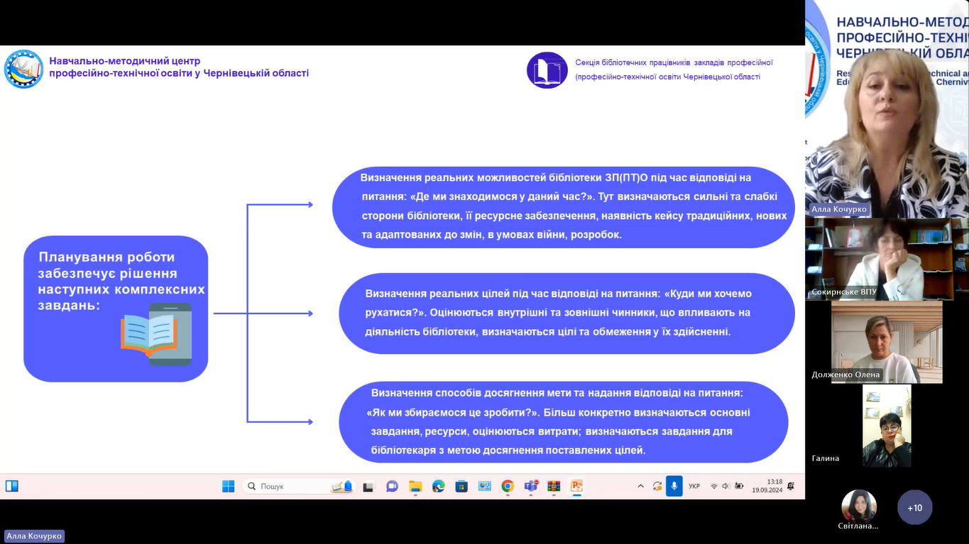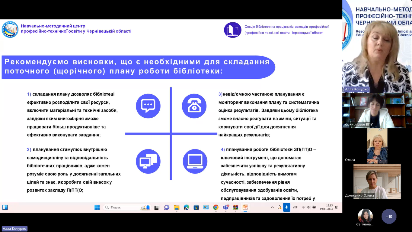 Основна увага була зосереджена також на «Особливостях організації бібліотечної роботи ЗП(ПТ)О області в умовах воєнного часу на 2024/2025 н.р.», про які розповіла методист НМЦ ПТО у Чернівецькій області Кочурко Алла Валеріївна.