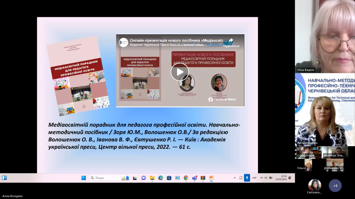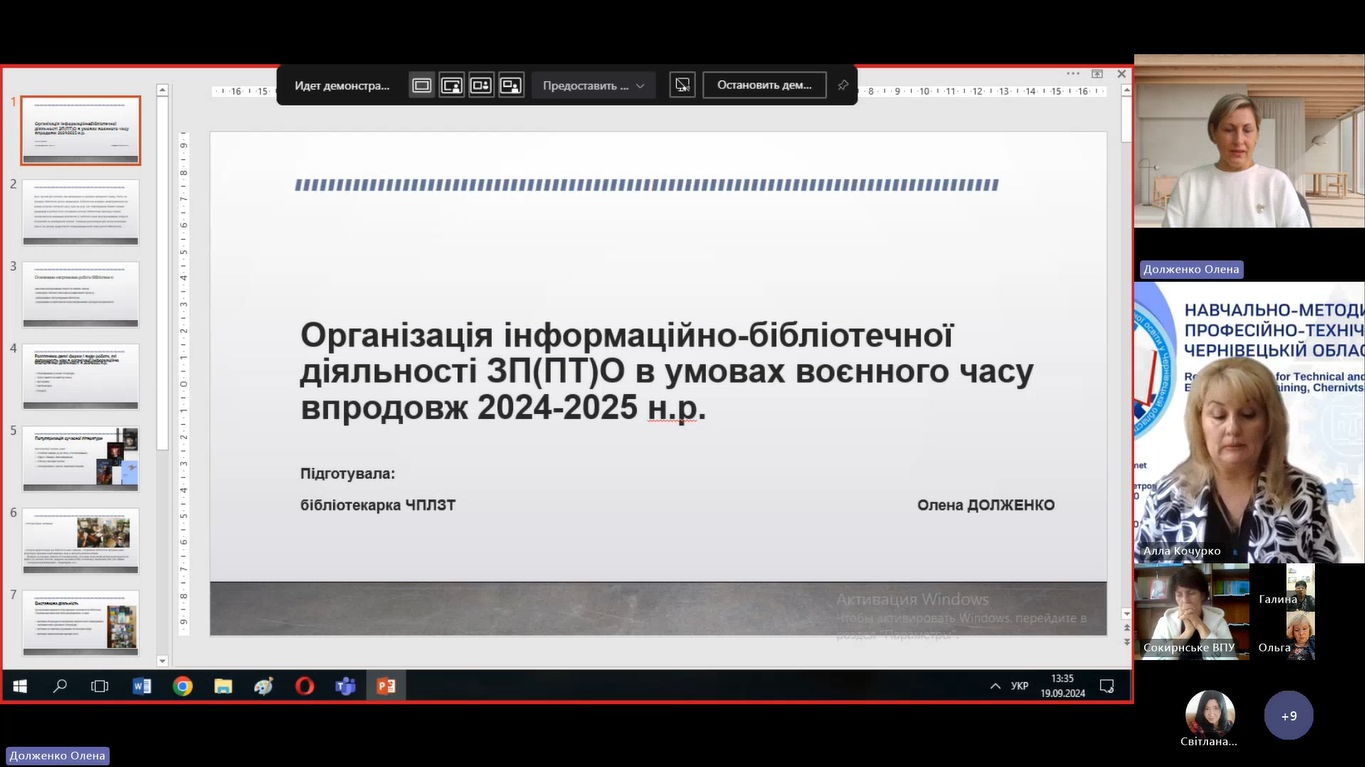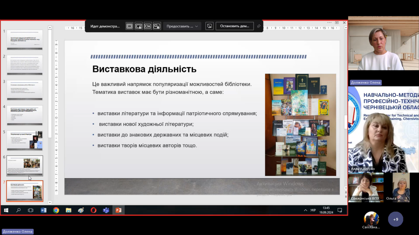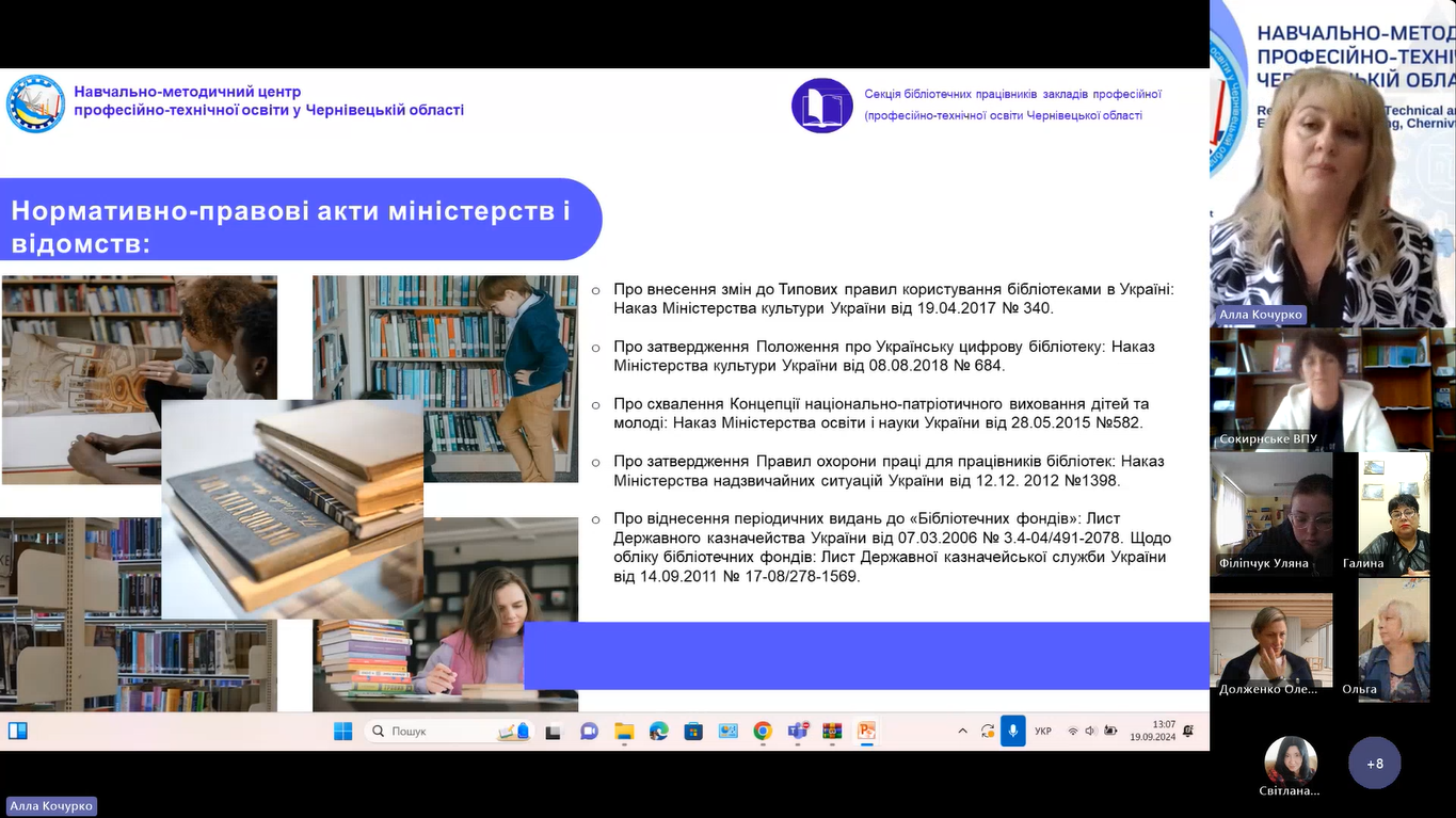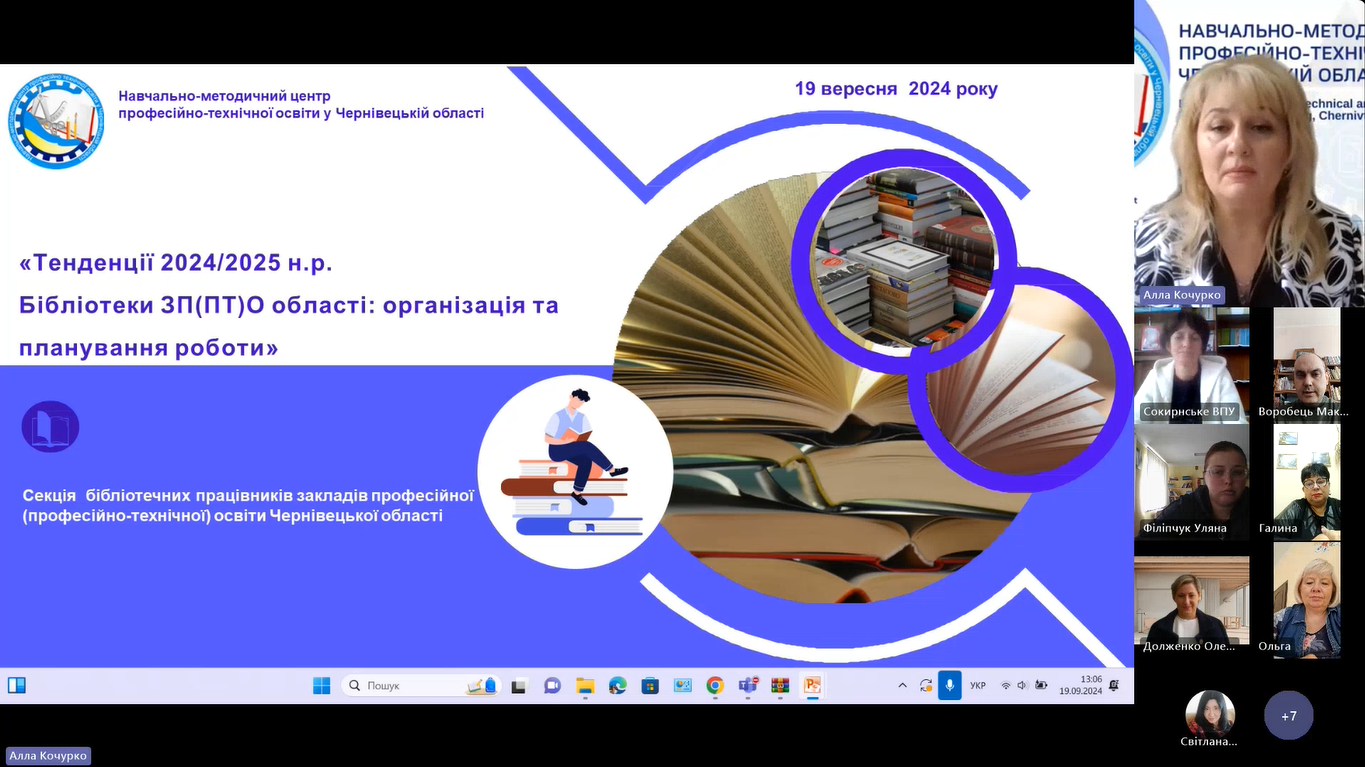 Відповідно до спільного плану роботи Департаменту освіти і науки Чернівецької ОВА (ОДА) та Навчально-методичного центру професійно-технічної освіти у Чернівецькій області на 2024 рік 19 вересня 2024 року в режимі онлайн проведено інструктивно-методичну нараду для бібліотечних працівників ЗП(ПТ)О області «Тенденції 2024/2025 н.р. Бібліотеки ЗП(ПТ)О області: організація та планування роботи».