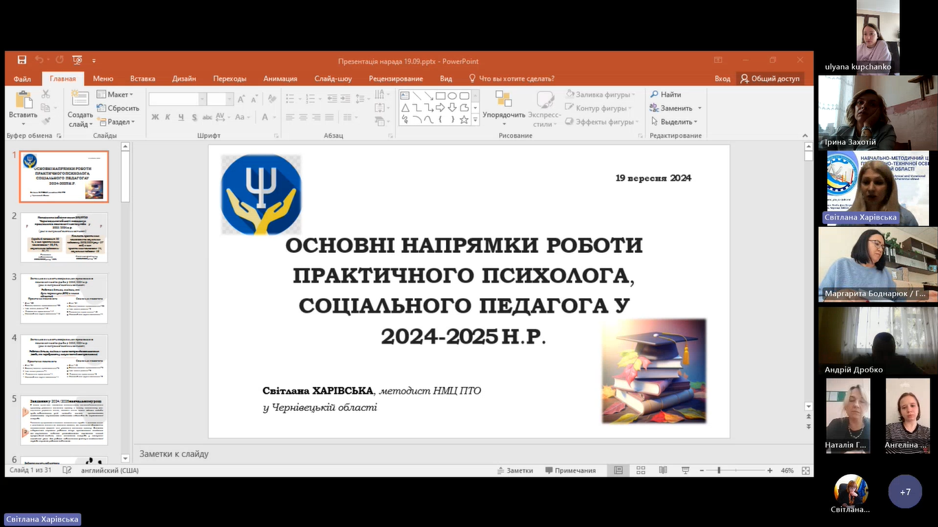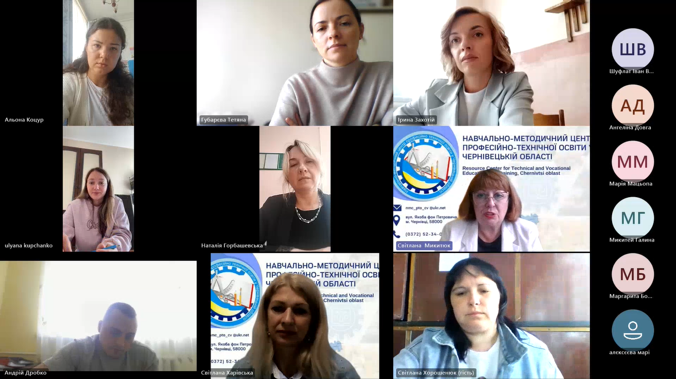 19 вересня 2024 року відповідно до спільного плану роботи Департаменту освіти і науки Чернівецької ОВА (ОДА) та Навчально-методичного центру професійно-технічної освіти у Чернівецькій області відбулася інструктивно-методична нарада «Основні напрямки роботи практичного психолога, соціального педагога у 2024-2025 н.р.», цільова група - практичні психологи, соціальні педагоги.