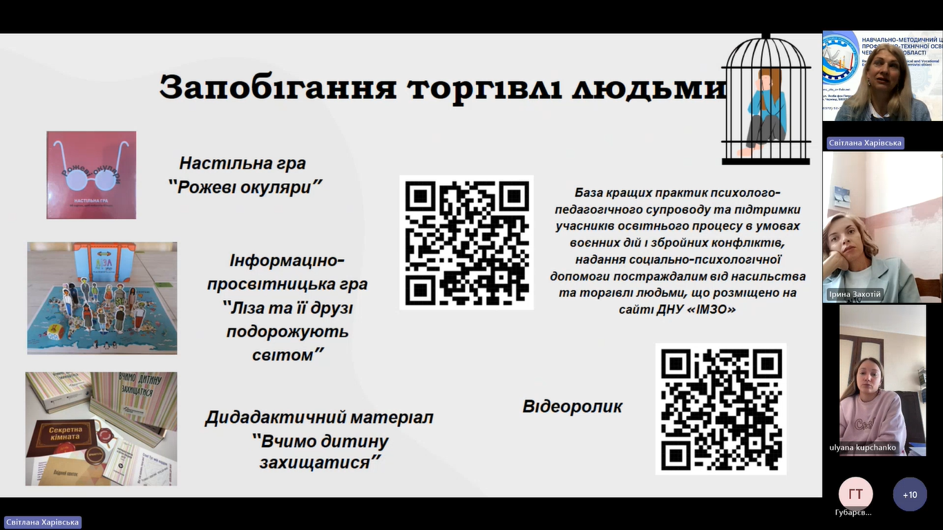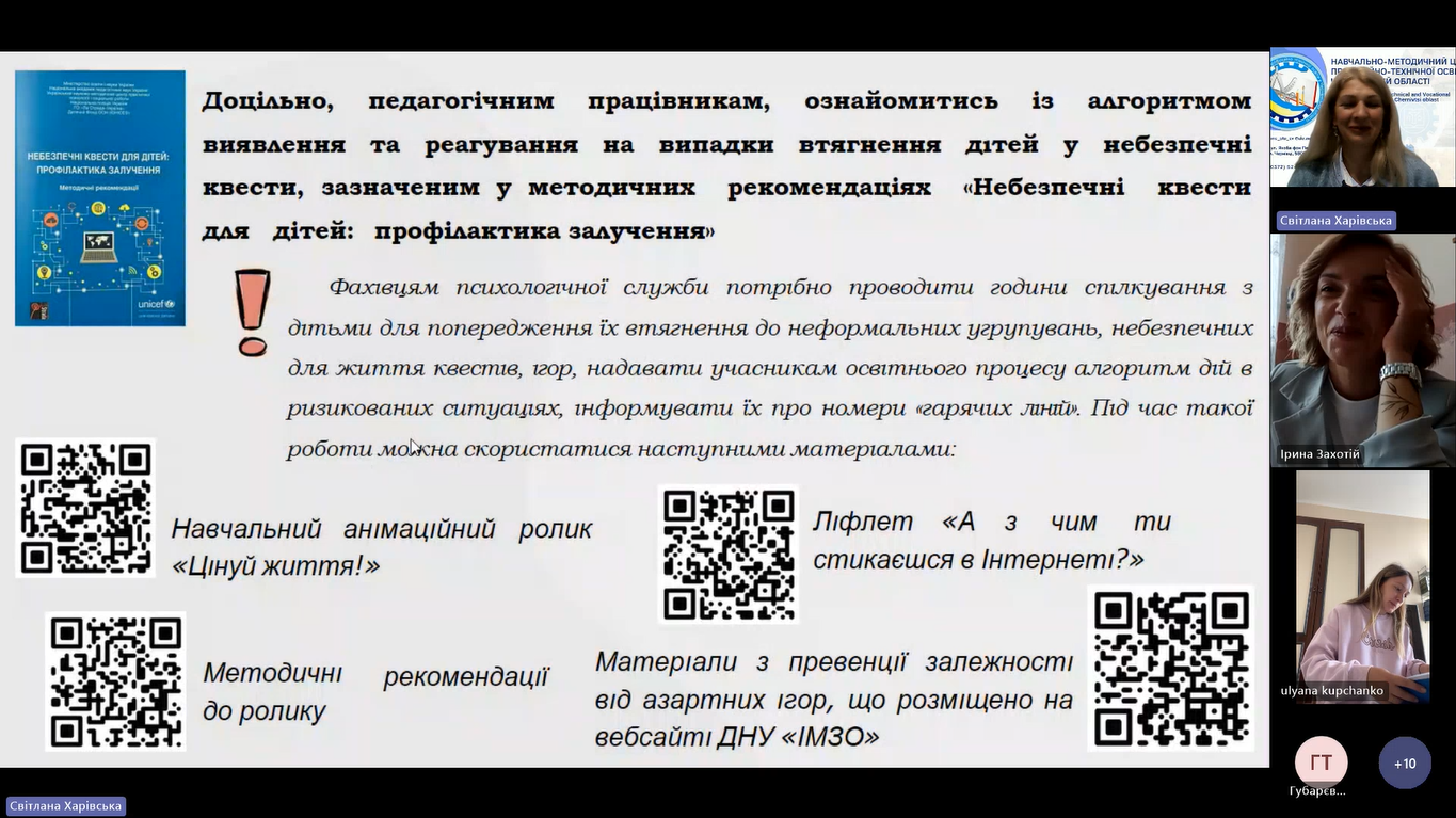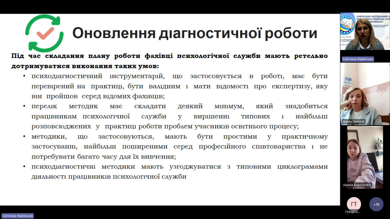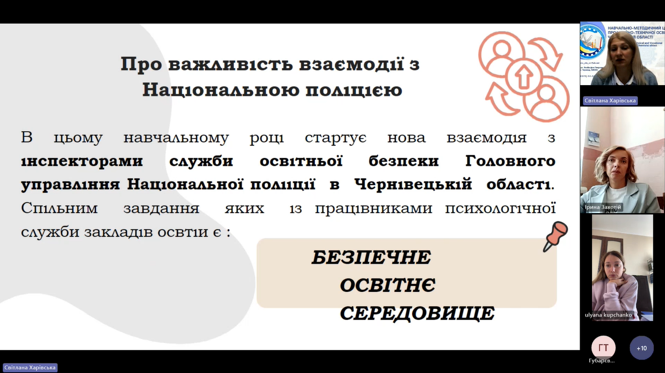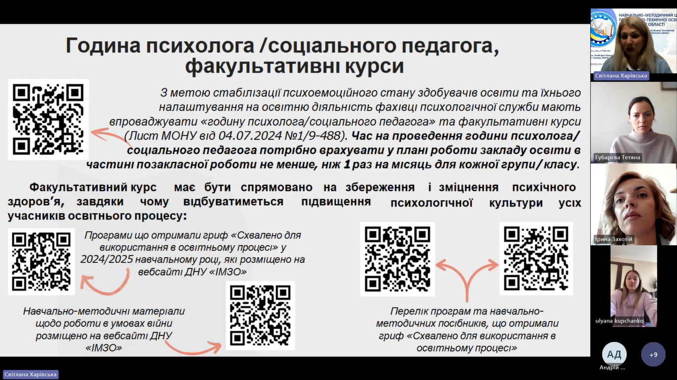 Методист НМЦ ПТО у Чернівецькій області, Світлана Харівська, у своєму виступі «Основні напрямки роботи практичного психолога, соціального педагога у 2024-2025 н.р.» акцентувала увагу на пріоритетних напрямках діяльності фахівців психологічної служби відповідно до розроблених Методичних рекомендацій ДНУ «ІМЗО» та НМЦ ПТО у Чернівецькій області у поточному навчальному році.