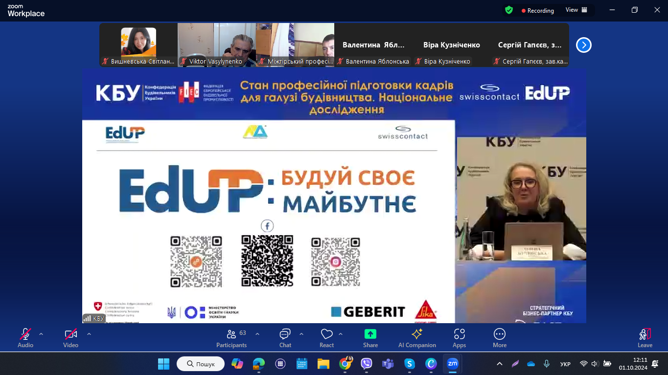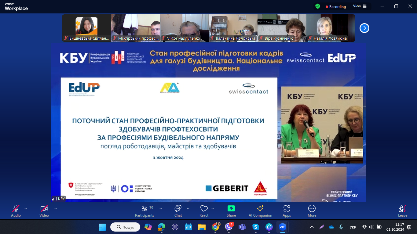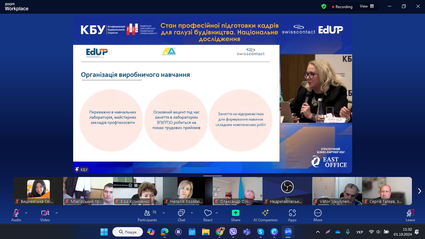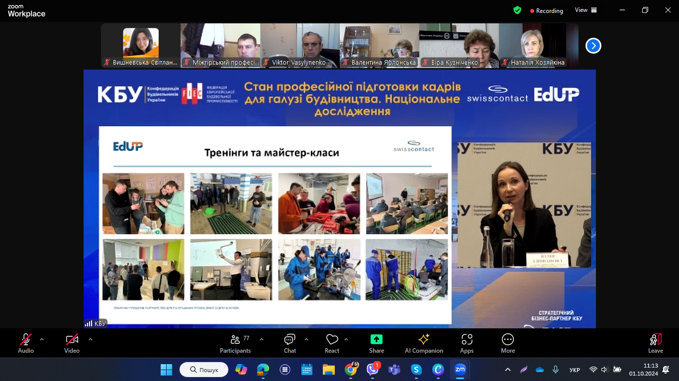 1 жовтня 2024 року педагогічні працівники НМЦ ПТО у Чернівецькій області та закладів П(ПТ)О області долучилися до презентації Національного дослідження «Поточний стан практичної підготовки у закладах професійної (професійно-технічної) освіти». Захід відбувся у змішаному форматі під час Business Day в рамках розширеного засідання Ради директорів Конфедерації будівельників України (KБУ ).