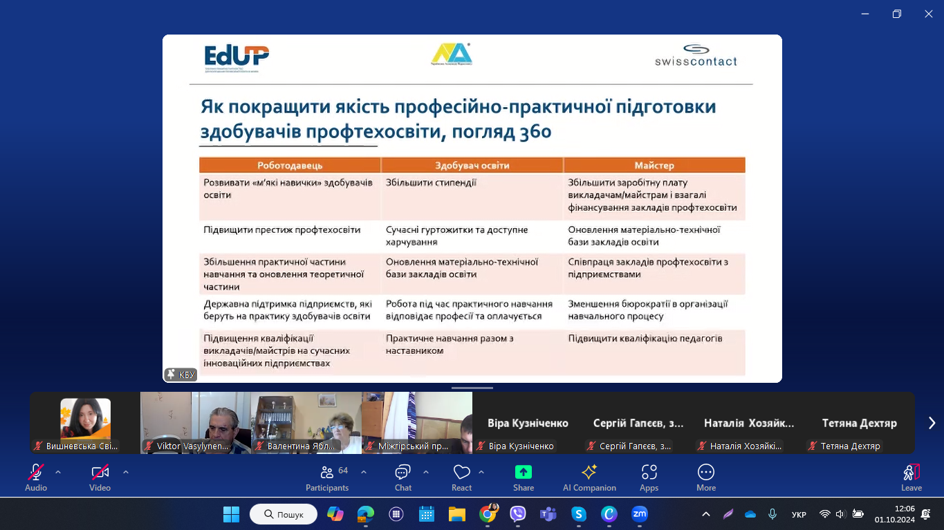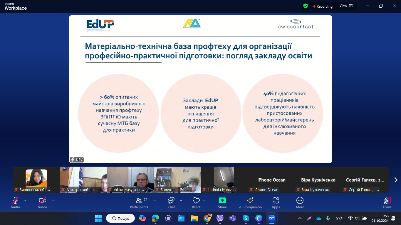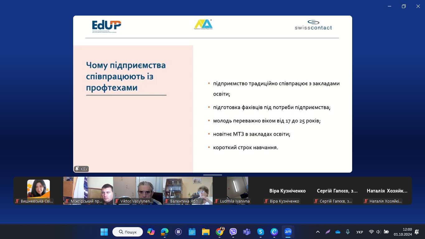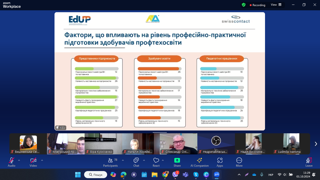 1 жовтня 2024 року педагогічні працівники НМЦ ПТО у Чернівецькій області та закладів П(ПТ)О області долучилися до презентації Національного дослідження «Поточний стан практичної підготовки у закладах професійної (професійно-технічної) освіти». Захід відбувся у змішаному форматі під час Business Day в рамках розширеного засідання Ради директорів Конфедерації будівельників України (KБУ ).