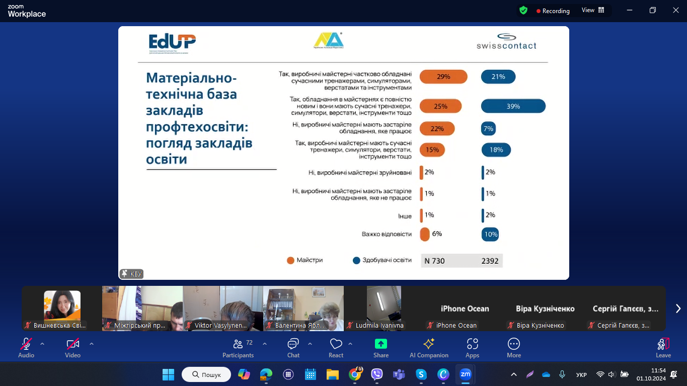 📌 Матеріально-технічна база: Заклади-учасники EdUP мають кращу базу для практичної підготовки. 60% майстрів відзначають сучасне обладнання, а 40% підтверджують наявність спеціально обладнаних лабораторій для інклюзивного навчання.
