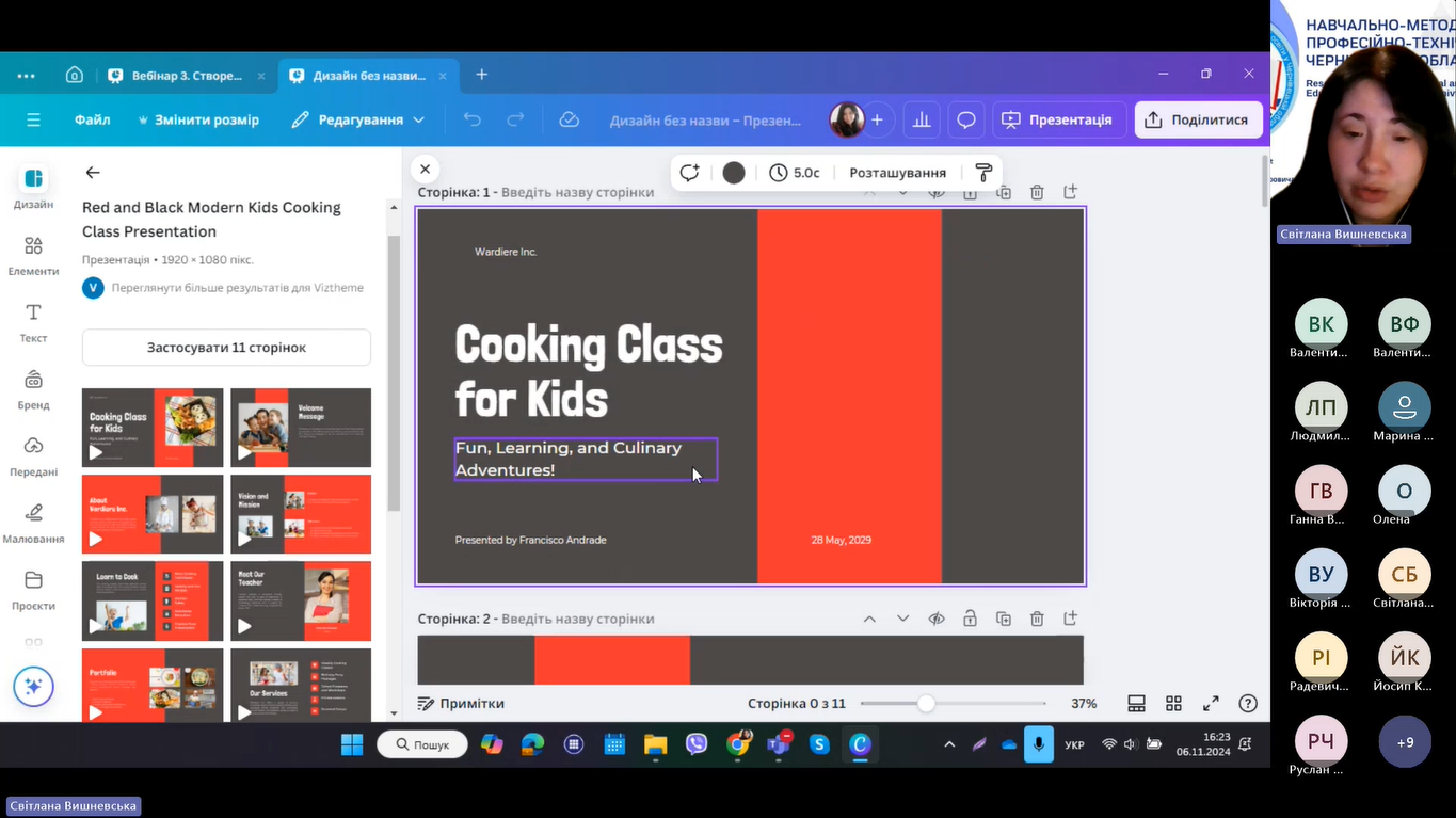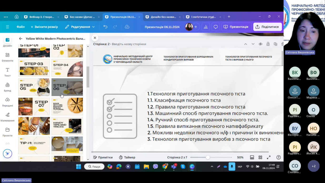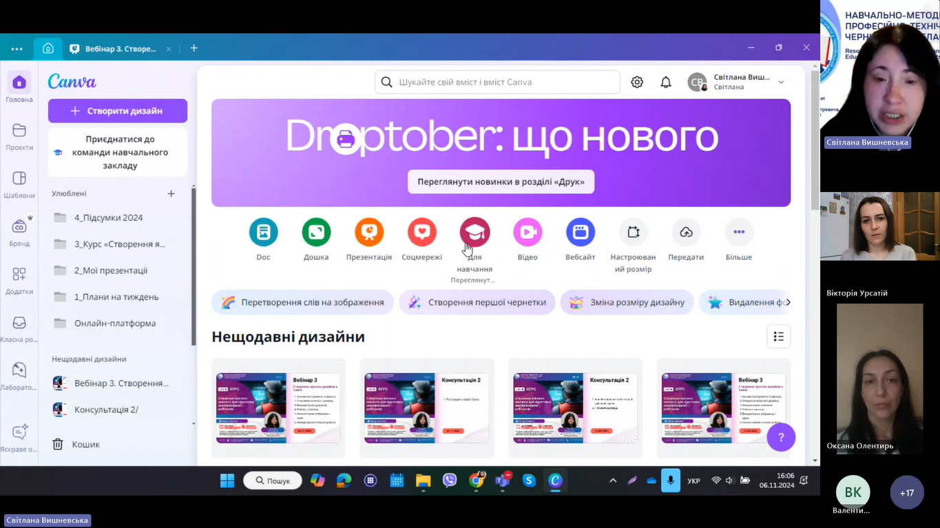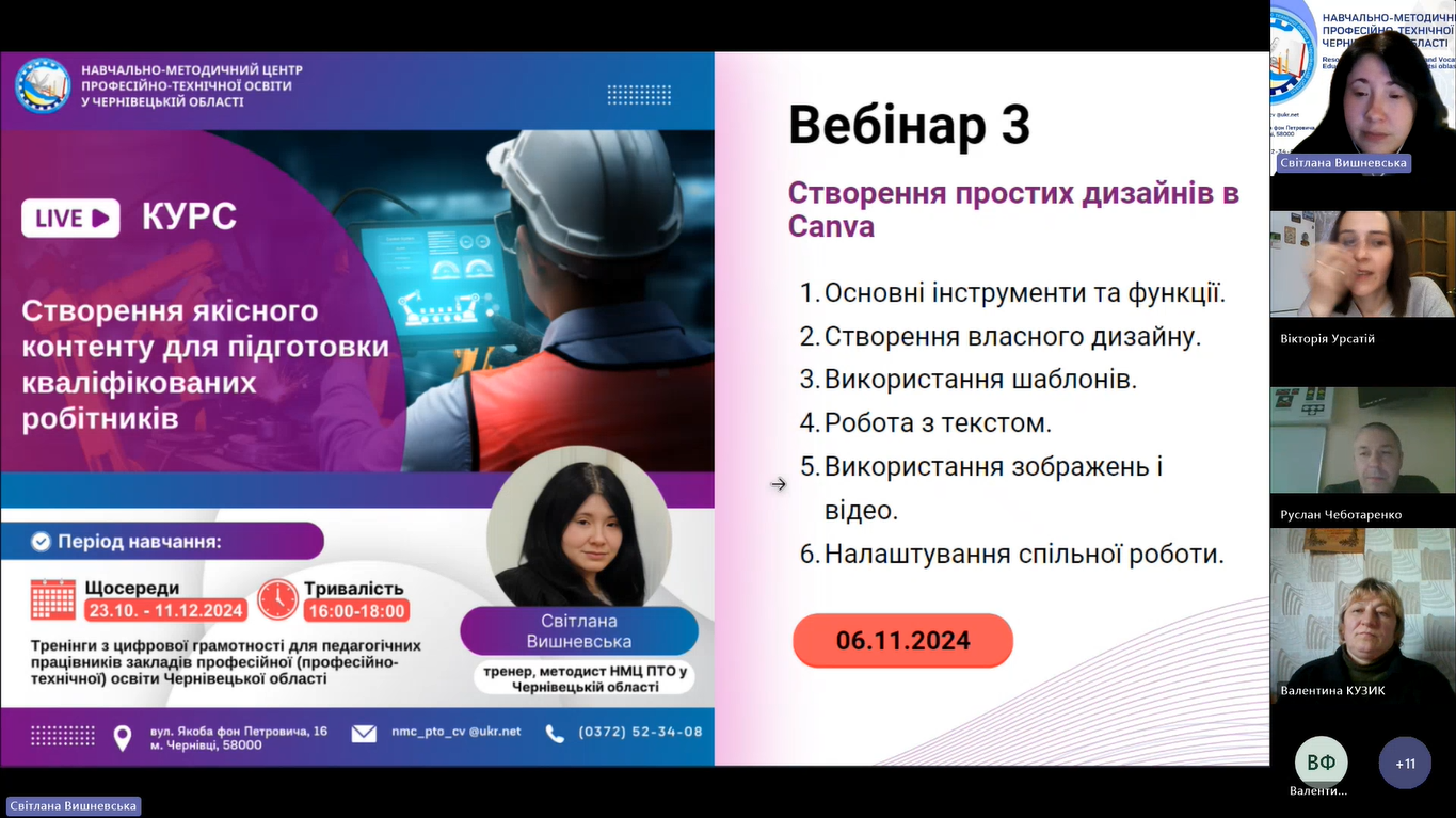6 листопада 2024 року відповідно до плану роботи Навчально-методичного центру професійно-технічної освіти у Чернівецькій області на 2024 рік та програми курсу «Створення якісного контенту для підготовки кваліфікованих робітників», відбувся черговий вебінар для педагогічних працівників ЗП(ПТ)О. Під час вебінару Світлана Вишневська, методист Центру, познайомила слухачів з особливостями створення простих дизайнів в Canva. В межах Вебінару 3 педагогічні працівники: