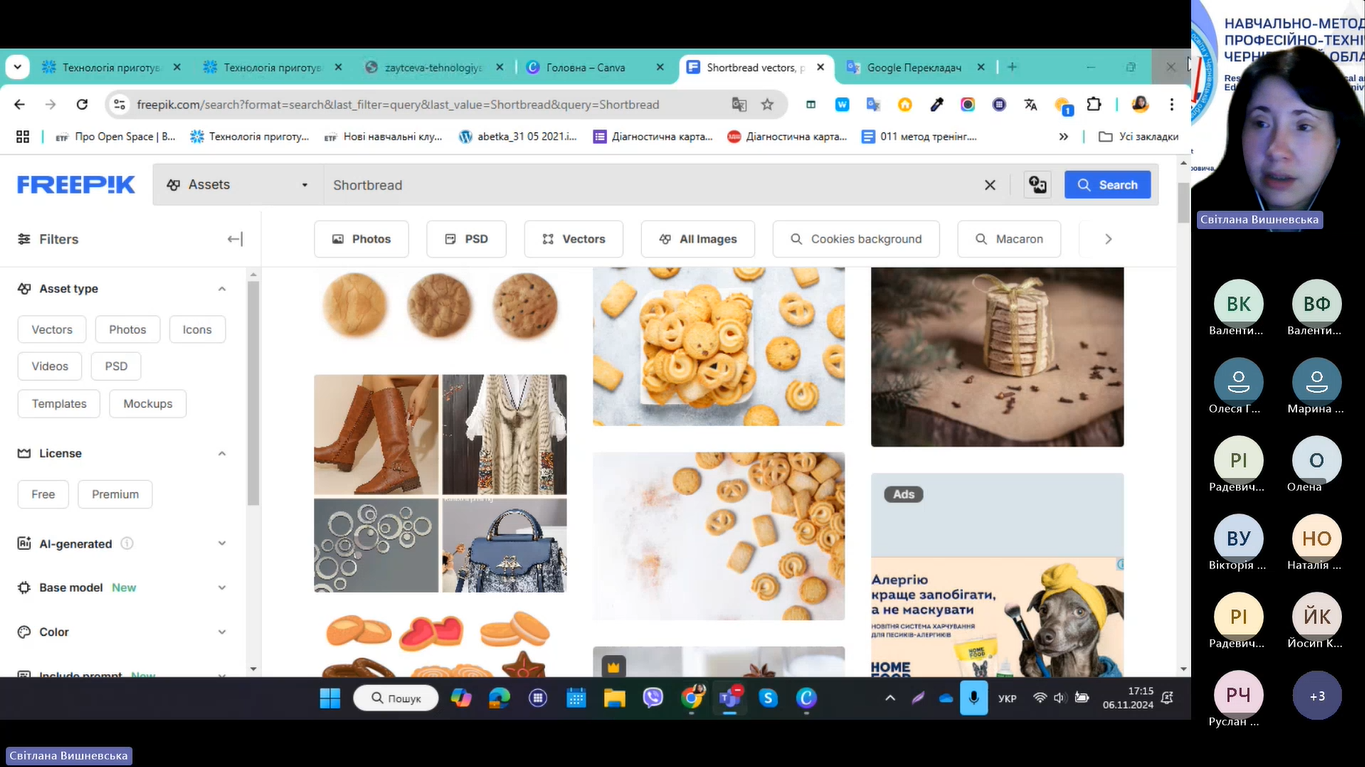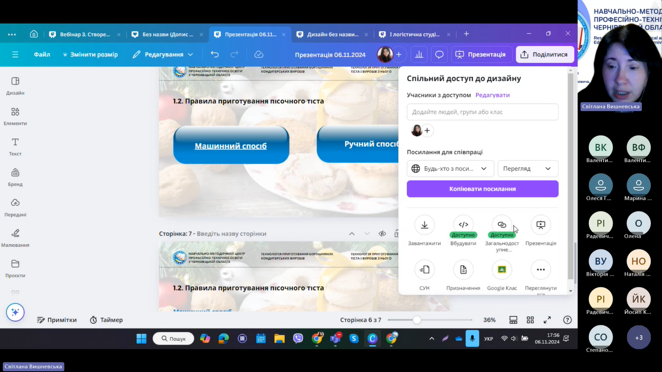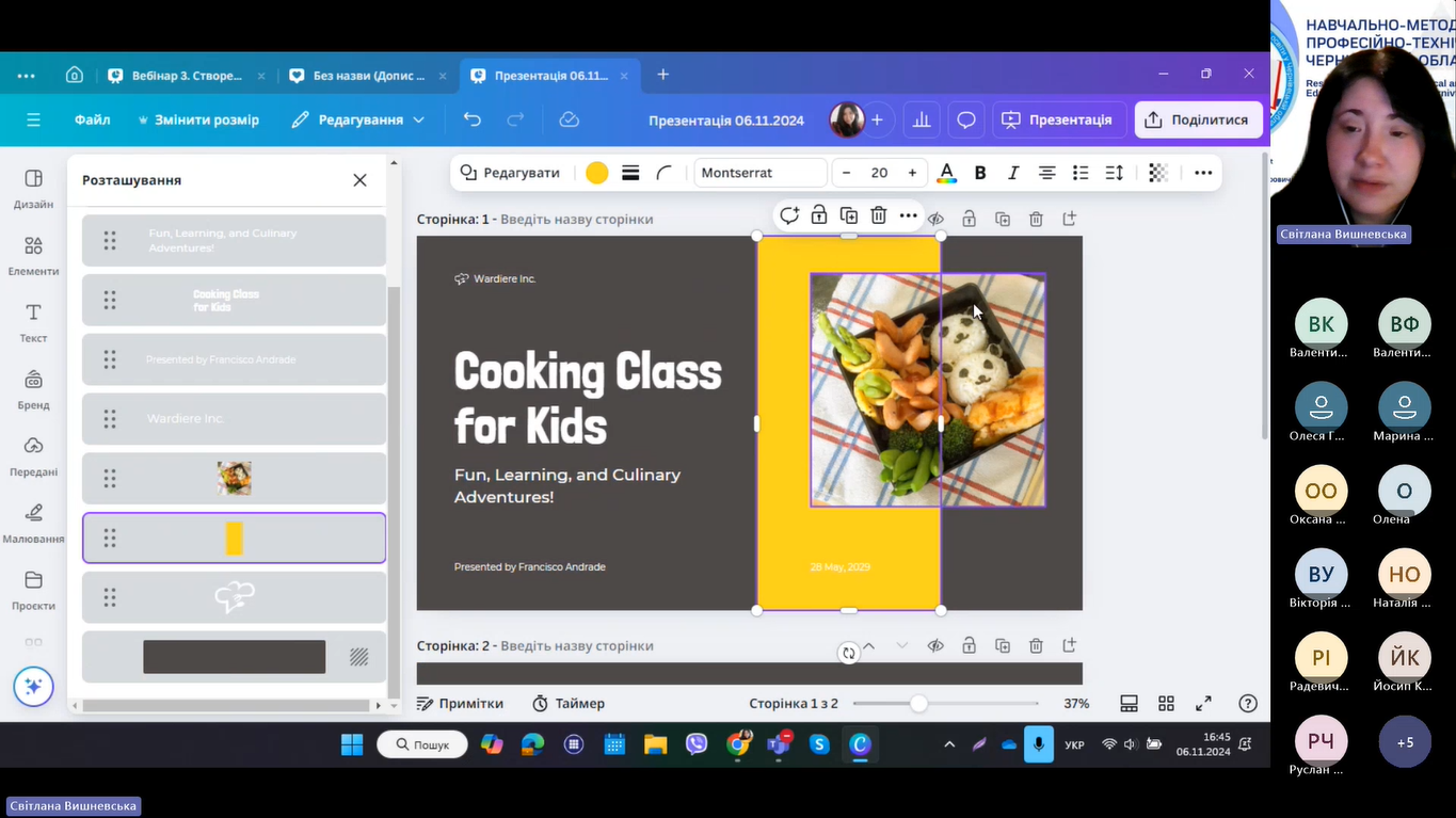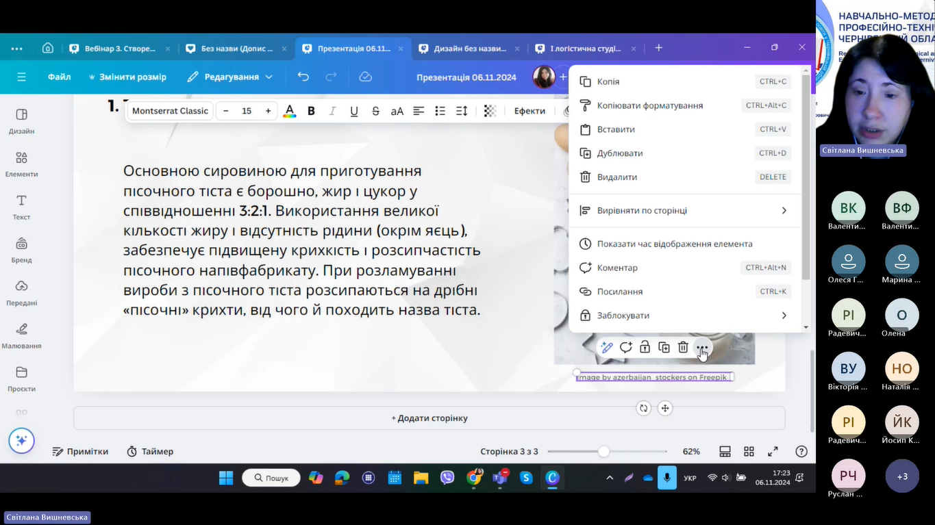 6 листопада 2024 року відповідно до плану роботи Навчально-методичного центру професійно-технічної освіти у Чернівецькій області на 2024 рік та програми курсу «Створення якісного контенту для підготовки кваліфікованих робітників», відбувся черговий вебінар для педагогічних працівників ЗП(ПТ)О. Під час вебінару Світлана Вишневська, методист Центру, познайомила слухачів з особливостями створення простих дизайнів в Canva. В межах Вебінару 3 педагогічні працівники: