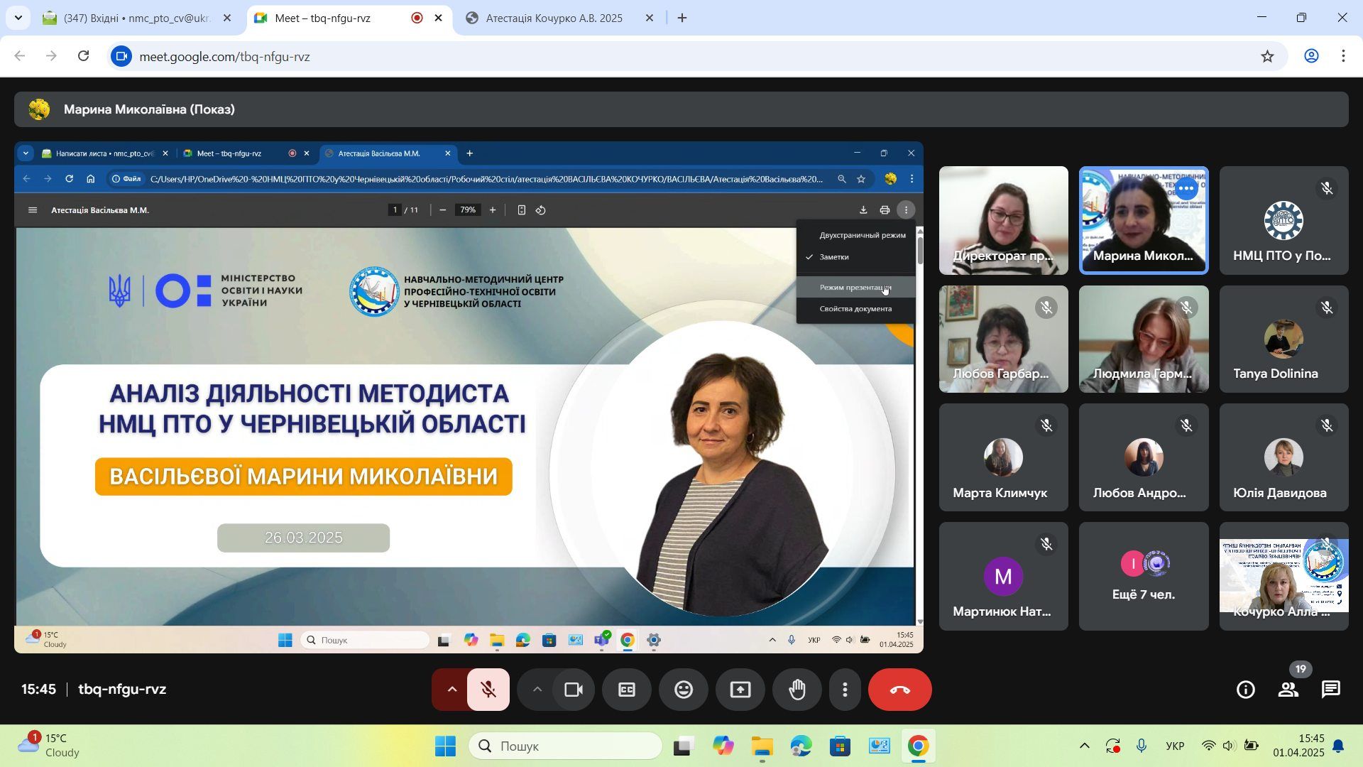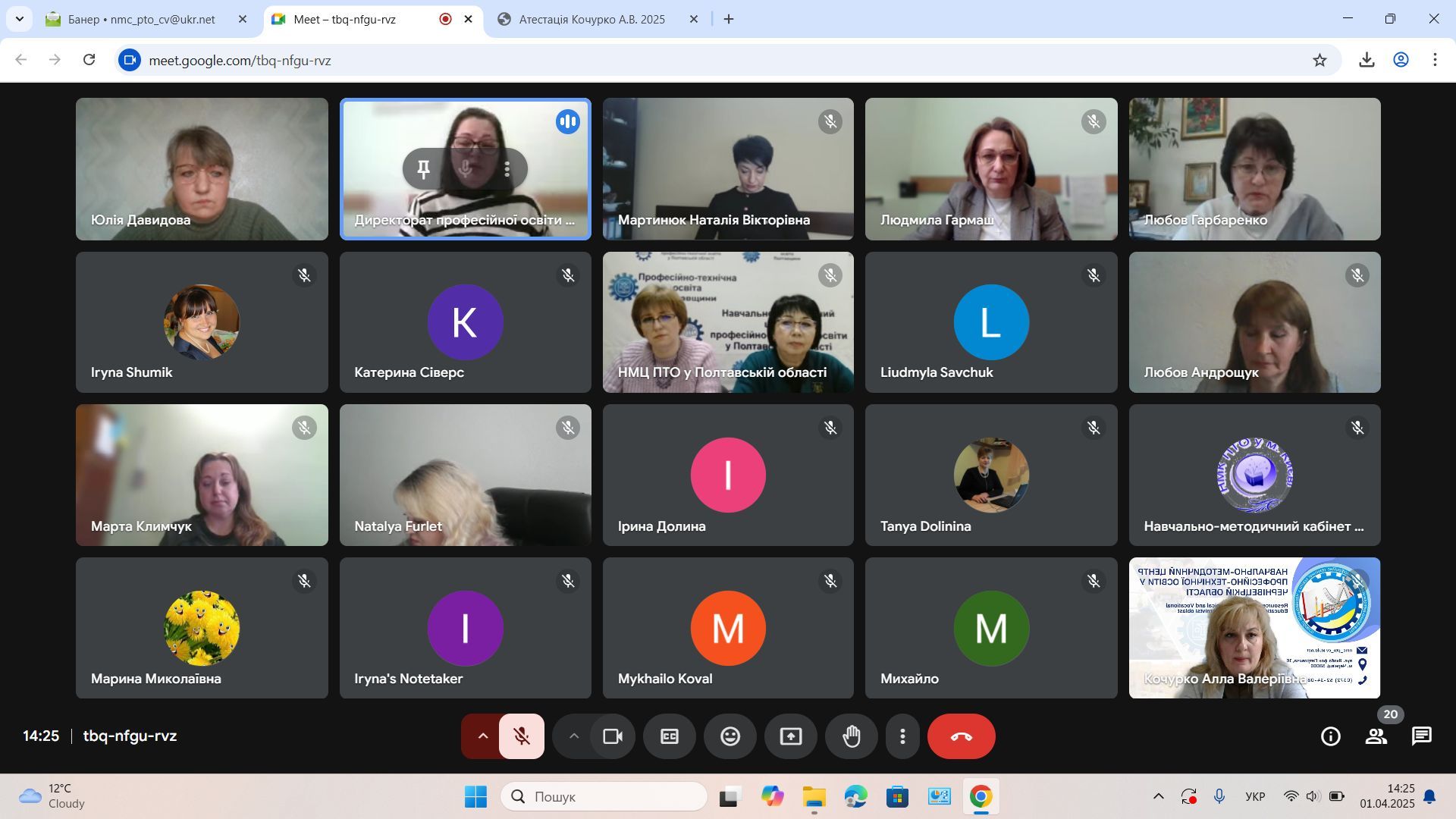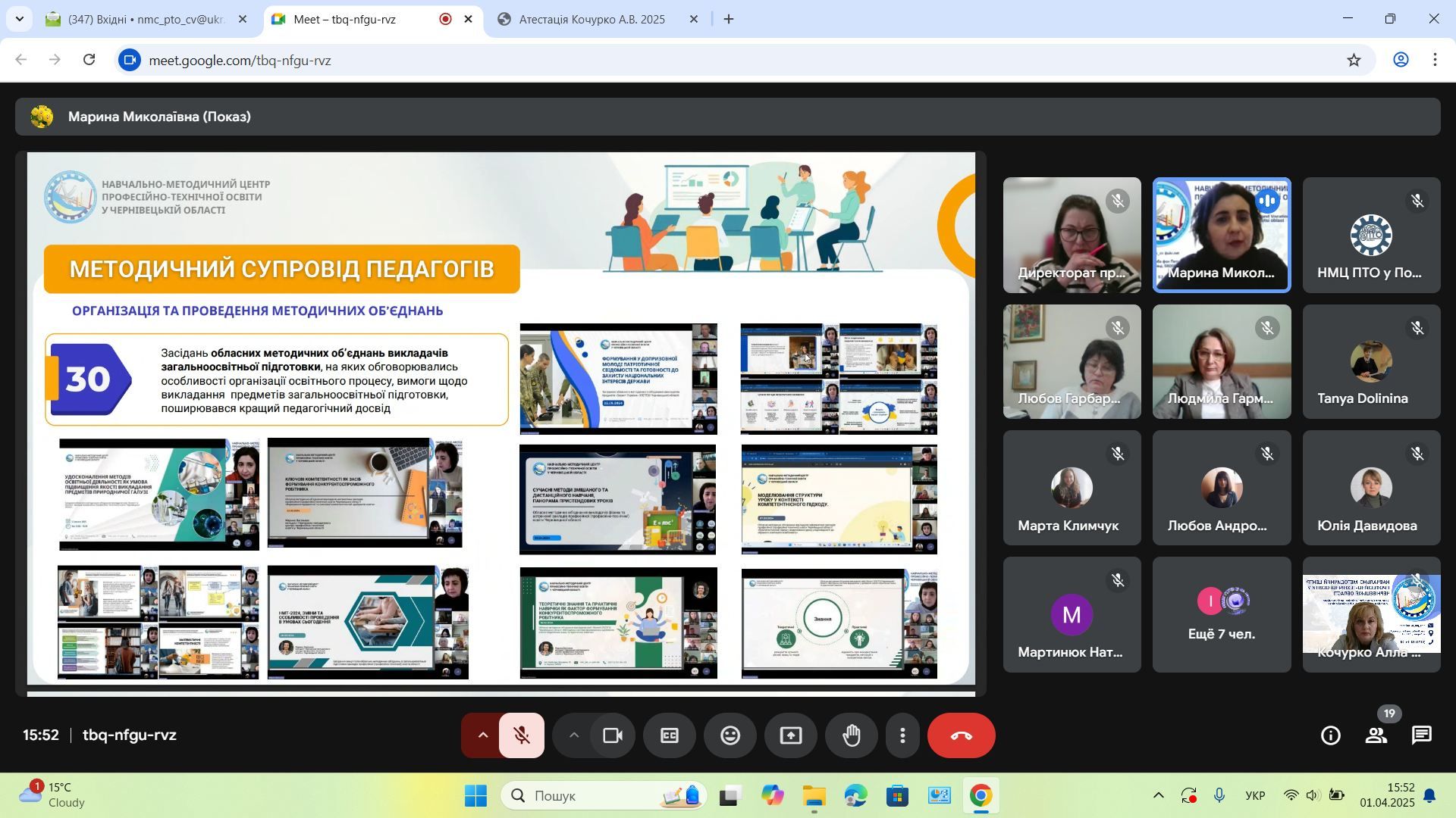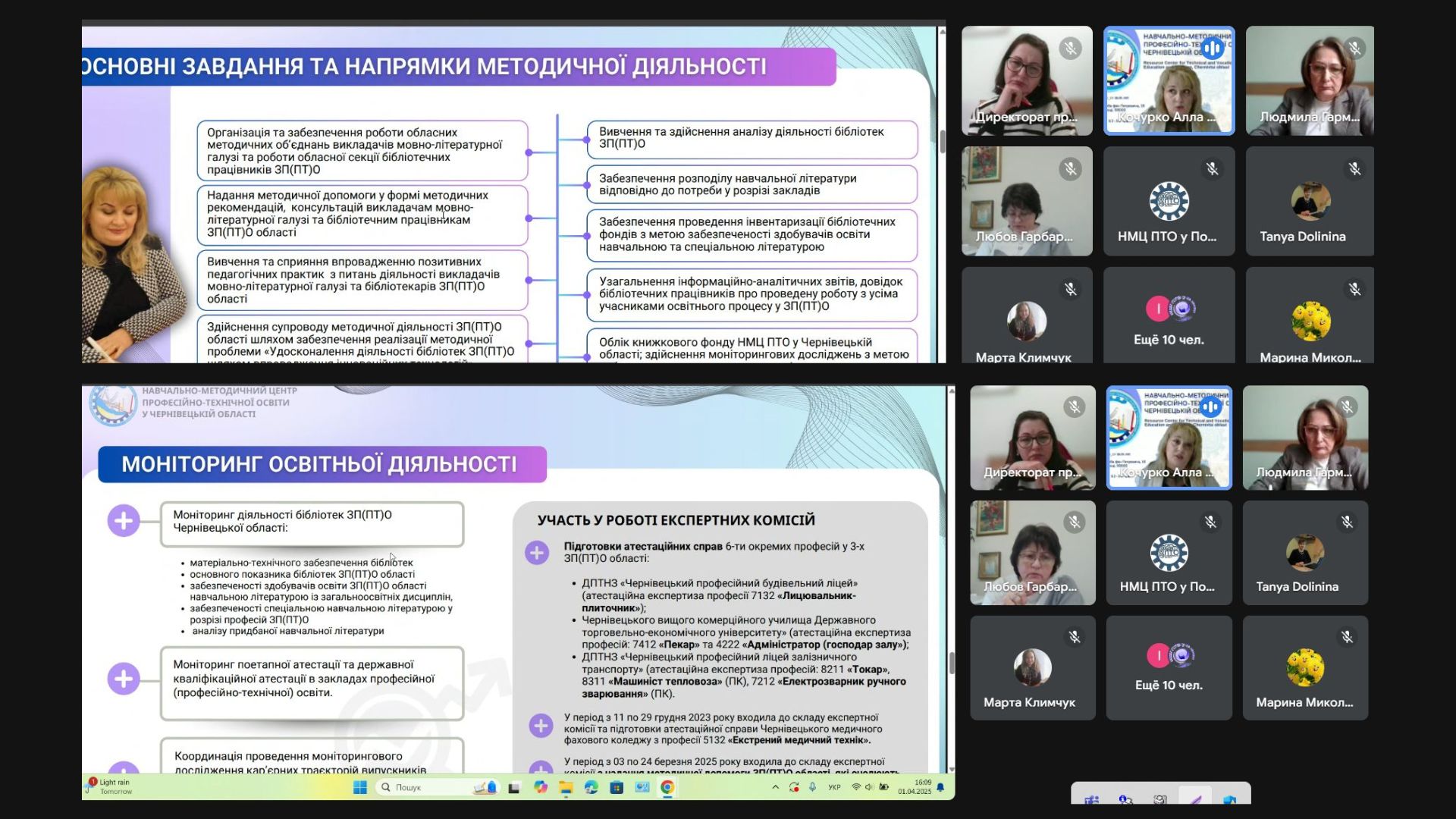 1 квітня 2025 року відбулося засідання атестаційної комісії з питань атестації педагогічних працівників навчально-методичних (науково-методичних) центрів (кабінетів) професійно-технічної освіти, що підпорядковані Міністерству освіти і науки України. Захід пройшов під головуванням заступника Міністра освіти і науки України Дмитра Завгороднього та за участі Генерального директора Директорату професійної освіти МОНУ Ірини Шумік.