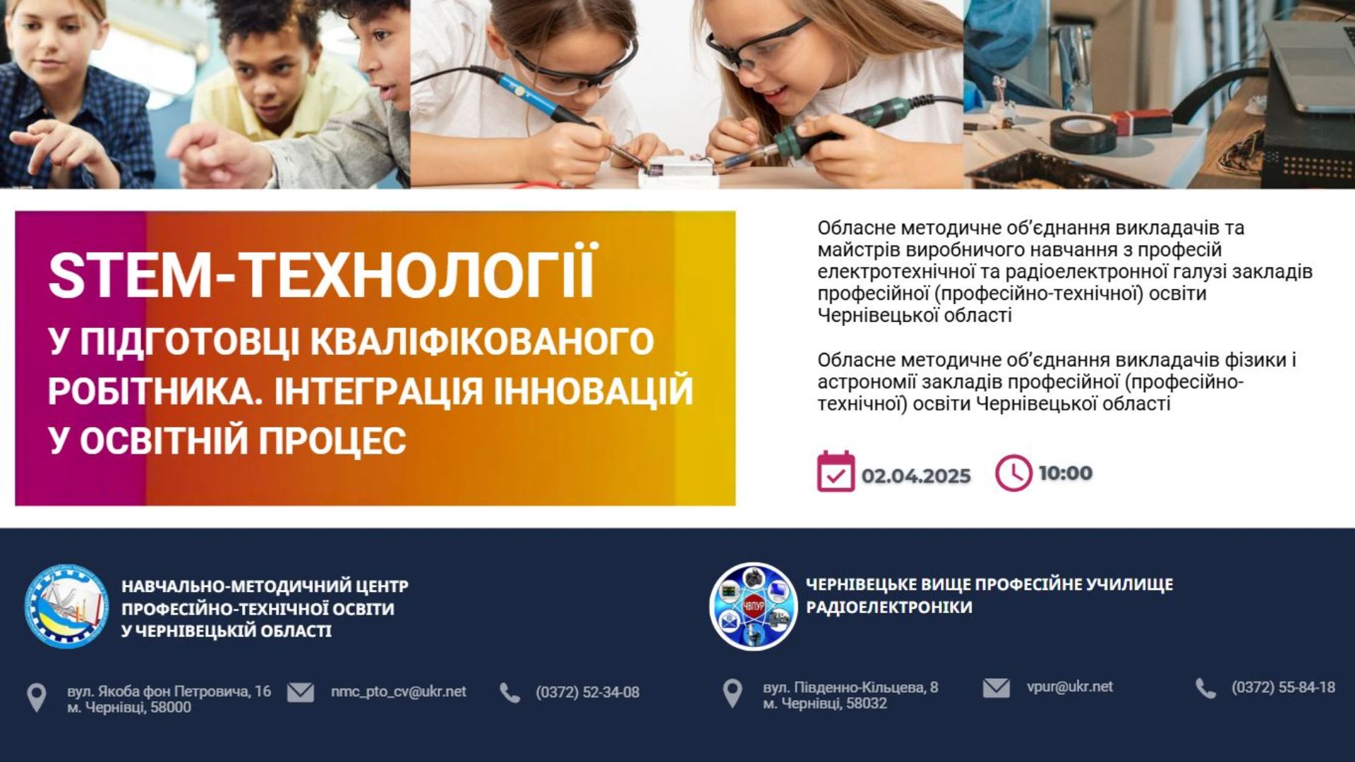 2 квітня 2025 року відповідно до плану роботи Навчально-методичного центру професійно-технічної освіти у Чернівецькій області, проведено засідання обласного методичного об’єднання викладачів та майстрів виробничого навчання з професій електротехнічної та радіоелектронної галузі, а також викладачів фізики і астрономії закладів професійної (професійно-технічної) освіти Чернівецької області присвячене темі «STEM-технології у підготовці кваліфікованого робітника. Інтеграція інновацій у освітній процес». Захід відбувся у змішаному форматі на базі Чернівецького вищого професійного училища радіоелектроніки.