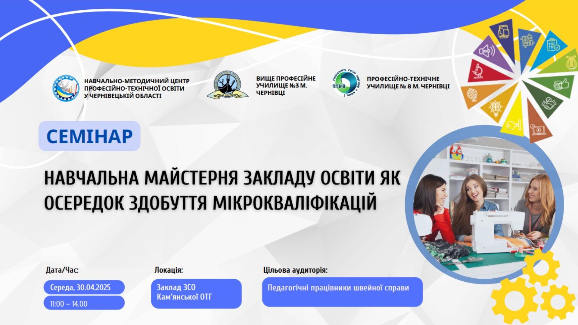 30 квітня 2025 року Навчально-методичним центром професійно-технічної освіти у Чернівецькій області проведено семінар для педагогічних працівників швейної справи закладів середньої освіти громад Чернівецької області «Навчальна майстерня закладу освіти як осередок здобуття мікрокваліфікацій» з метою вироблення нових підходів у профорієнтаційній роботі щодо залучення здобувачів освіти різних вікових груп до професійного навчання за участі педагогічних працівників Вищого професійного училища №3 м. Чернівці та Професійно-технічного училища №8 м. Чернівці, за ініціативи представників проєкту «Об’єднання громад - задля сталого економічного зростання CONCOM4EG», у формі коворкінгу.