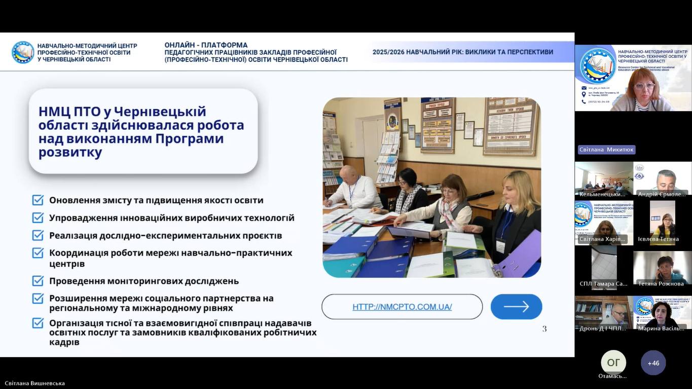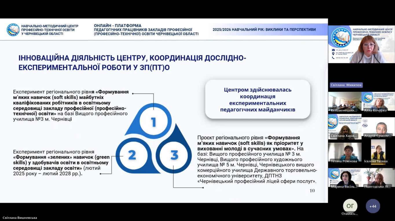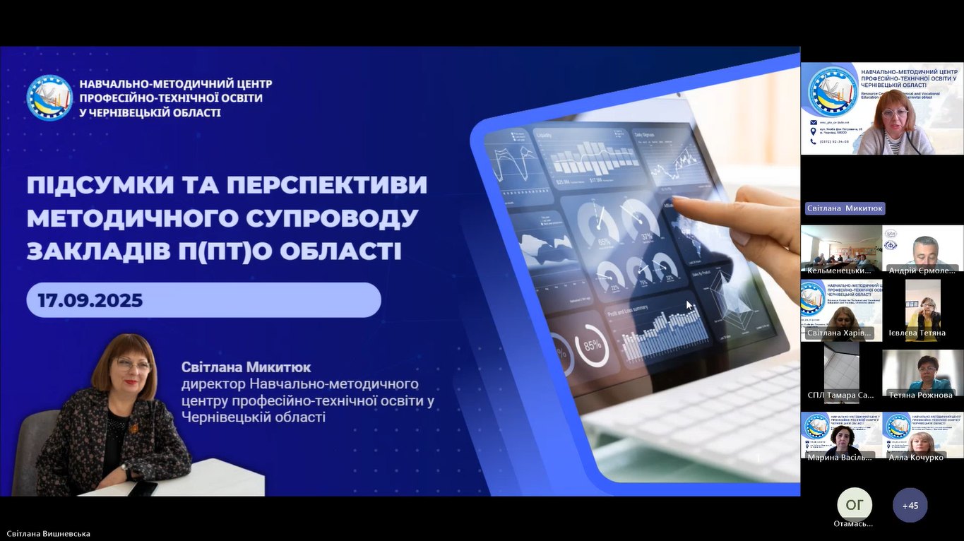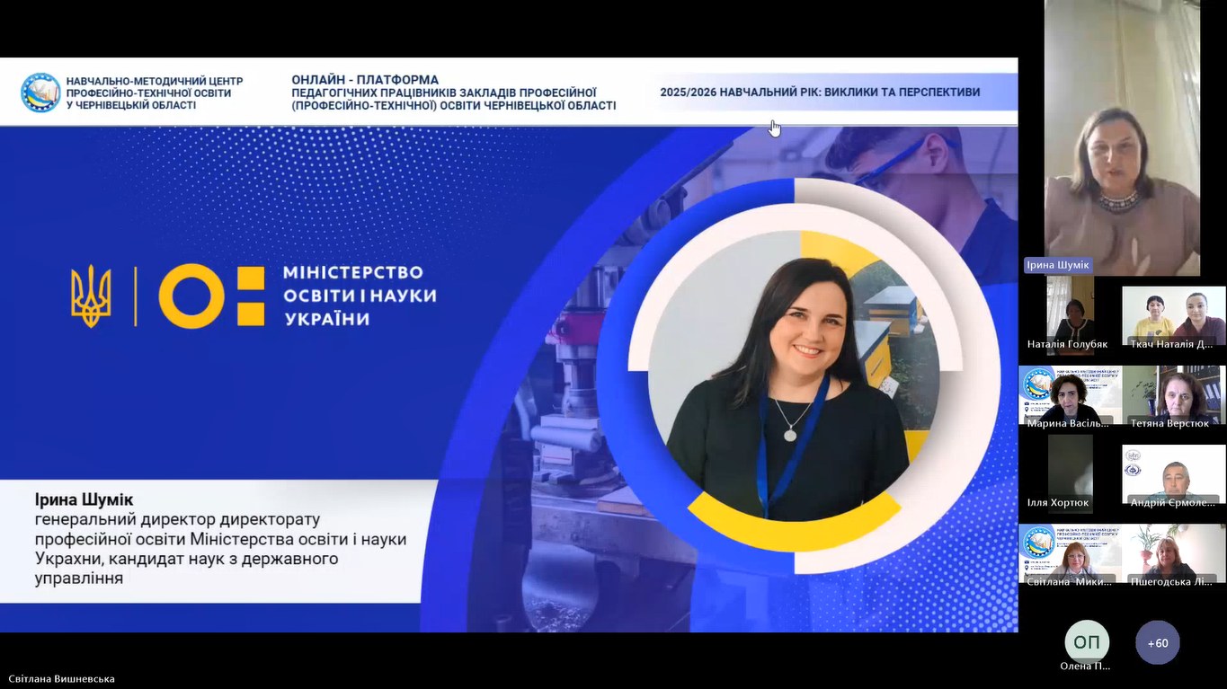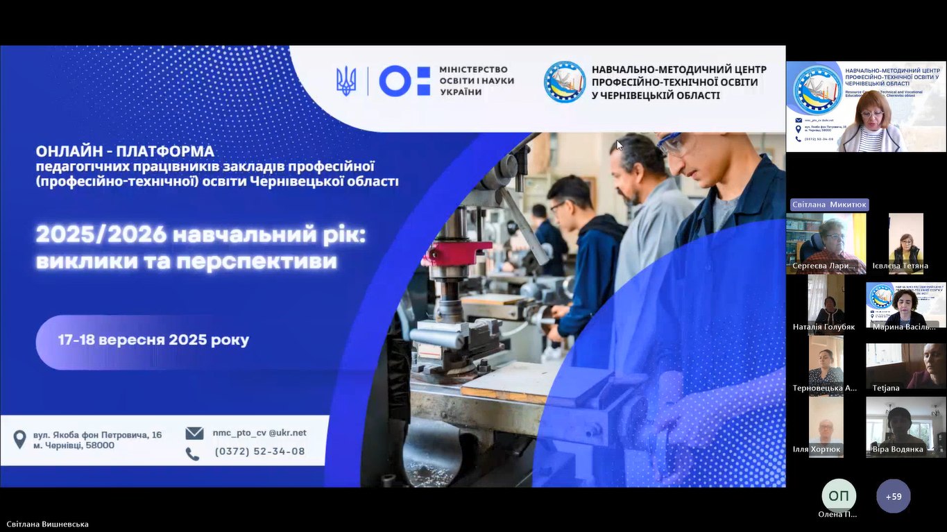 17 вересня 2025 року, відповідно до плану роботи Навчально-методичного центру професійно-технічної освіти у Чернівецькій області розпочала свою роботу дводенна Онлайн-платформа педагогічних працівників закладів професійної (професійно-технічної) освіти Чернівецької області «2025/2026 навчальний рік: виклики та перспективи».