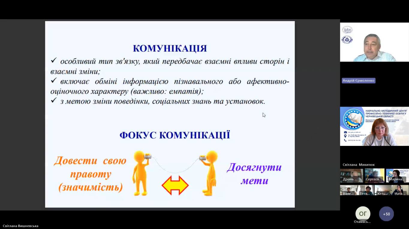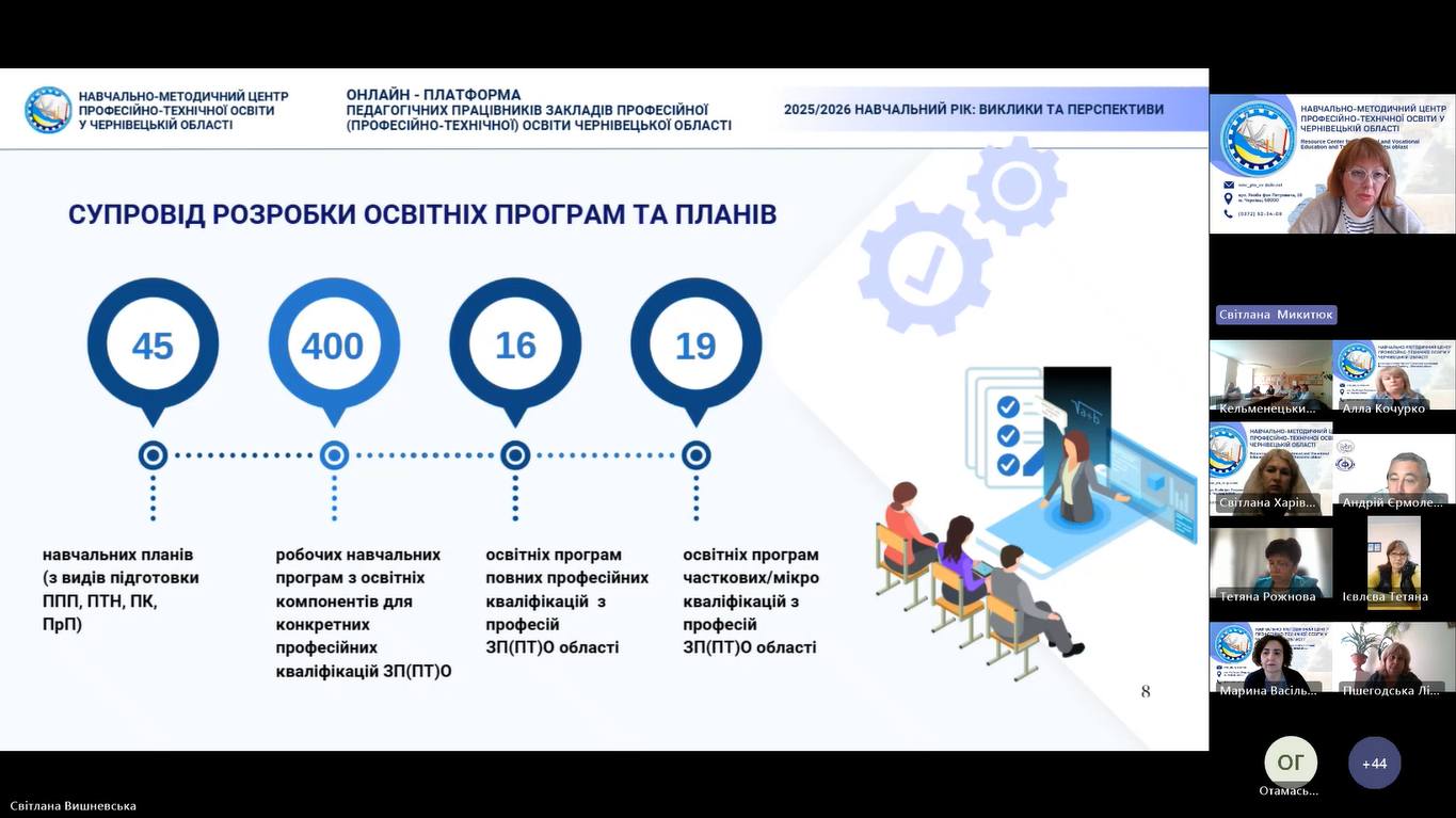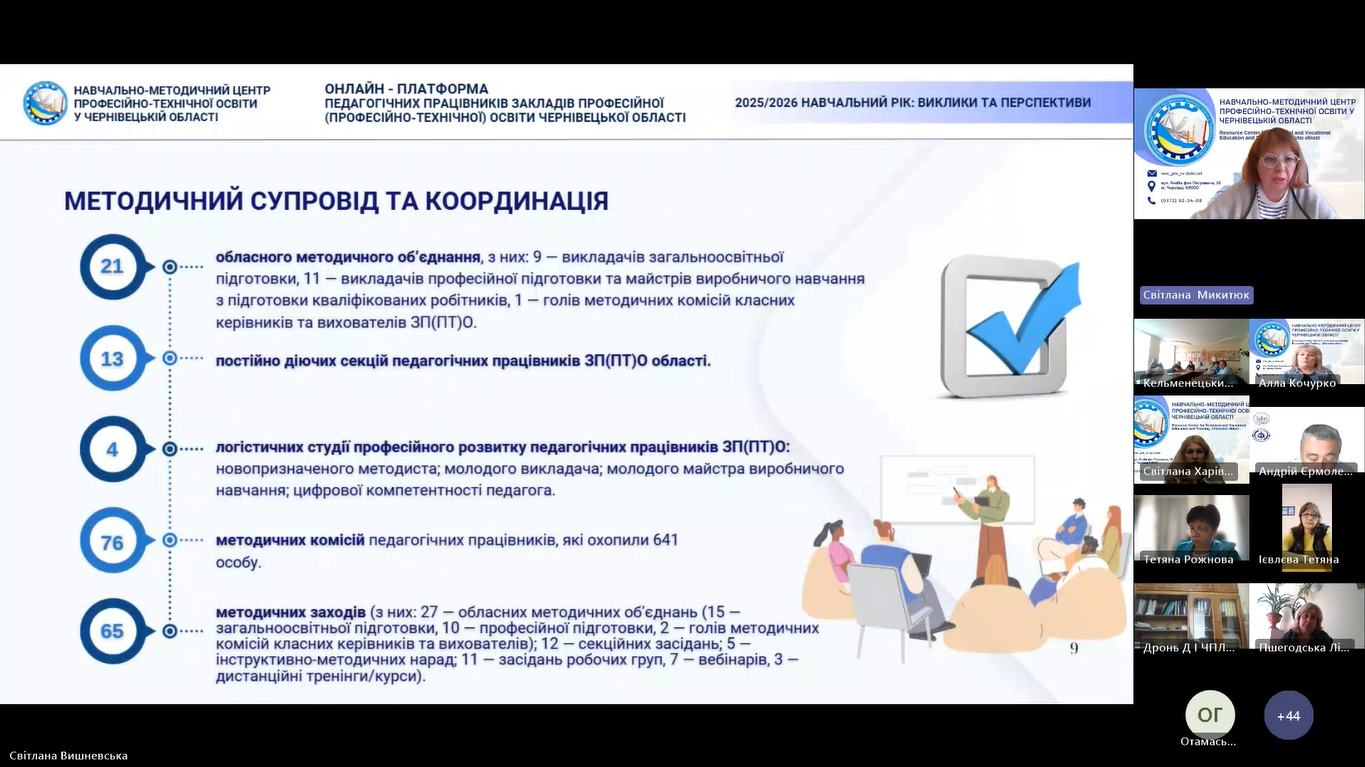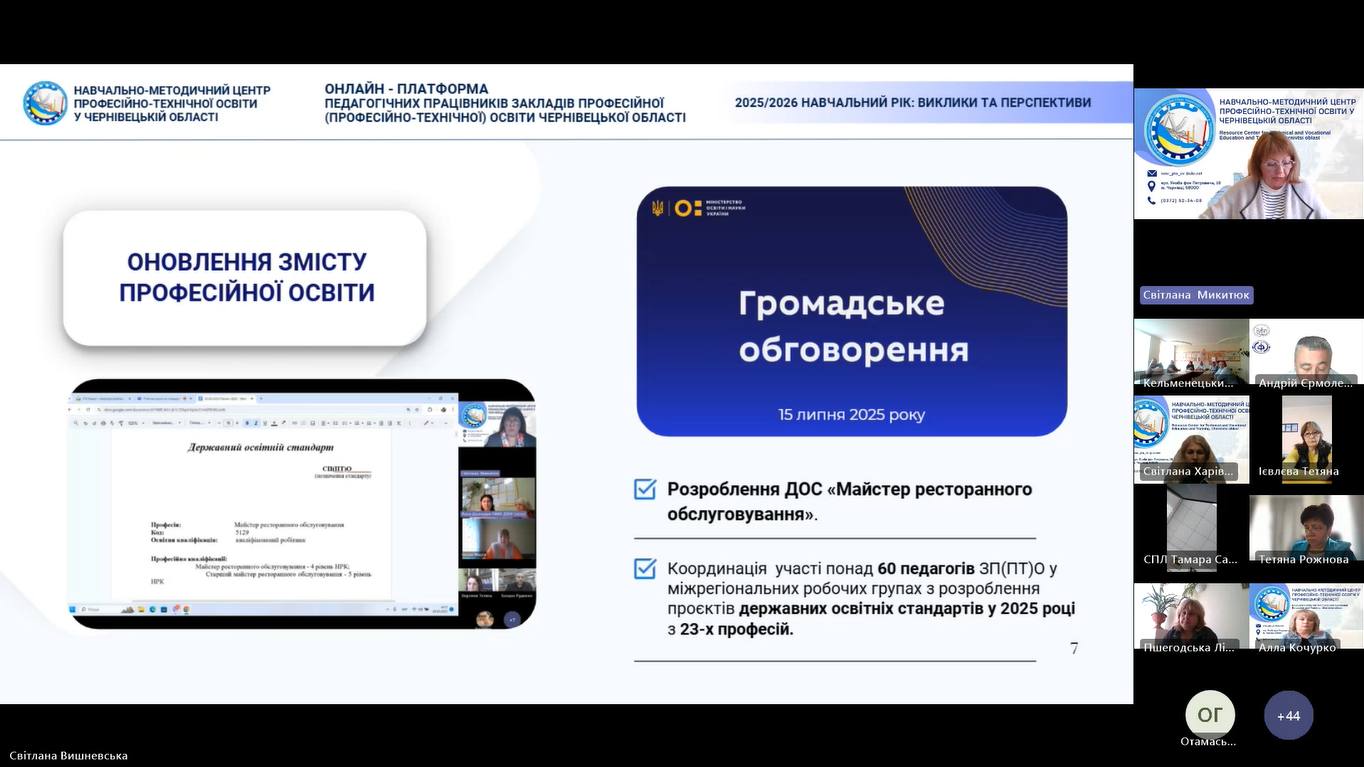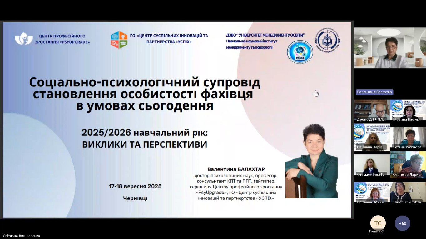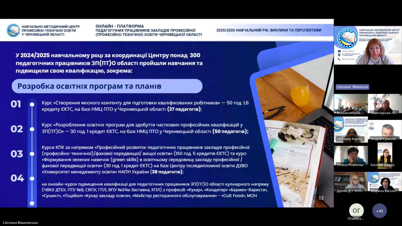 17 вересня 2025 року, відповідно до плану роботи Навчально-методичного центру професійно-технічної освіти у Чернівецькій області розпочала свою роботу дводенна Онлайн-платформа педагогічних працівників закладів професійної (професійно-технічної) освіти Чернівецької області «2025/2026 навчальний рік: виклики та перспективи».