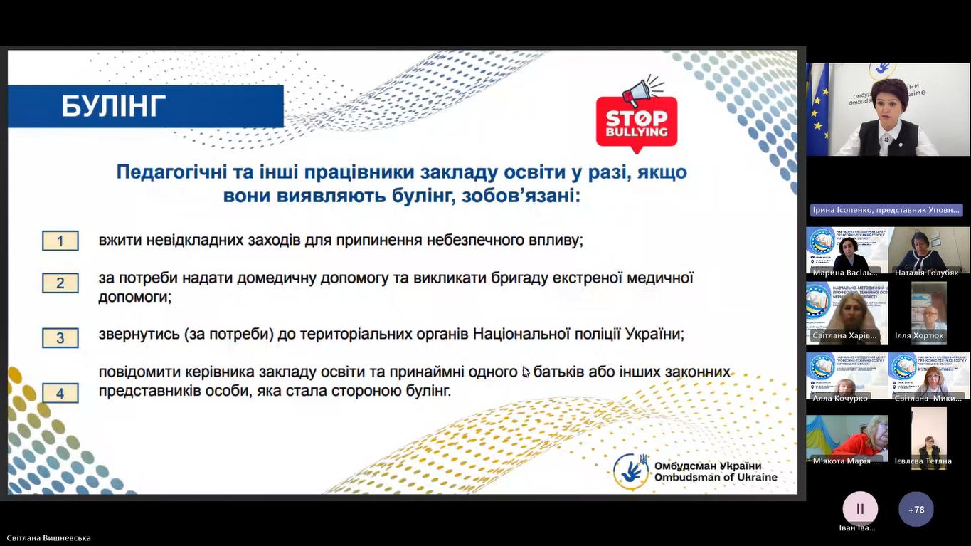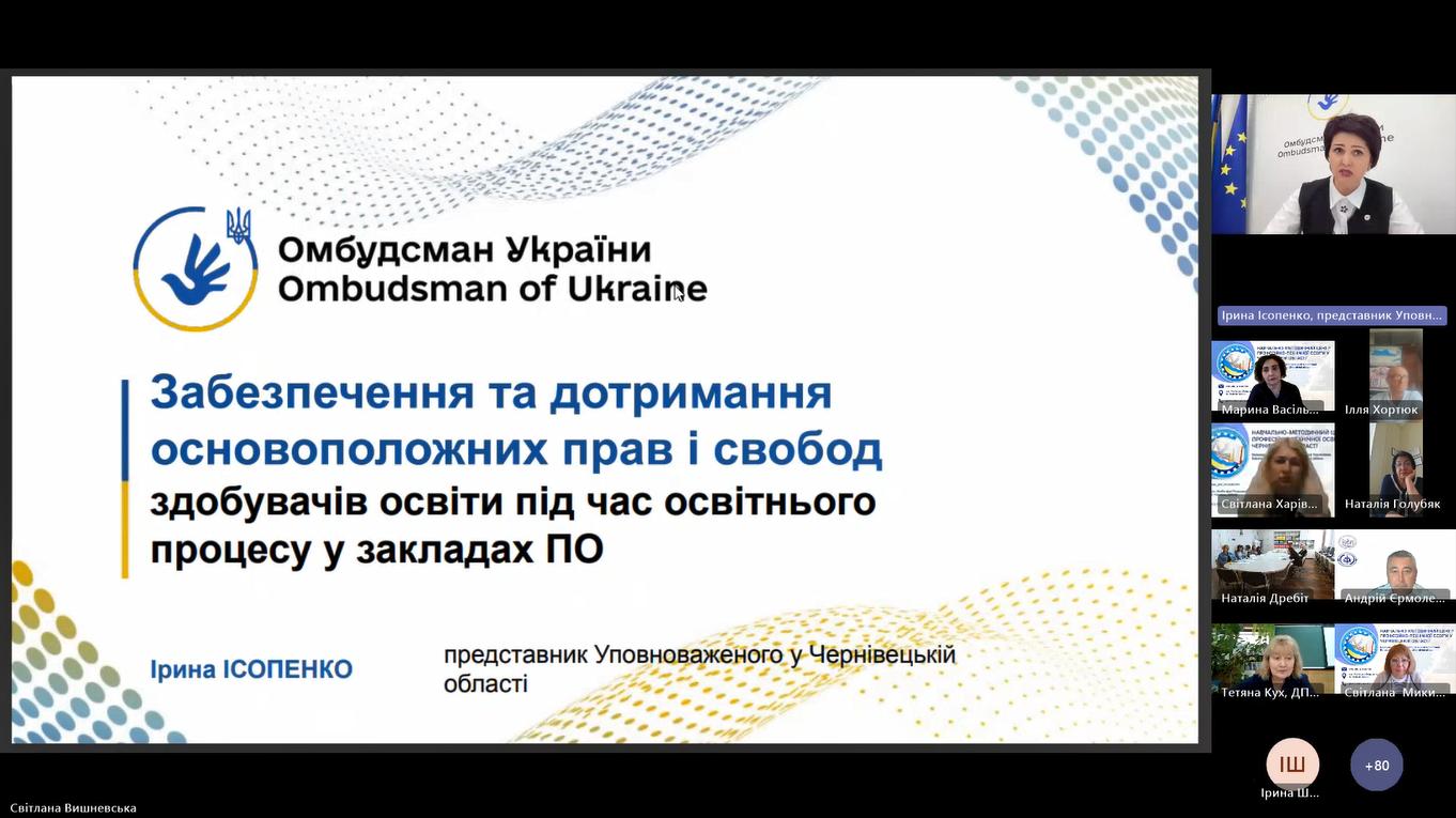Ірина Ісопенко, представник Уповноваженого Верховної Ради України з прав людини у Чернівецькій області, ознайомила присутніх із роботою офісу Омбудсмана України та розповіла про забезпечення основоположних прав і свобод здобувачів освіти під час освітнього процесу у закладах професійно-технічної освіти.