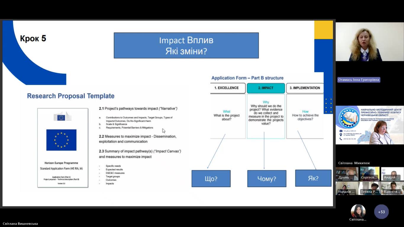 Інна Отамась, доцент кафедри освіти дорослих і цифрових технологій Навчально-наукового інституту менеджменту і психології ДЗВО «Університет менеджменту освіти» НАПН України, кандидат історичних наук, доцент, у своїй доповіді «Проєкти ЄС для розвитку закладів освіти в Україні» розповіла про основні кроки у написанні грантових заявок.