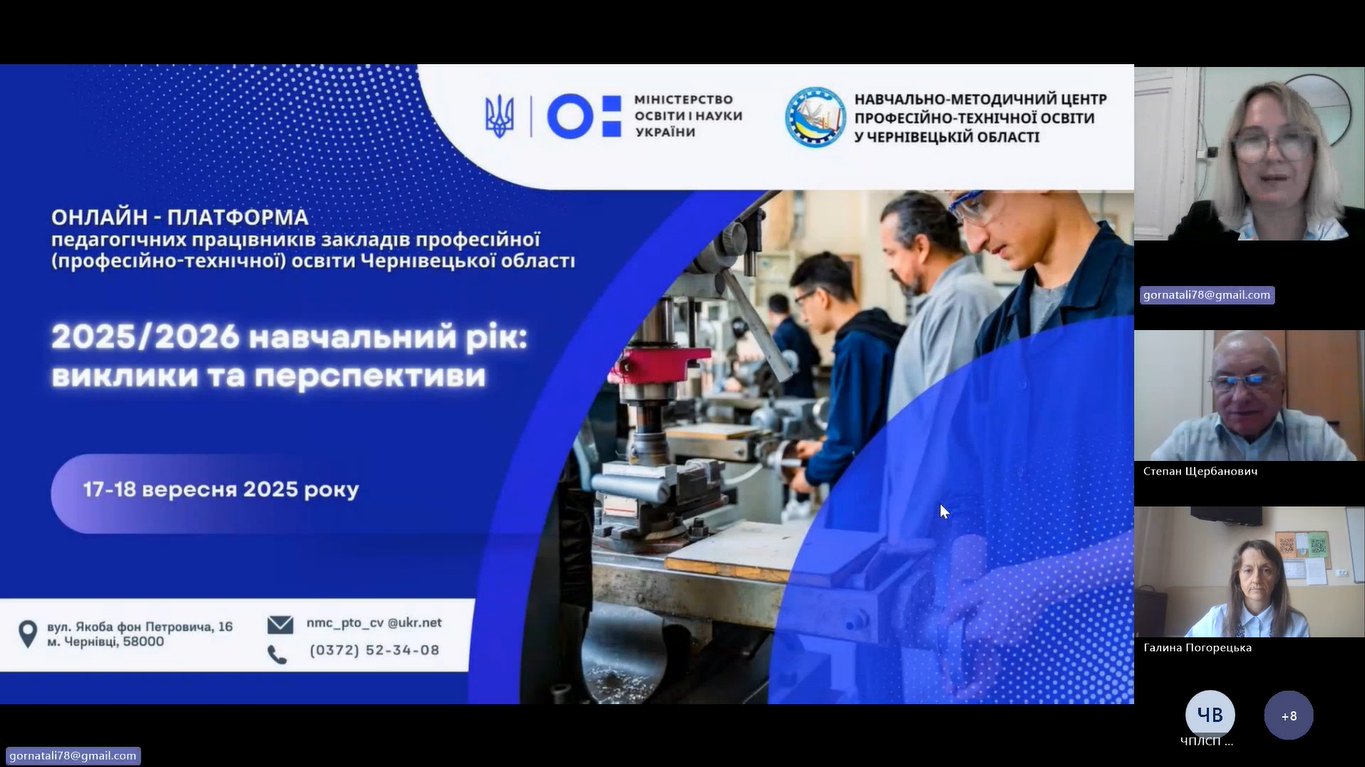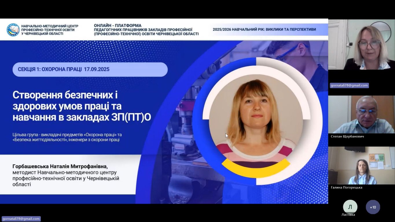 7 вересня 2025 року відповідно до плану роботи Навчально-методичного центру професійно-технічної освіти у Чернівецькій області та в межах роботи Онлайн-платформи відбулося секційне засідання обласного методичного об’єднання викладачів предметів «Охорона праці» та «Безпека життєдіяльності» ЗП(ПТ)О Чернівецької області.