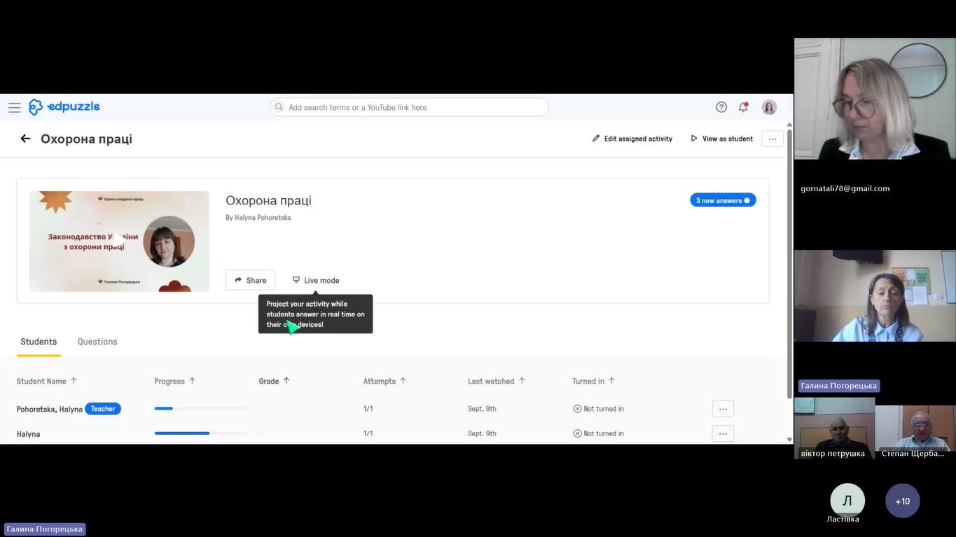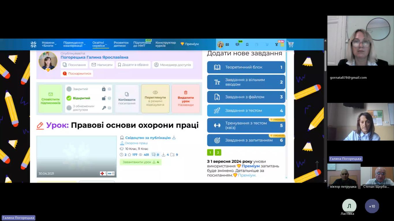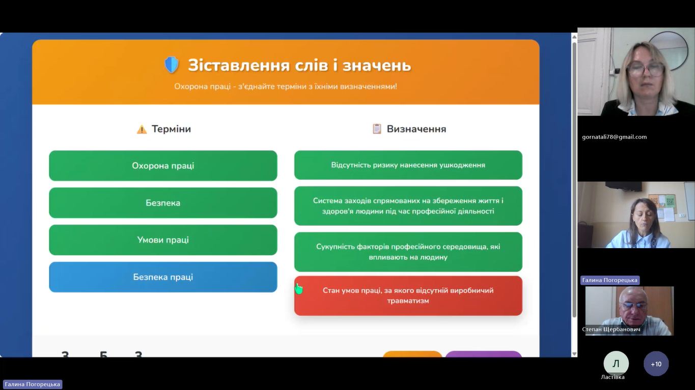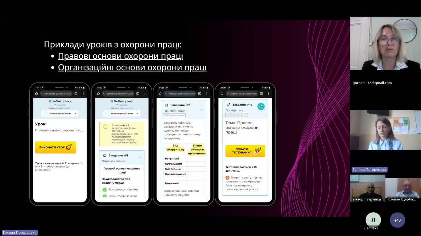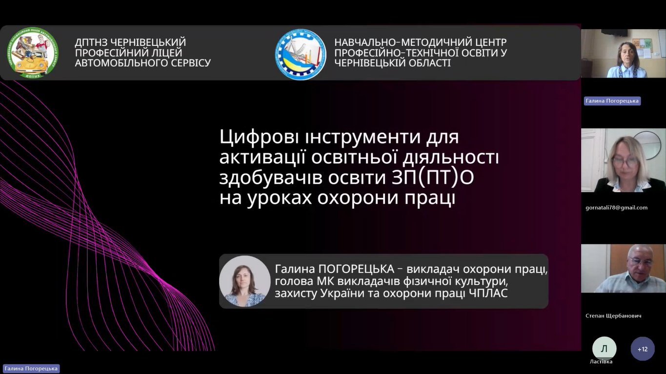 - Галини Погорецької, викладача охорони праці та безпеки життєдіяльності, голови МК викладачів фізичної культури, Захисту України, та охорони праці ДПТНЗ ЧПЛАС, яка поділилась досвідом використання цифрових інструментів для активації пізнавальної діяльності здобувачів освіти на уроках охорони праці.