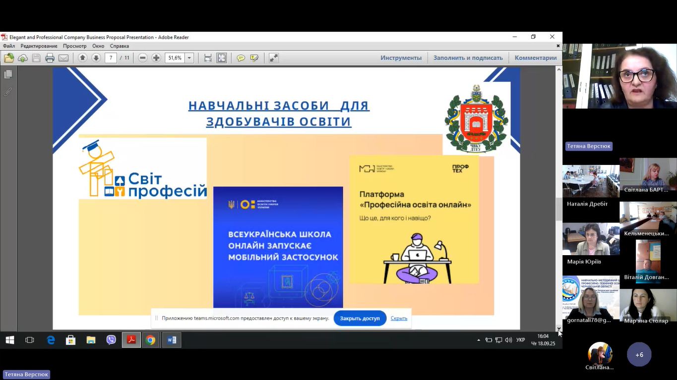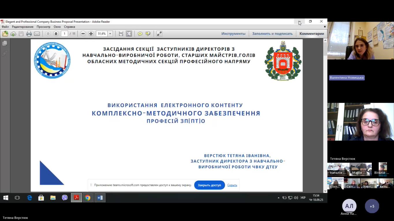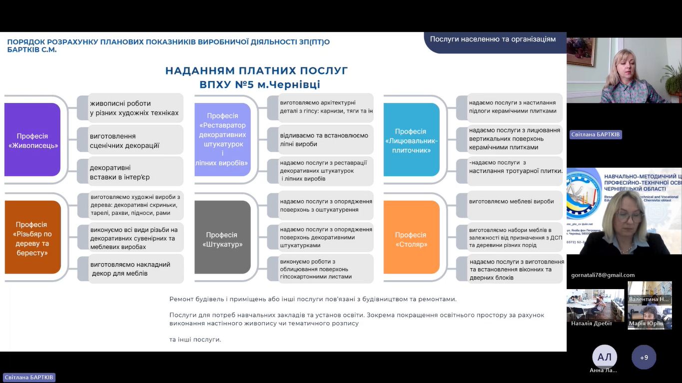 18 вересня 2025 року відповідно до плану роботи Навчально-методичного центру професійно-технічної освіти у Чернівецькій області та в межах роботи Онлайн-платформи відбулася інструктивн-методична нарада для заступників директорів з навчально-виробничої роботи, старших майстрів, голів обласних методичних секцій професійного напряму ЗПО Чернівецької області. Нарада була присвячена завданням на 2025/2026 навчальний рік, зокрема питанням забезпечення якості виробничої діяльності ЗПО та створенню педагогічних умов для формування конкурентоздатних фахівців у закладах професійної освіти.