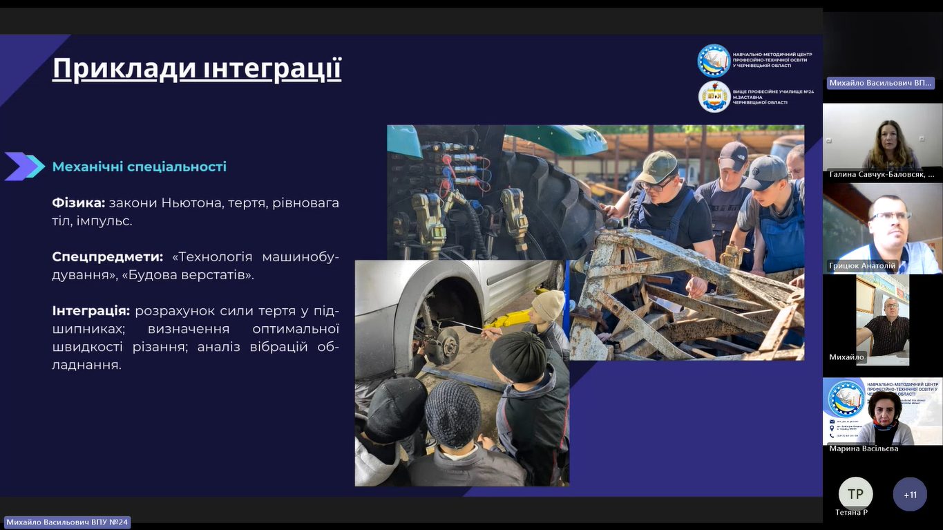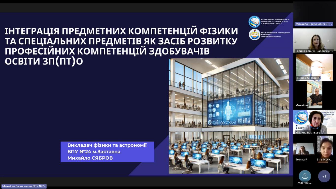 - Михайло СЯБРОВ, викладач фізики та астрономії ВПУ 24 м. Заставна закцентував увагу колег на темі «Інтеграція предметних компетенцій фізики та спецпредметів як засіб розвитку професійних компетенцій здобувачів освіти закладів П(ПТ)О.
