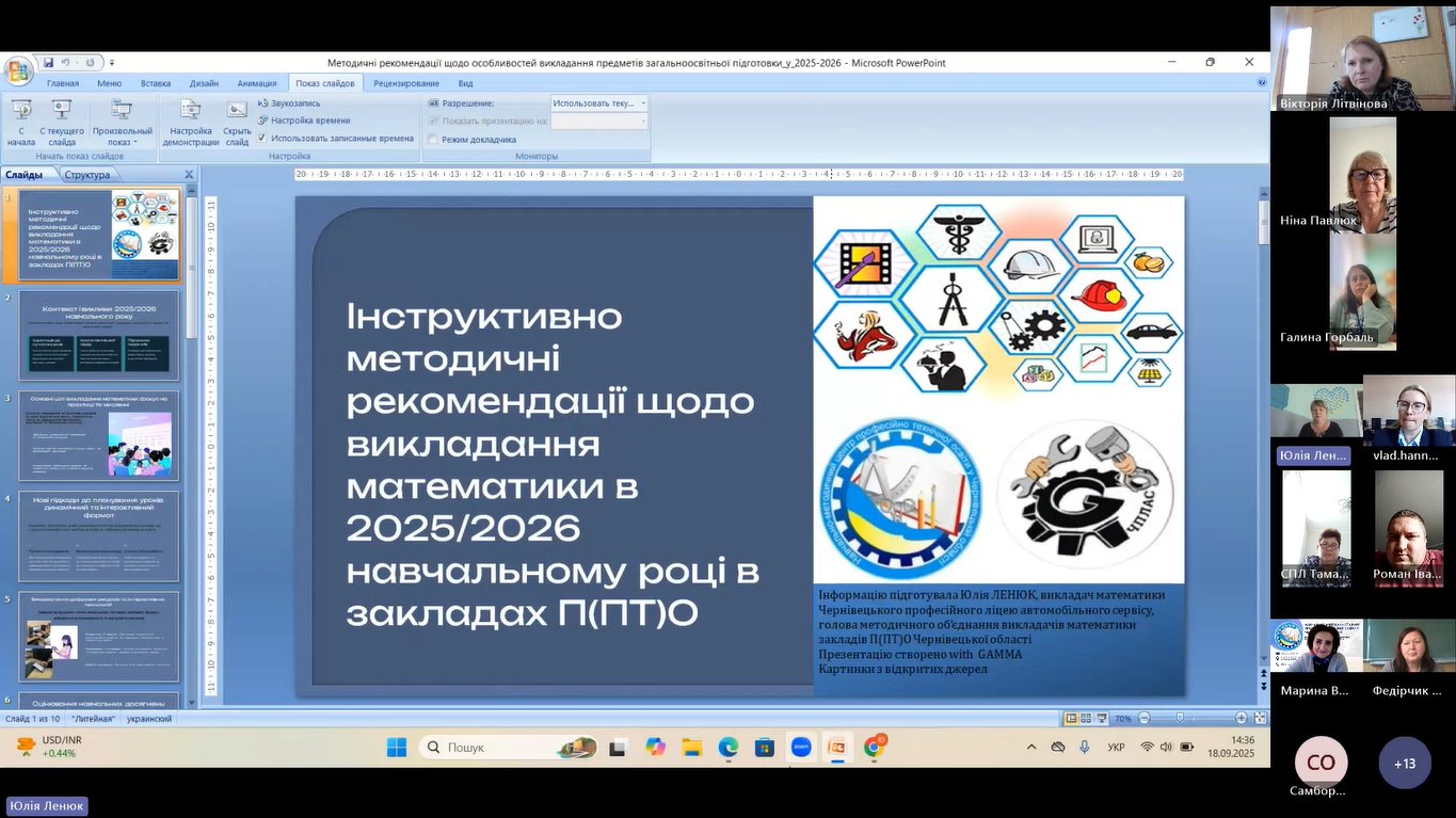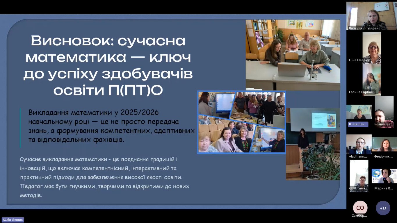 - Юлія ЛЕНЮК, викладач математики ДПТНЗ ЧПЛАС, голова методичної секції викладачів математики ознайомила присутніх з інструктивно – методичними рекомендаціями викладання предмета в 2025/2026 н.р.