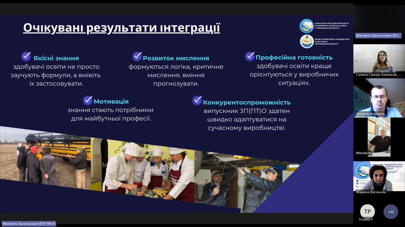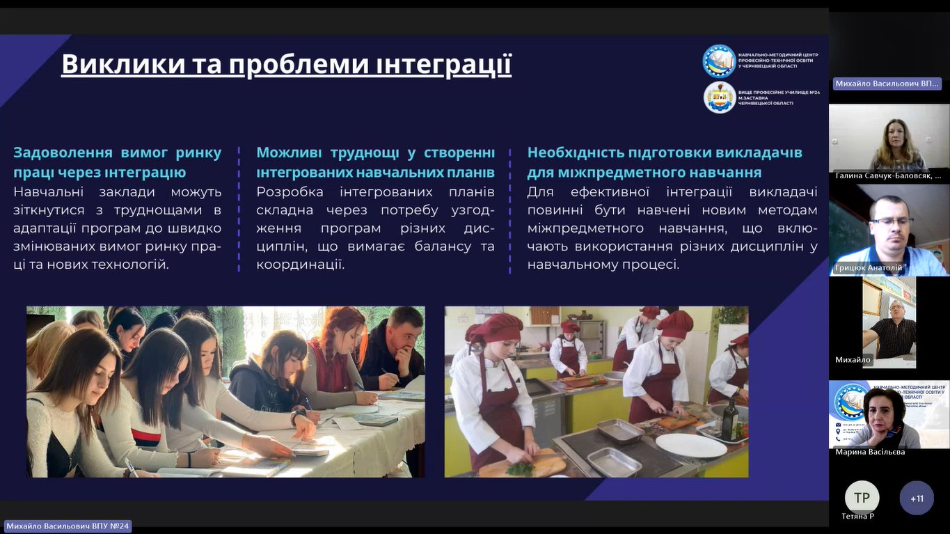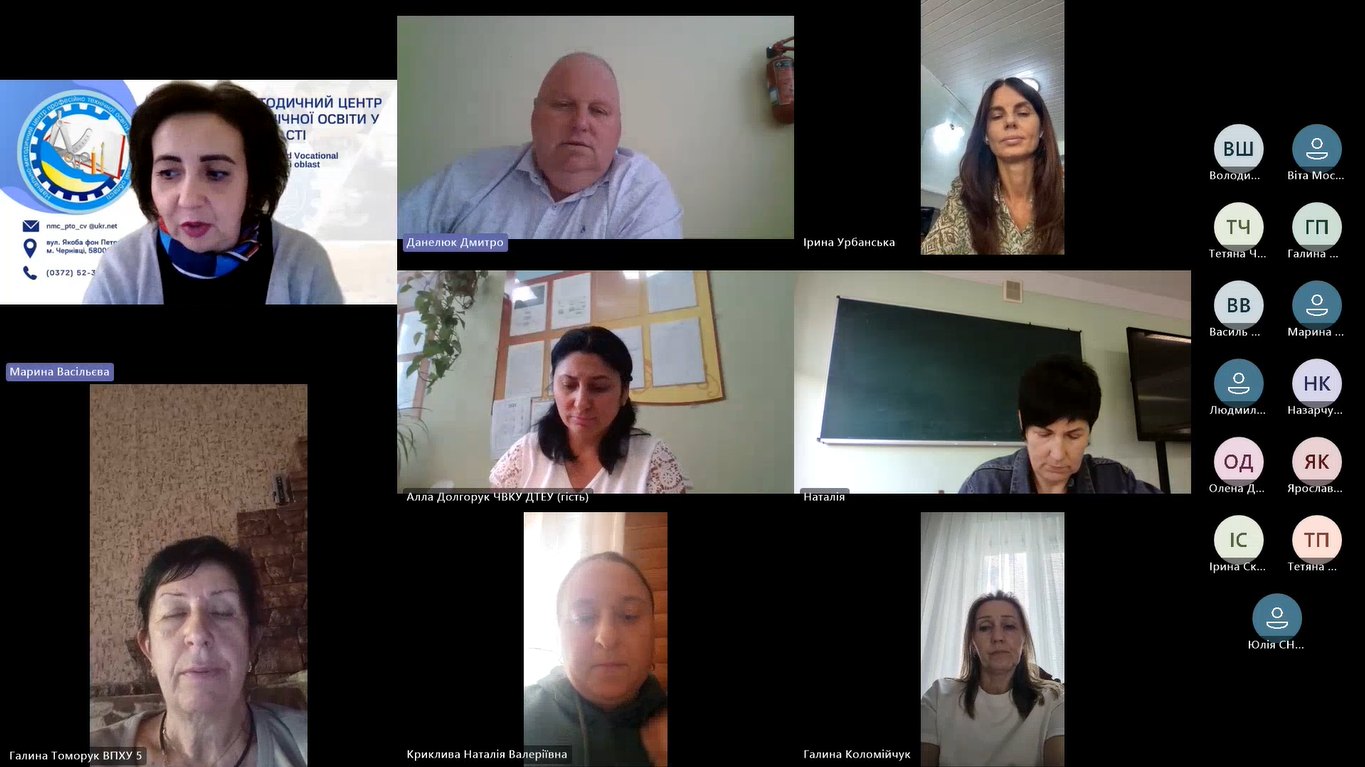Марина ВАСІЛЬЄВА, методист НМЦ ПТО у Чернівецькій області, закцентувала увагу присутніх на дотриманні вимог Державного стандарту загальної середньої освіти у закладах П(ПТ)О області під час викладання загальноосвітніх предметів та розумному поєднанні традиційних та інноваційних форм і методів навчання і активного мислення, моделювання освітнього процесу, самостійного генерування і втілення нових та цікавих ідей та технологій навчання.