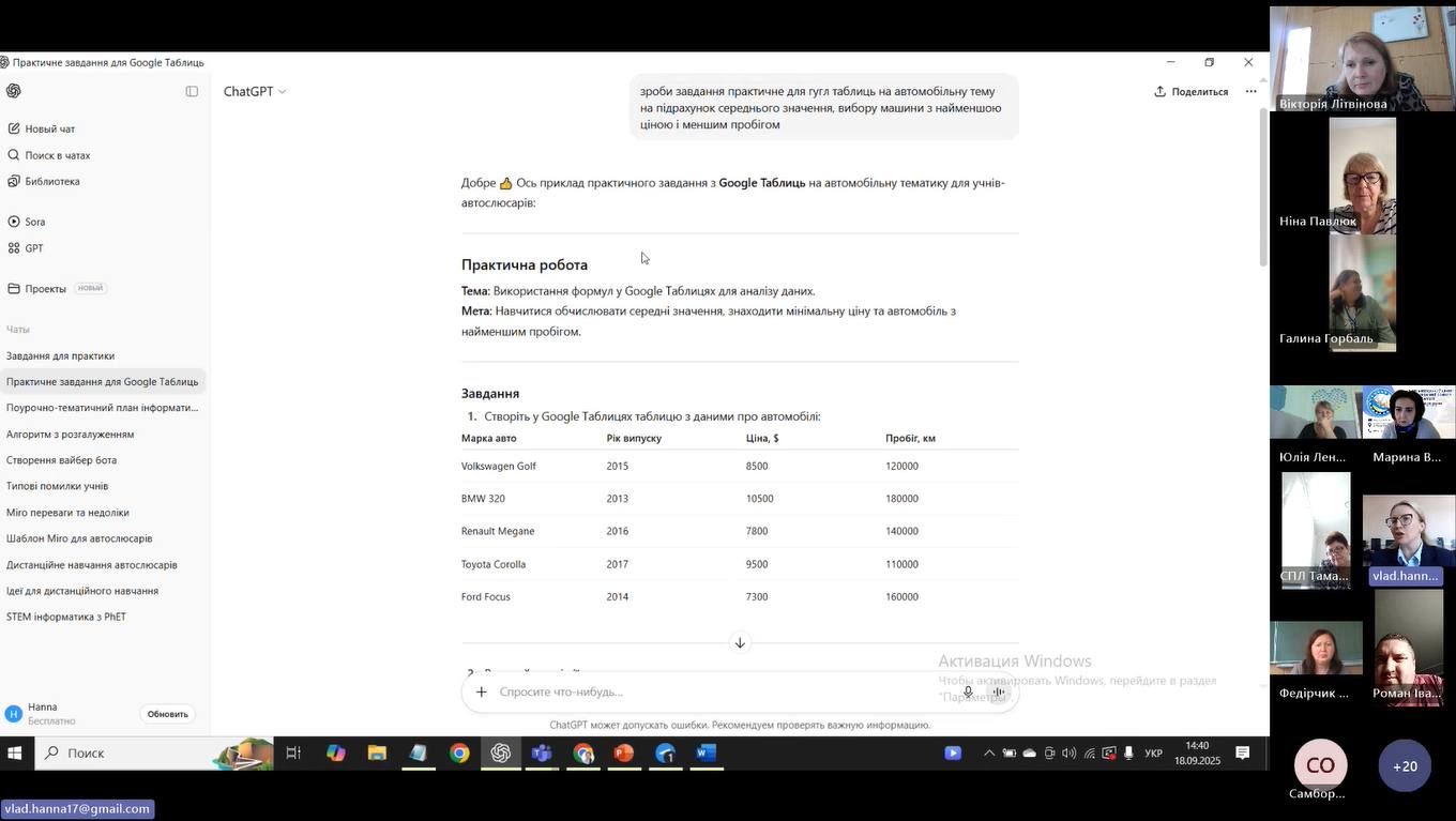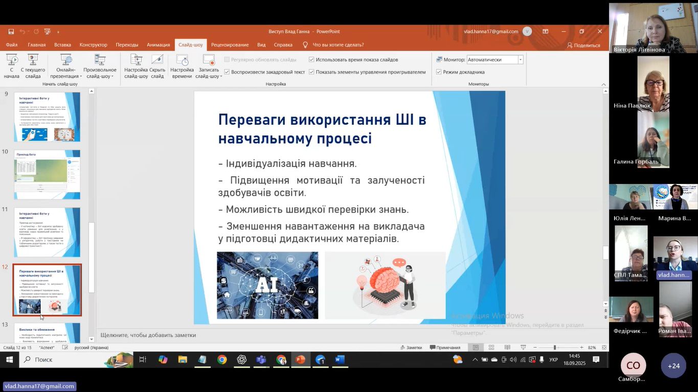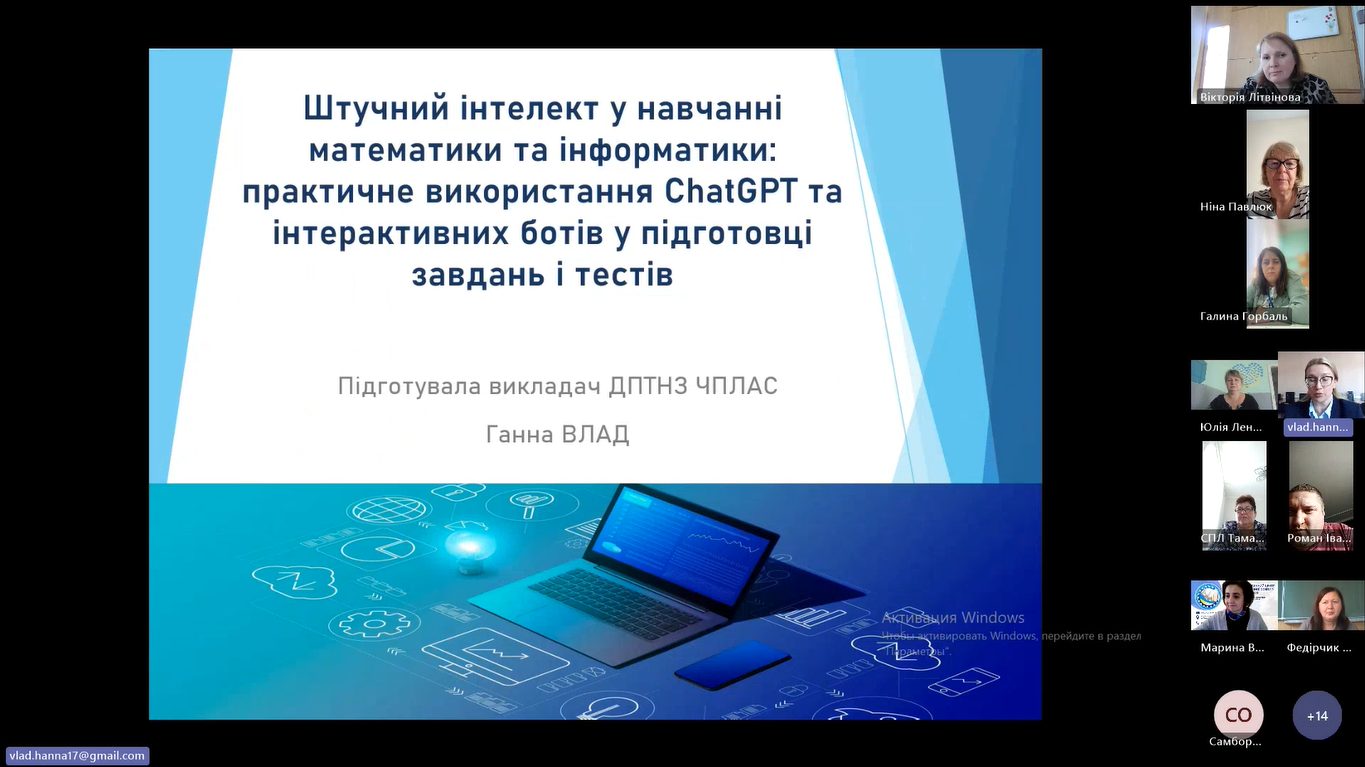 - Ганна ВЛАД, викладач математики та інформатики ДПНТЗ ЧПЛАС, кандидат фізико-математичних наук зосередила увагу колег на темі «Штучний інтелект у навчанні математики та інформатики - практичне використання ChatGPT, інтерактивних ботів у підготовці завдань, тестів, пояснень.