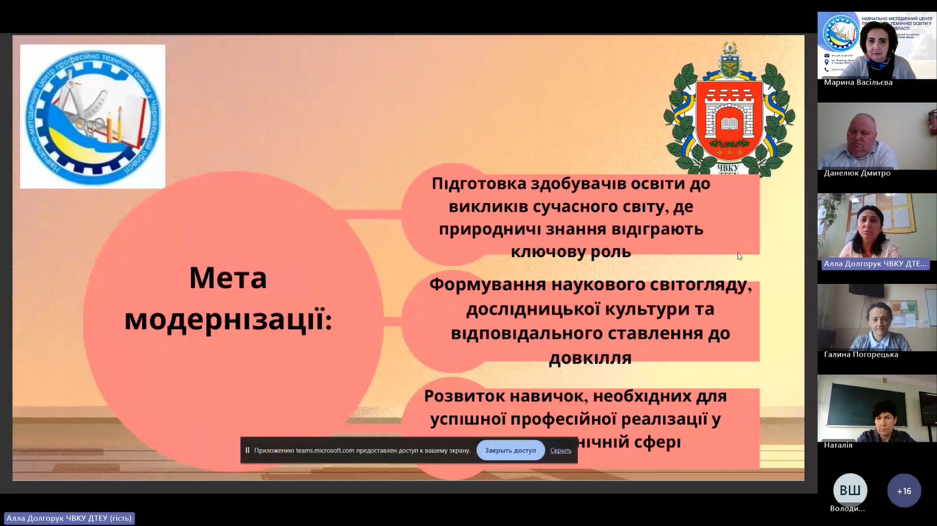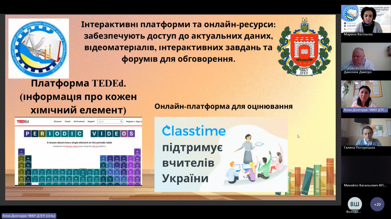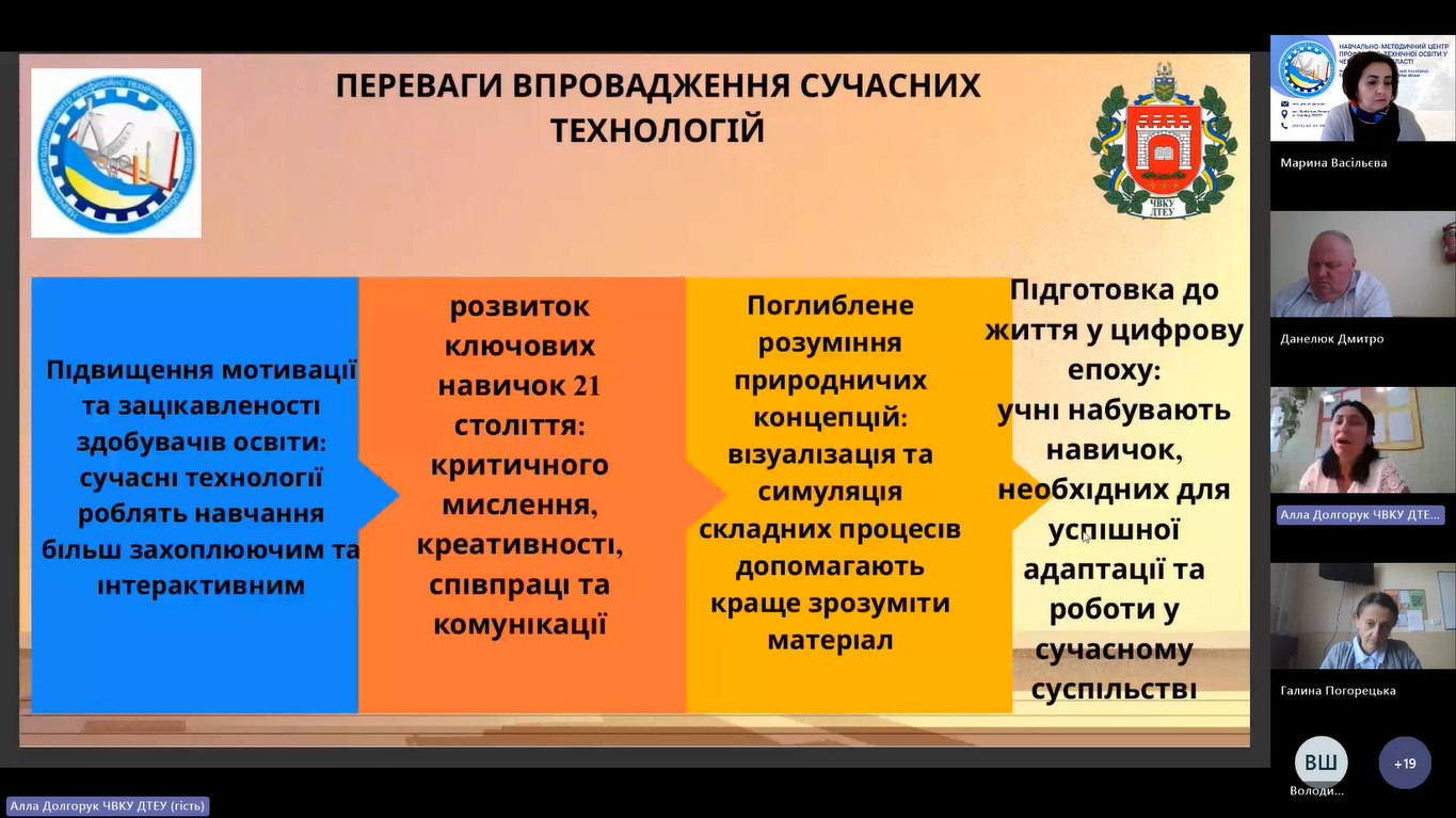 - Алла ДОЛГОРУК, викладач хімії, методист ЧВКУ ДТЕУ розкрила основні аспекти застосування сучасних технологій в темі «Модернізація освітнього процесу шляхом упровадження сучасних освітніх технологій та методик навчання у природничій галузі».