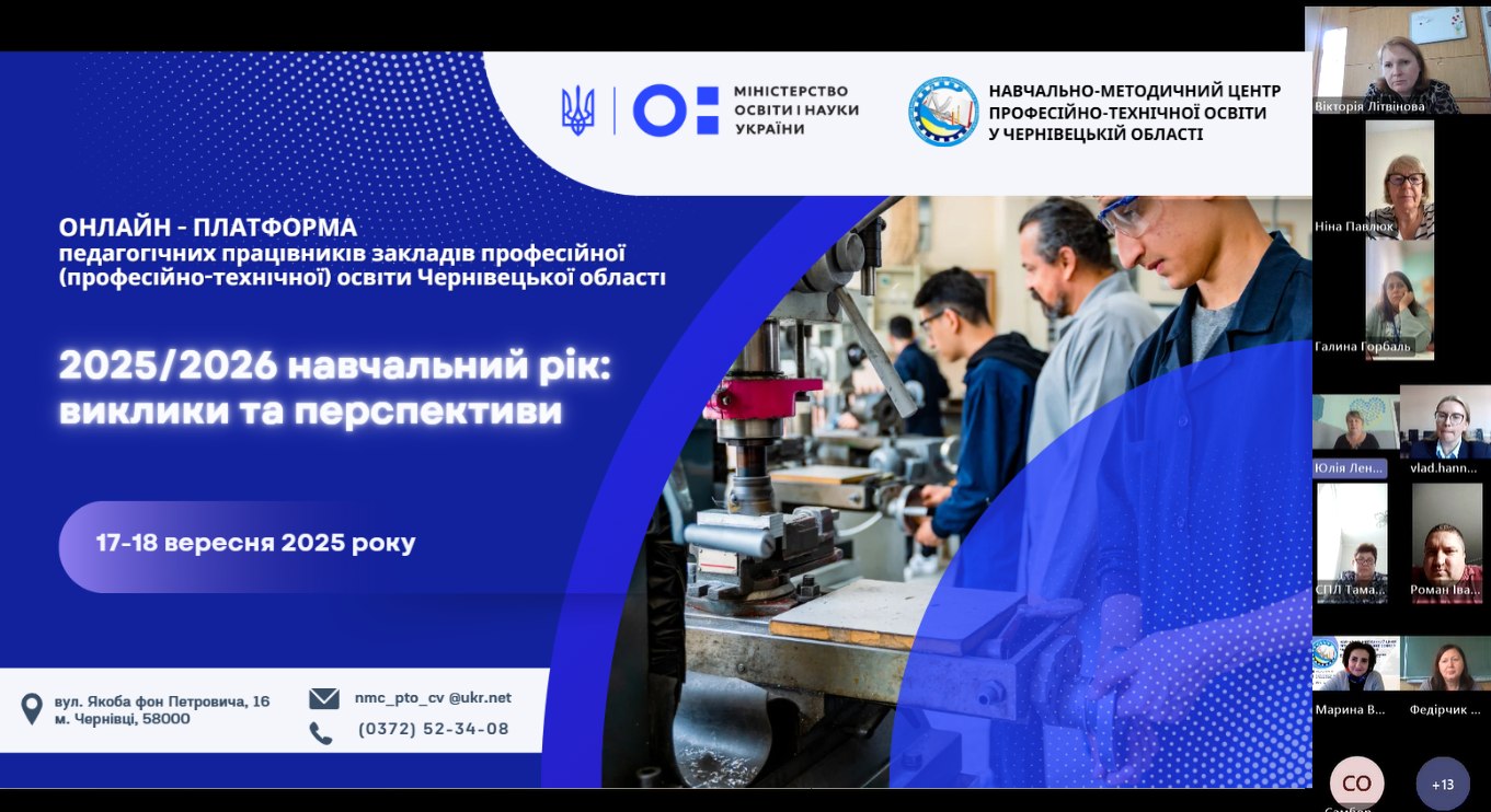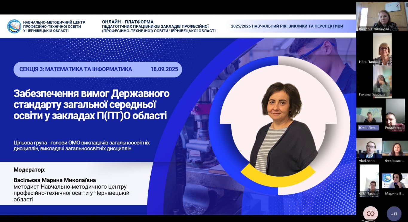 18 вересня 2025 року, відповідно до плану роботи Навчально-методичного центру професійно-технічної освіти у Чернівецькій області на 2025 рік та в межах проведення щорічної Онлайн-платформи педагогічних працівників закладів професійної (професійно-технічної) освіти Чернівецької області, відбулися секційні засідання викладачів загальноосвітніх дисциплін. Тема засідання «Забезпечення вимог Державного стандарту загальної середньої освіти у закладах П(ПТ)О».