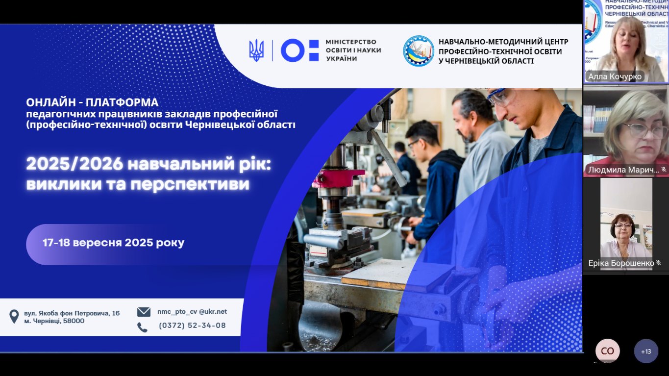 Відповідно до плану роботи Навчально-методичного центру професійно-технічної освіти у Чернівецькій області 18 вересня 2025 року відбулася інструктивно-методична нарада «Забезпечення вимог Державного стандарту загальної середньої освіти у закладах П(ПТ)О області» (секція 7) у рамках онлайн-платформи педагогічних працівників ЗП(ПТ)О Чернівецької області з питань організації освітнього процесу «2025/2026 навчальний рік: виклики та перспективи».