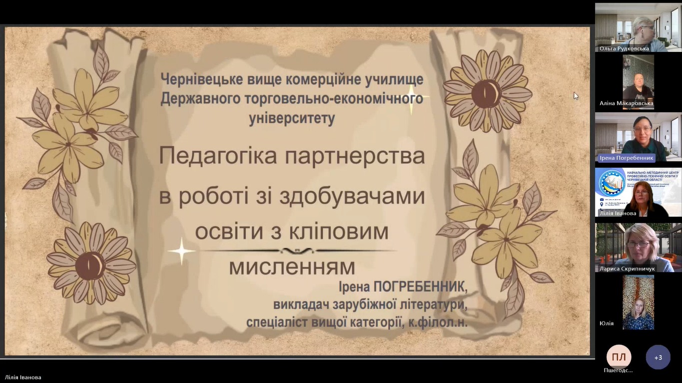 Питання педагогіки партнерства в роботі зі здобувачами освіти з кліповим мисленням висвітлила з досвіду роботи Ірена Любомирівна (викладач ЧВКУ ДТЕУ).