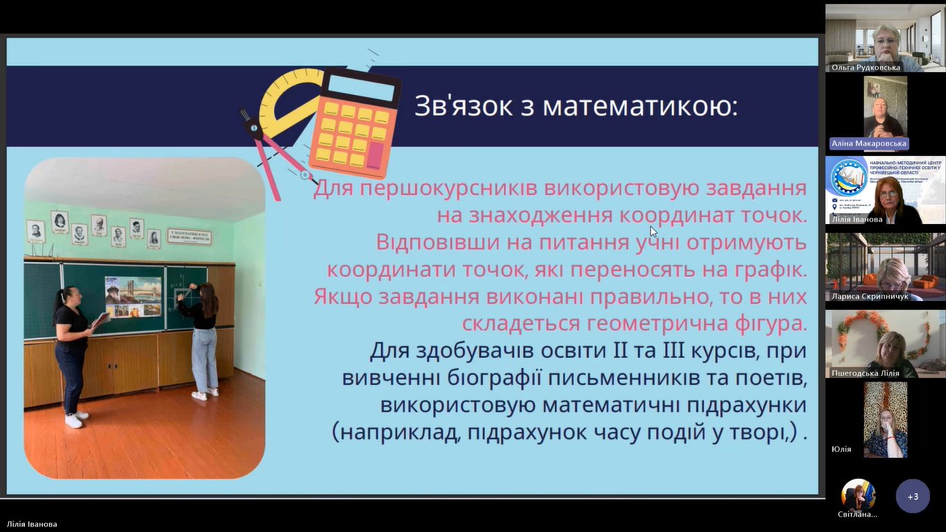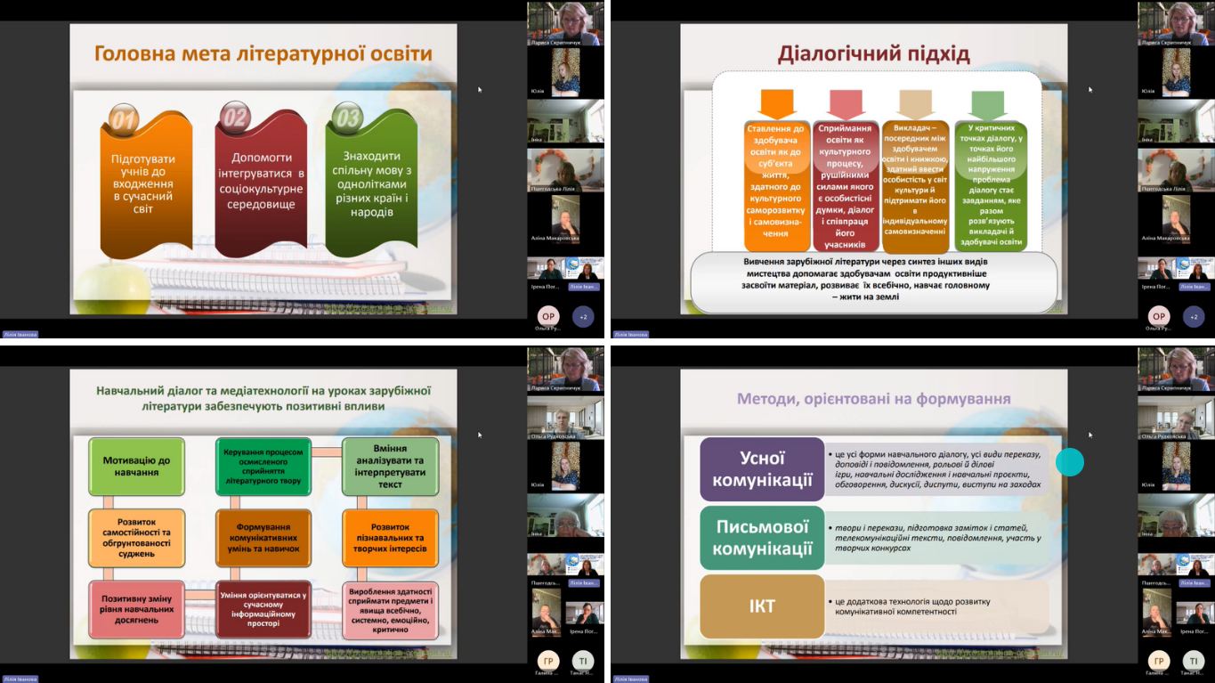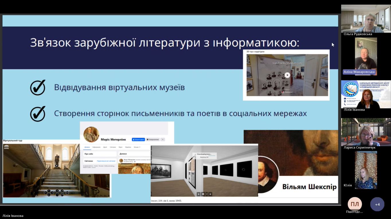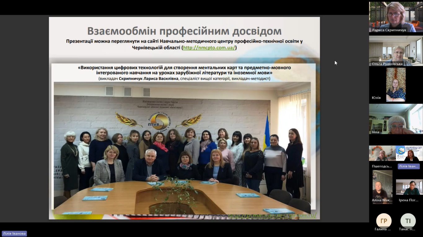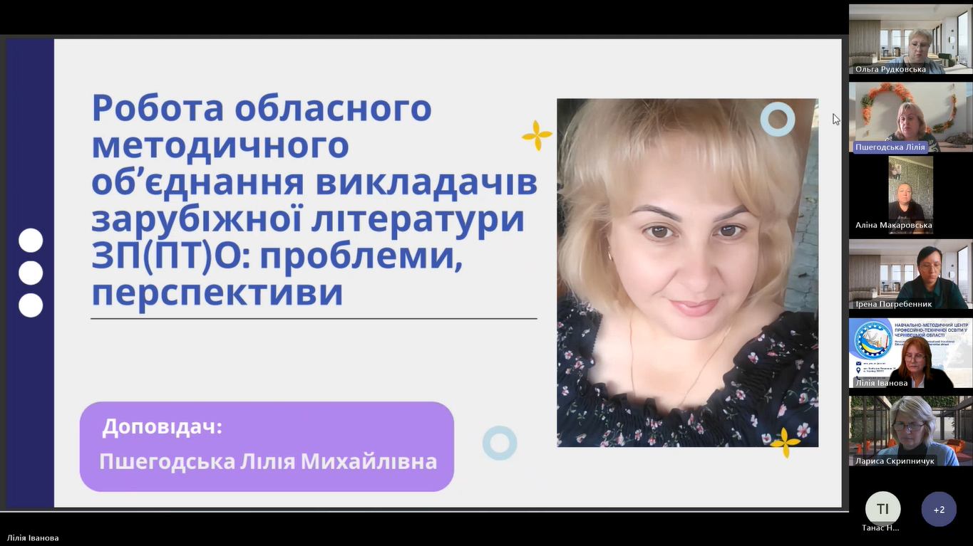 Лілія Пшегодська (викладач ВПУ № 24 м. Заставна), керівник обласного методичного об’єднання викладачів зарубіжної літератури ЗП(ПТ)О окреслила проблеми, перспективи та досягнення викладачів методичного об’єднання, наповнення блогу матеріалами та презентаціями.